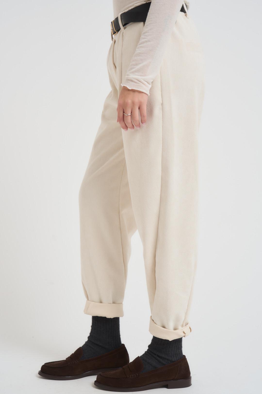SUSY MIX Pantalone donna regular in velluto panna. Modello con due tasche a filetto, passanti ed elastico in vita . Cintura removibile in similpelle. Composizione: 87% poliestere 10% nylon 3% elastan. La modella è alta 176 cm e indossa la taglia S.