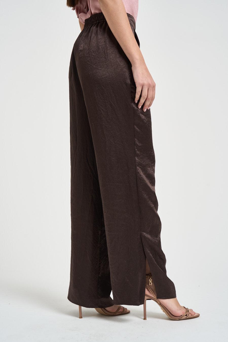 LIU JO Pantalone donna satinato marrone. Modello a palazzo in raso effetto stropicciato con elastico e coulisse in vita, comode tasche. Gamba ampia con spacchetto sul fondo. Composizione: 100% Acetato. La modella è alta 176cm e indossa la taglia 40.