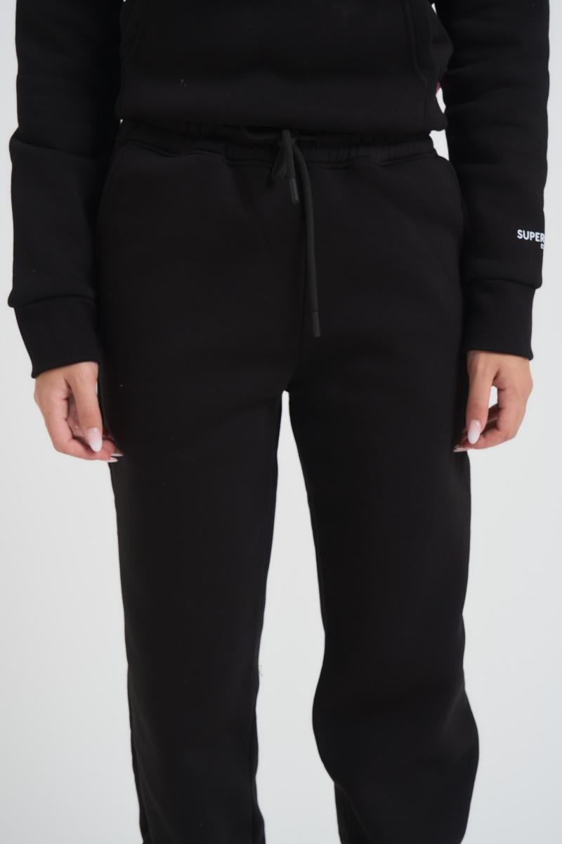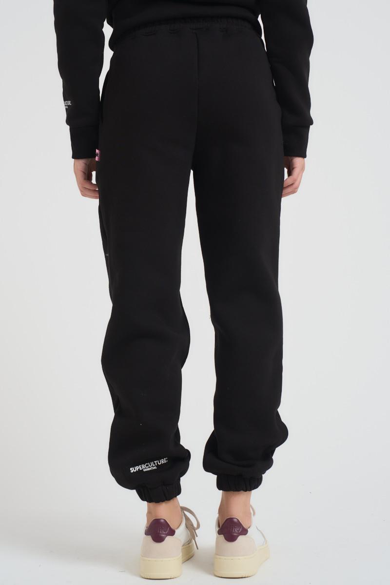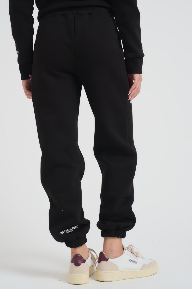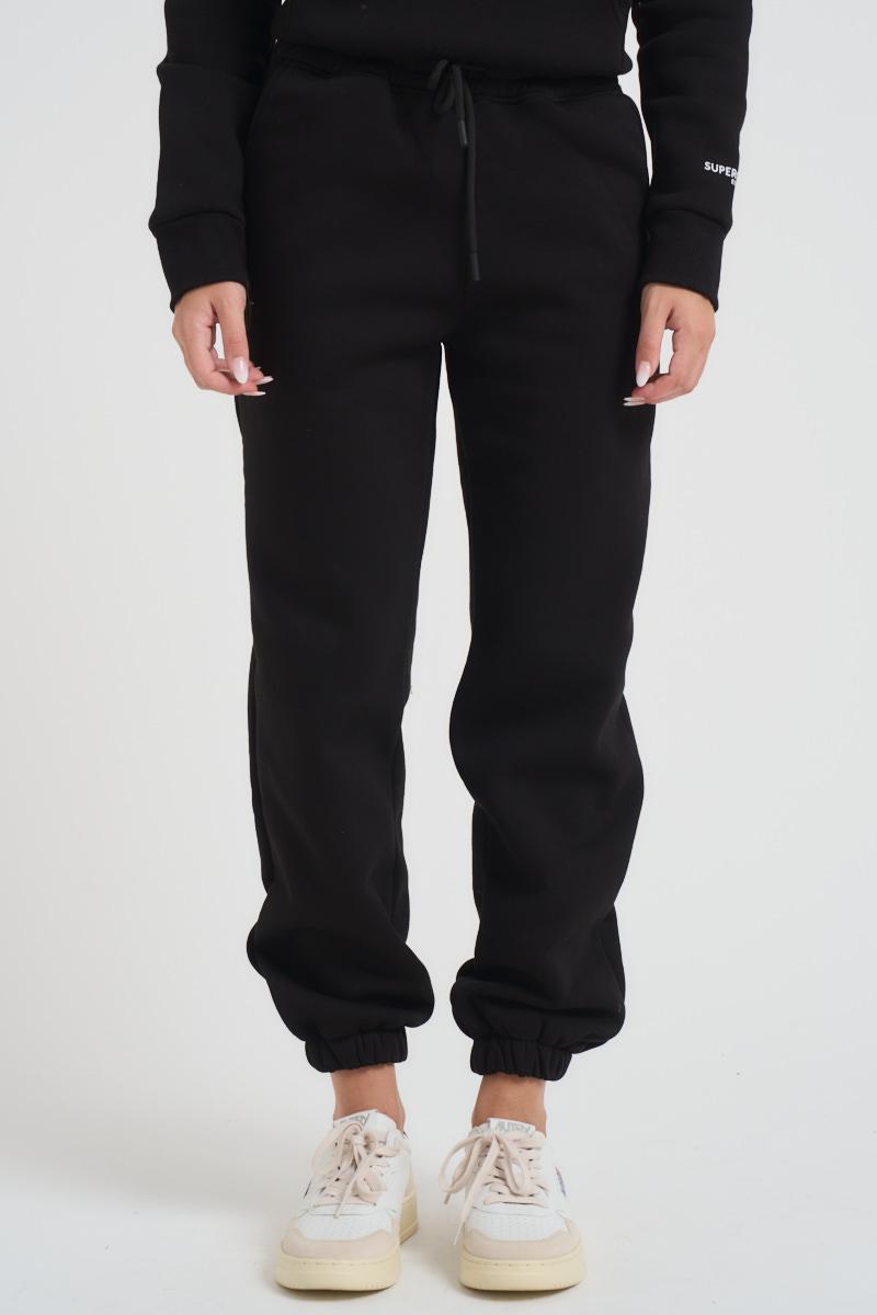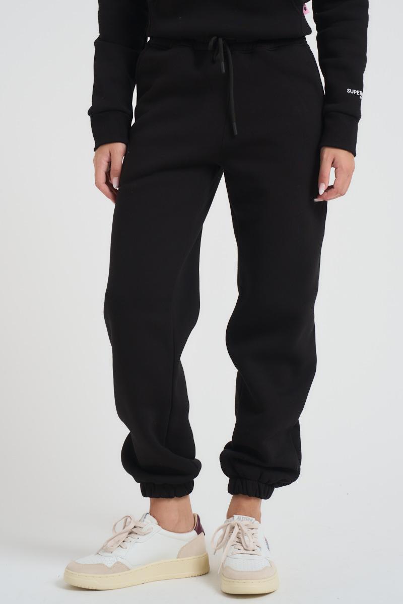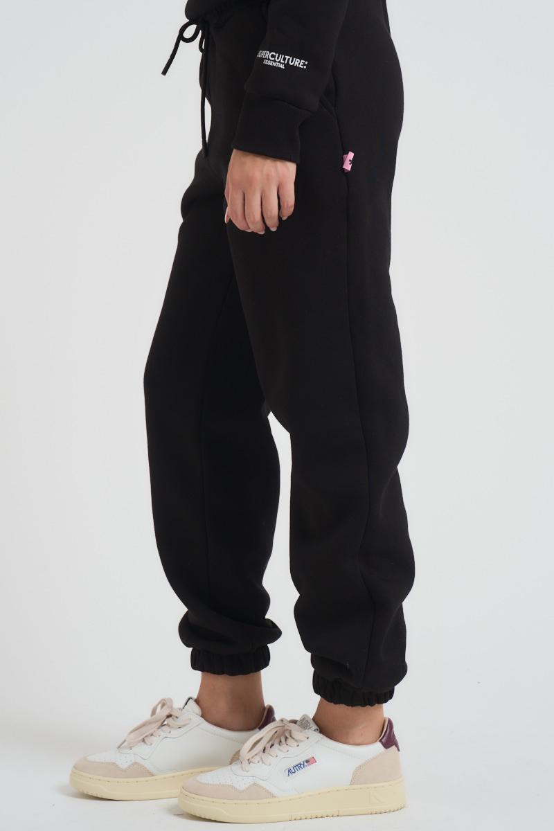 SUPERCULTURE Pantalone tuta jogger donna nero. Modello con elastico in vita e sul fondo. Tasche filetto laterali. Vestibilità regular. Composizione: 65% cotone organico 35% Poliestere. La modella è alta 172 cm e indossa la tg S.
