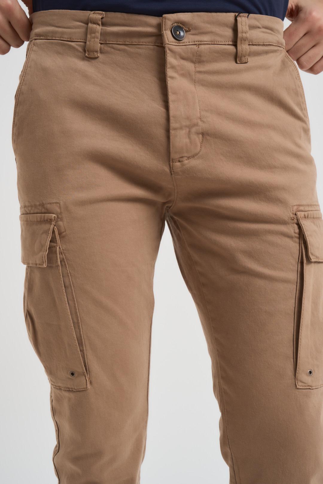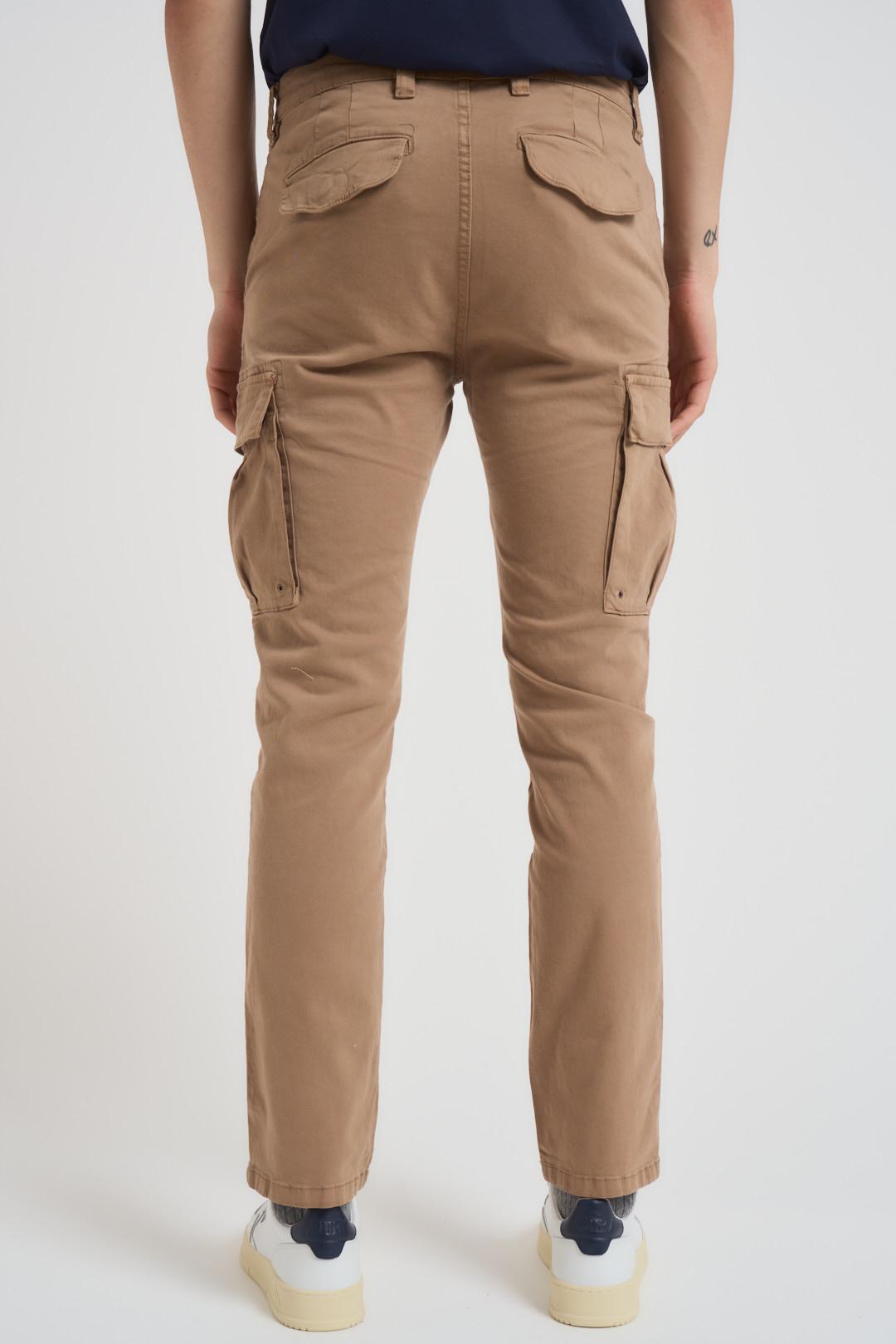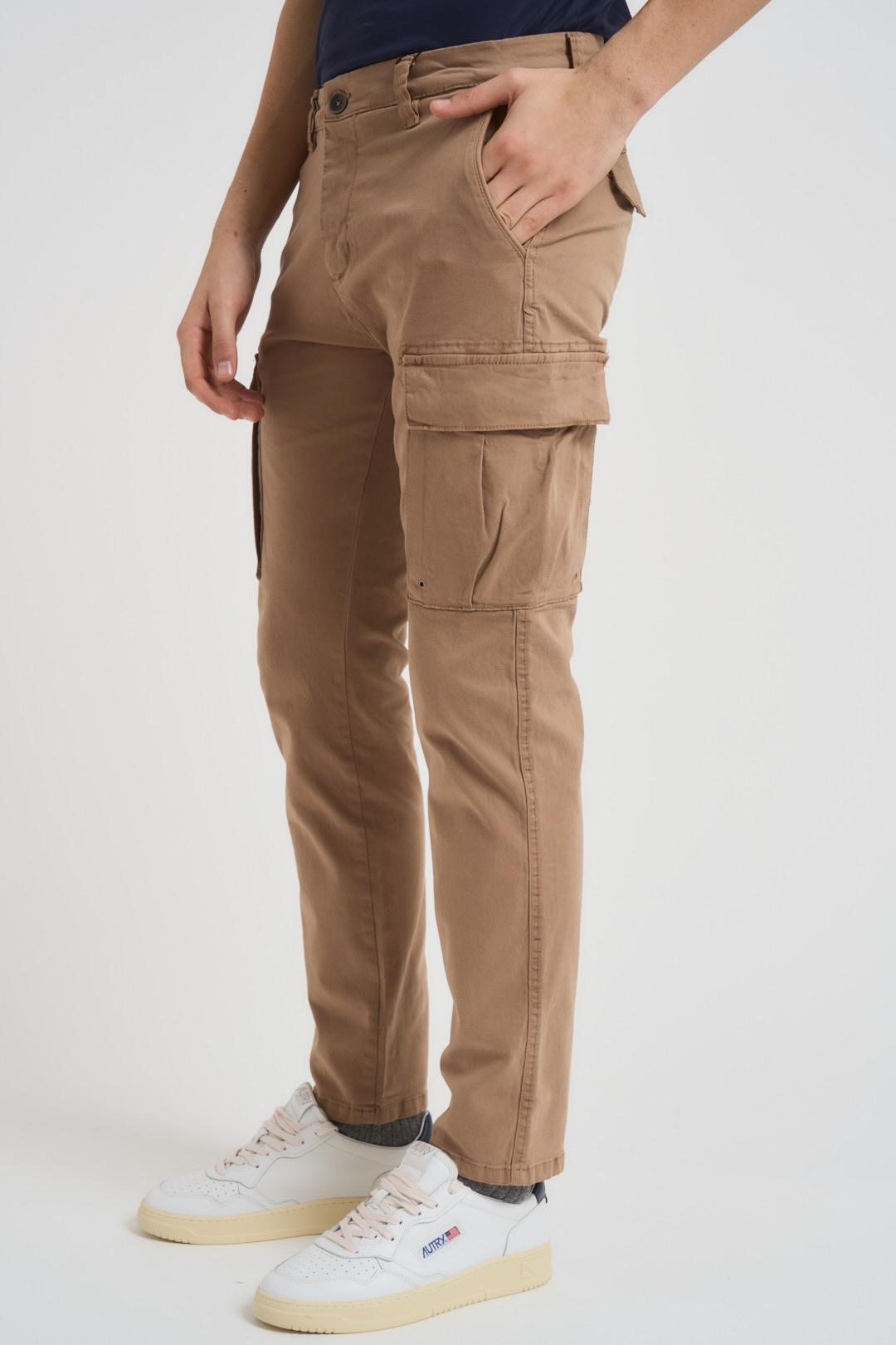 MAIN DELUXE Pantalone uomo cargo cammello. Modello con due tasche laterali con patta, passanti in vita e chiusura con zip e bottone. Composizione: cotone. Il modello è alto 190cm e indossa la taglia 34.
