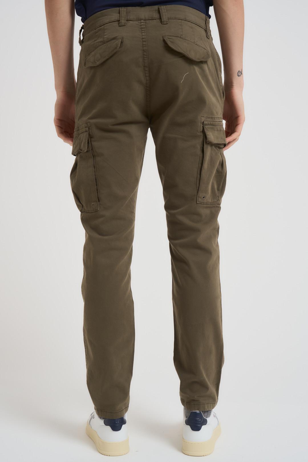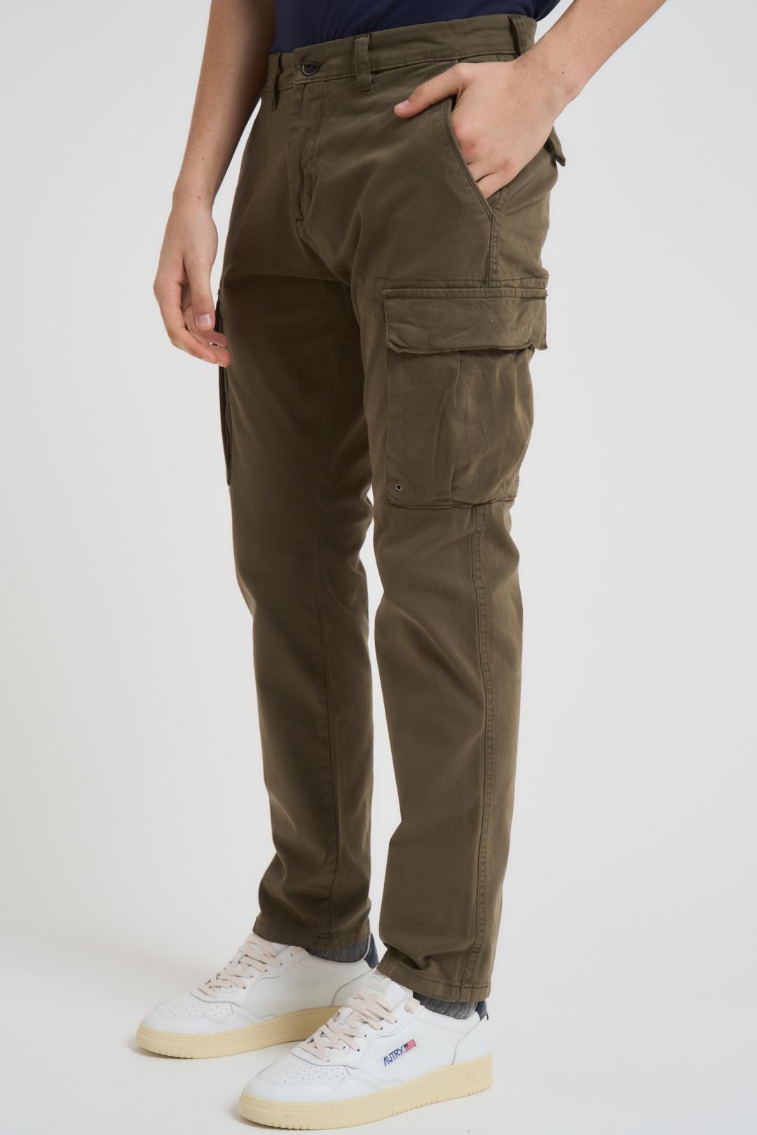 MAIN DELUXE Pantalone uomo cargo verde militare. Modello con due tasche laterali con patta, passanti in vita e chiusura con zip e bottone. Composizione: cotone. Il modello è alto 190cm e indossa la taglia 34.