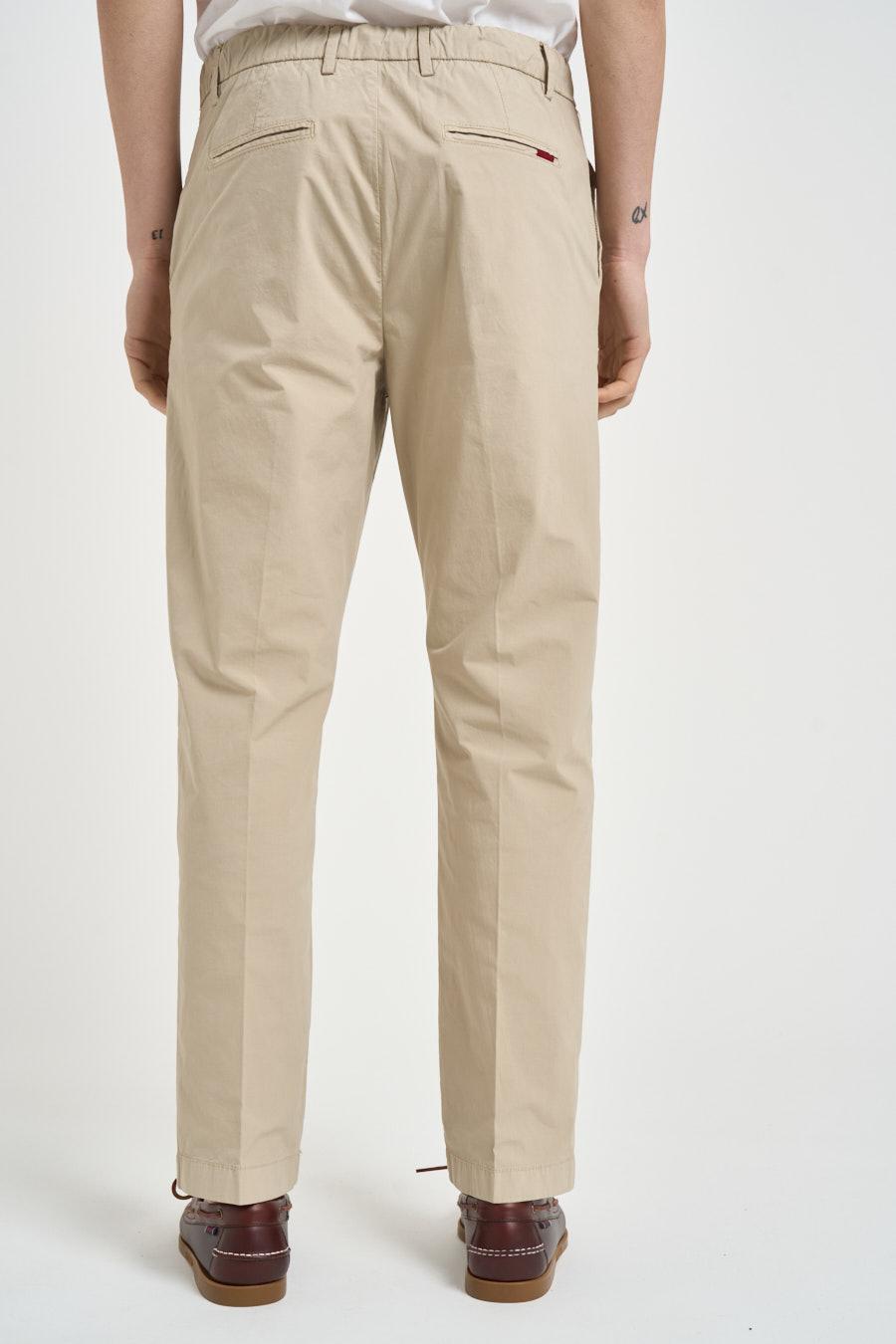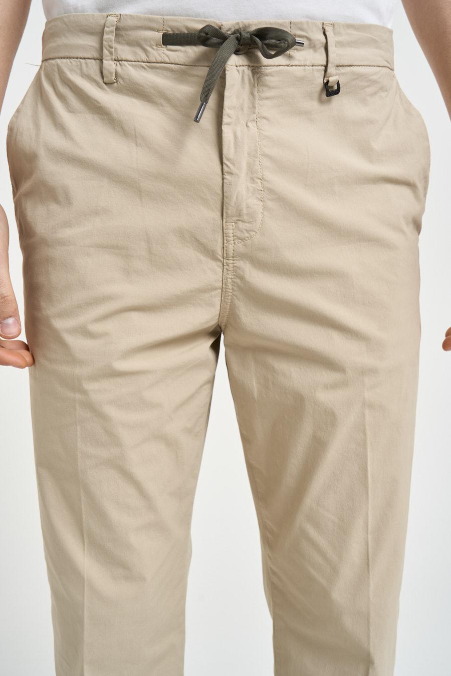 LIU JO Pantalone uomo chino beige. Modello in raso di cotone a vita media con coulisse regolabile e due tasche a filetto laterali e sul retro. Passanti in vita e chiusura con bottone. Composizione: 98% cotone, 2% elastan. Il modello è alto 190 cm e indossa la taglia 50.
