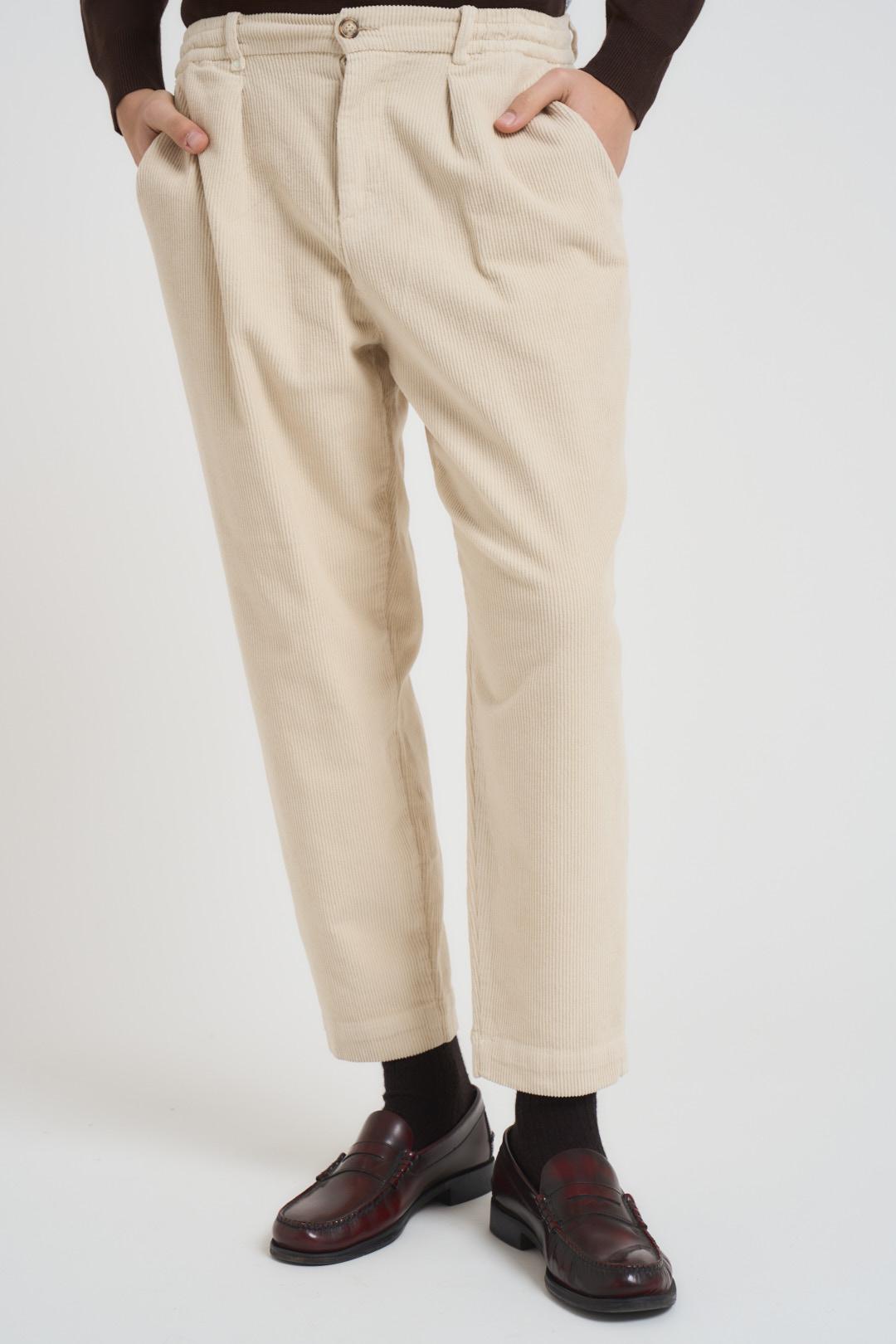 BL11 Pantalone uomo chino panna. Modello con pinces. Chiusura frontale con zip e bottone. Passanti in vita. Tasche oblique lateralmente. Tasche a filetto posteriormente. Composizione: 97% Cotone, 3% Elastan. Il modello è alto 190 cm e indossa la taglia 50.