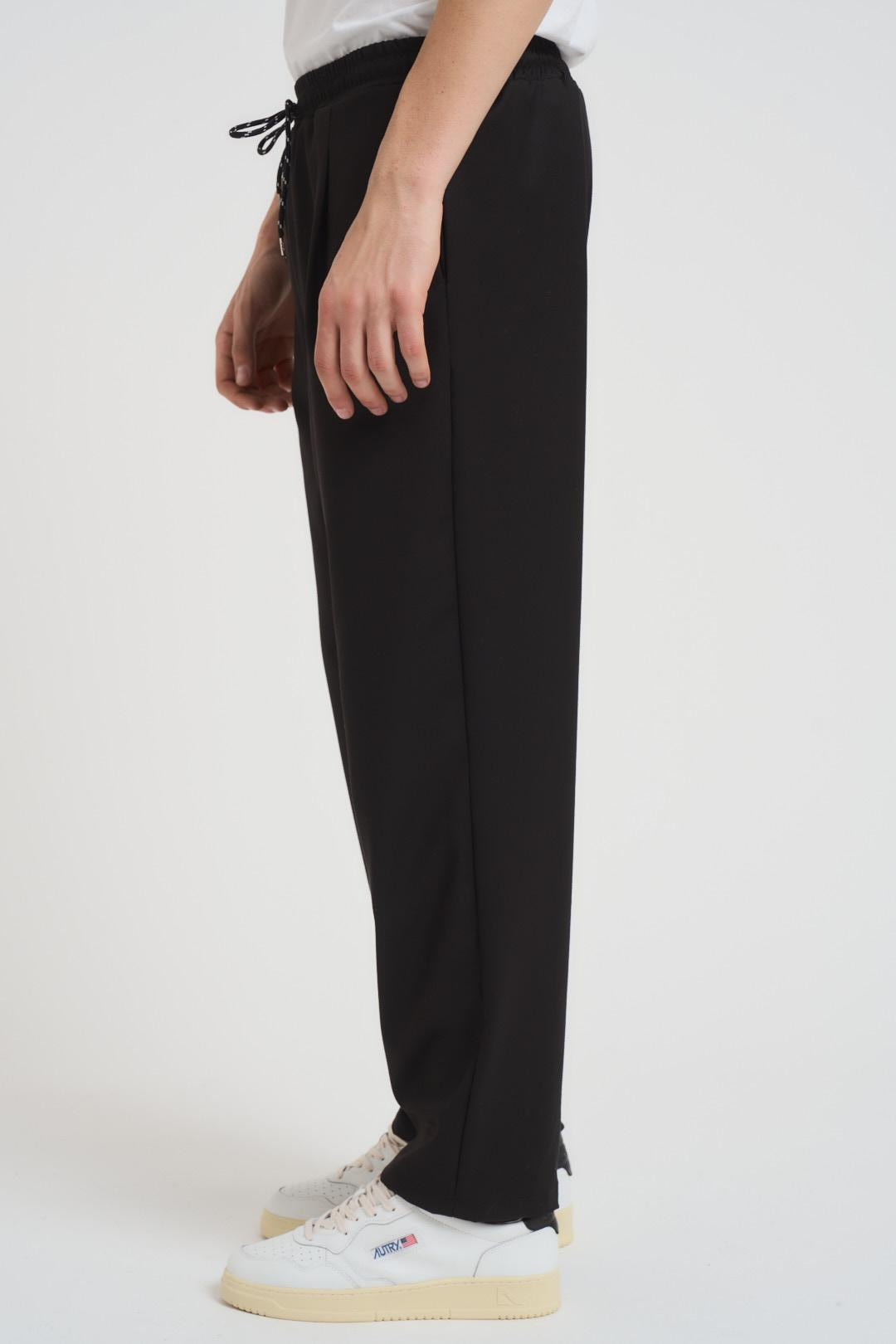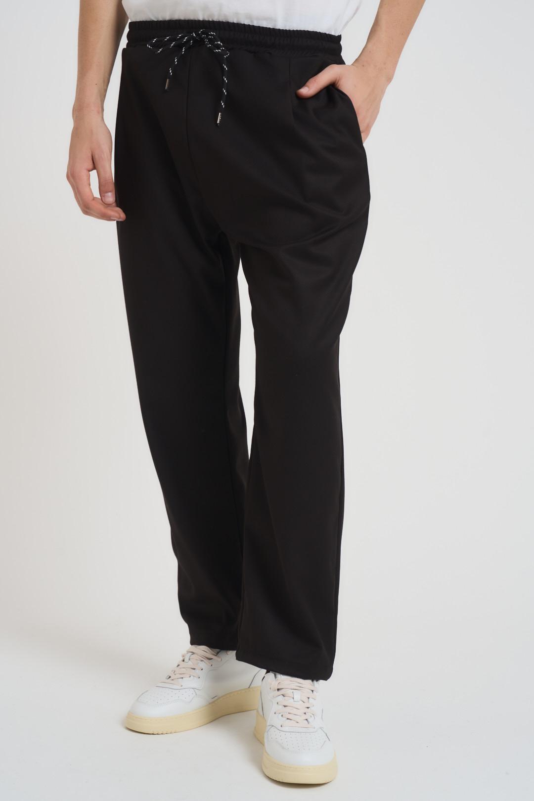 MAIN DELUXE Pantalone uomo con elastico nero. Modello con elastico in vita e coulisse, due tasche a filetto, lunghezza alla caviglia con risvolto. Composizione: misto poliestere. Il modello è alto 190cm e indossa la taglia L.