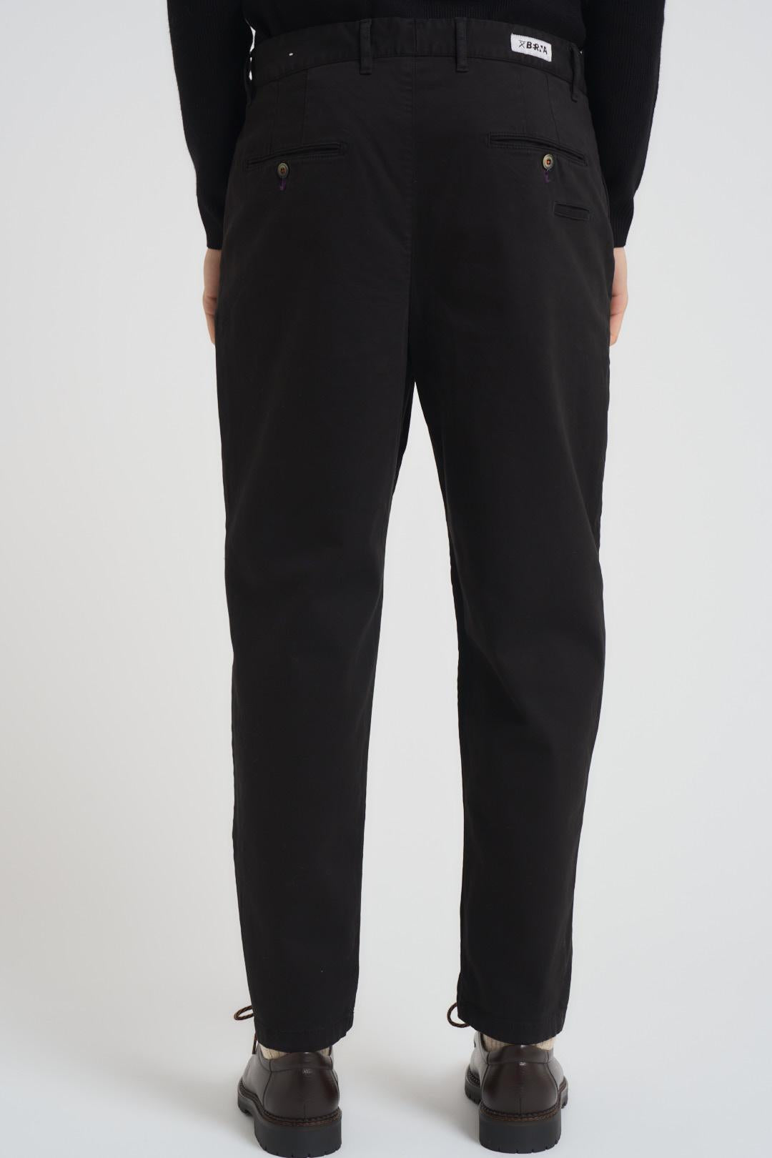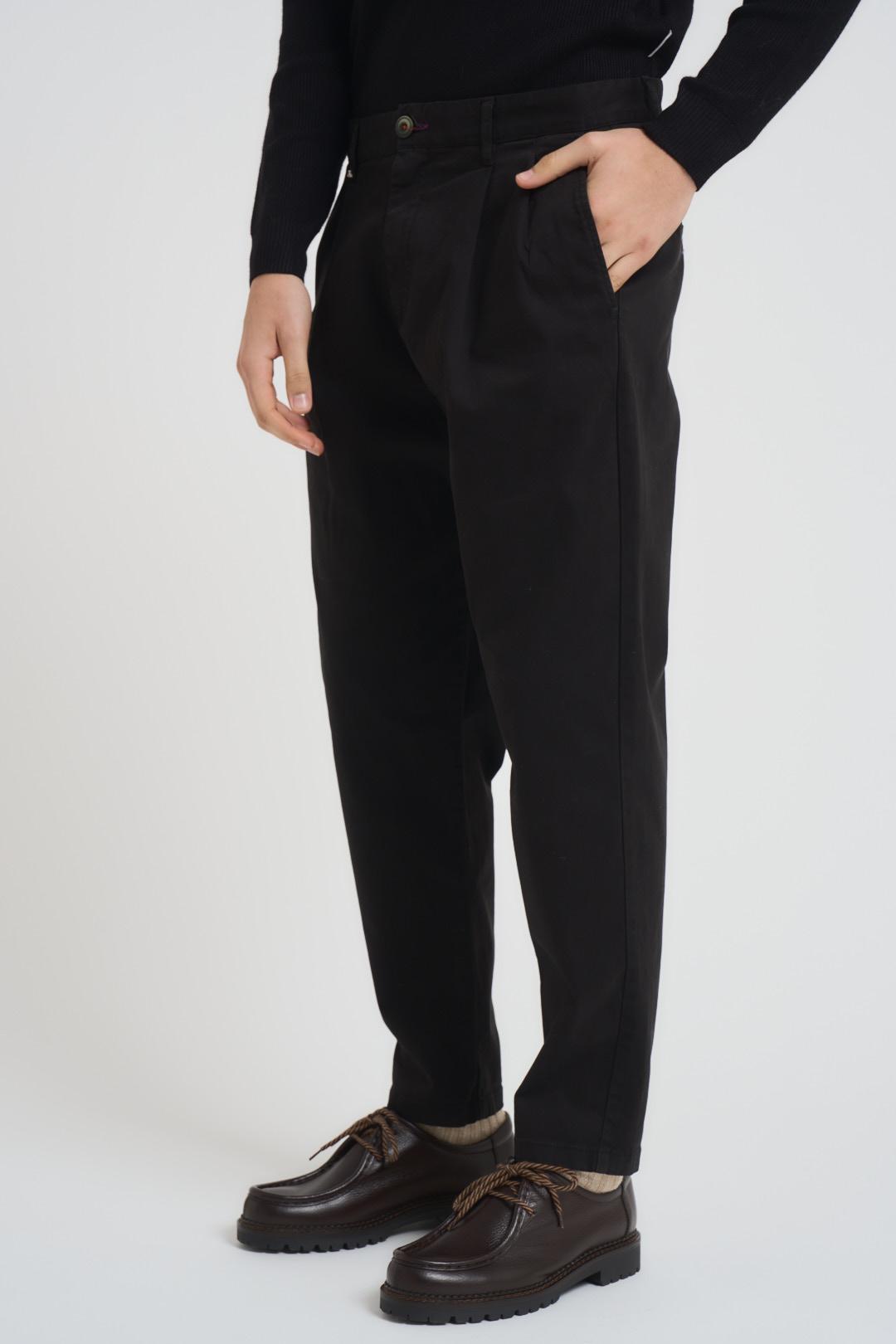 BERNA Pantalone uomo con pinces nero.Modello con tasche americane sul fronte ed a filetto nel retro, etichetta logo in vita. Chiusura centrale con bottone decorato e zip nascosta. Composizione: 97% Cotone 3% Elastane. Il modello è alto 190cm e indossa la taglia 48.