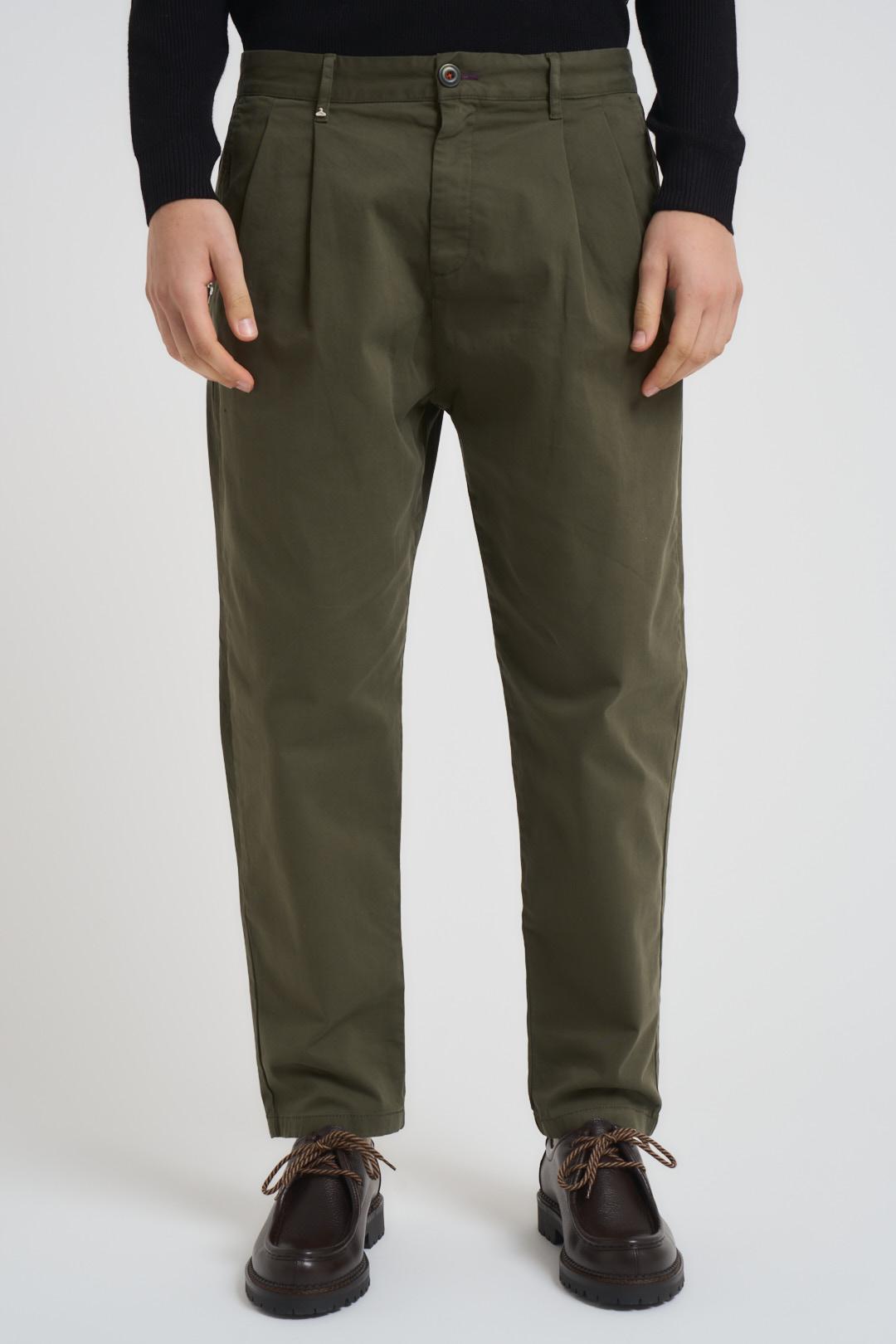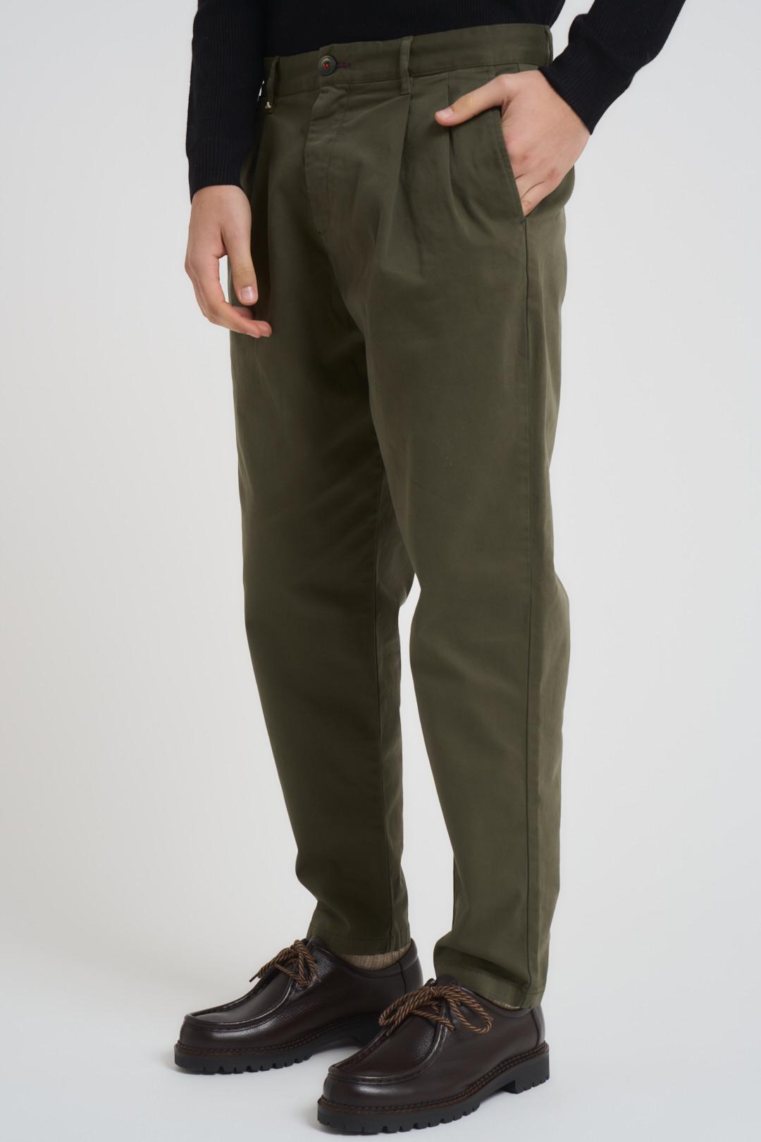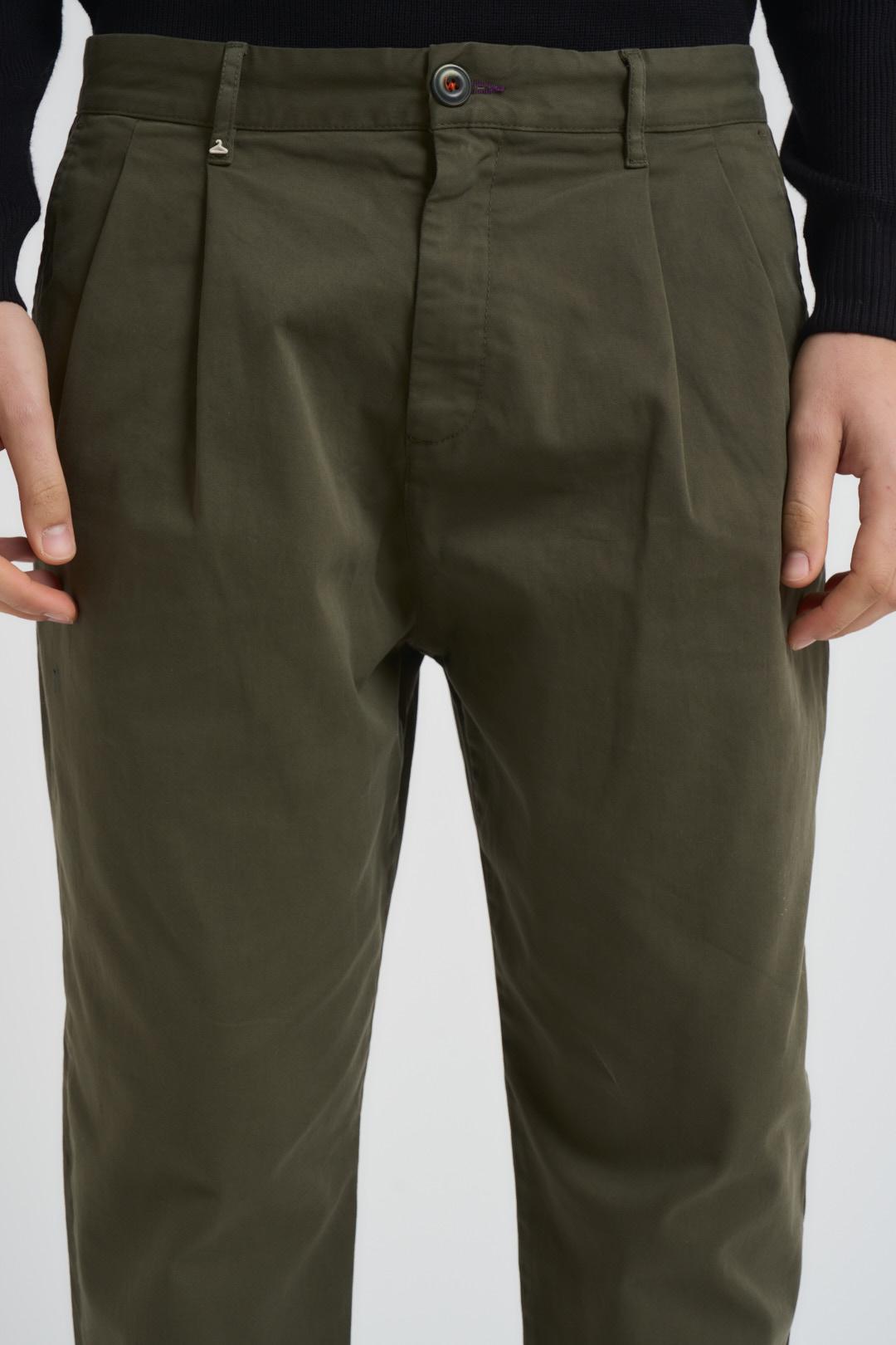 BERNA Pantalone uomo con pinces verde.Modello con tasche americane sul fronte ed a filetto nel retro, etichetta logo in vita. Chiusura centrale con bottone decorato e zip nascosta. Composizione: 97% Cotone 3% Elastane. Il modello è alto 190cm e indossa la taglia 48.