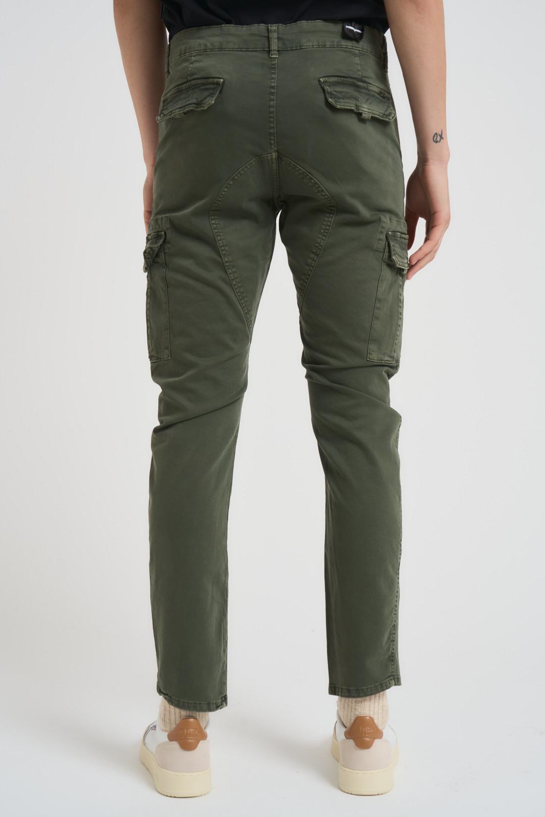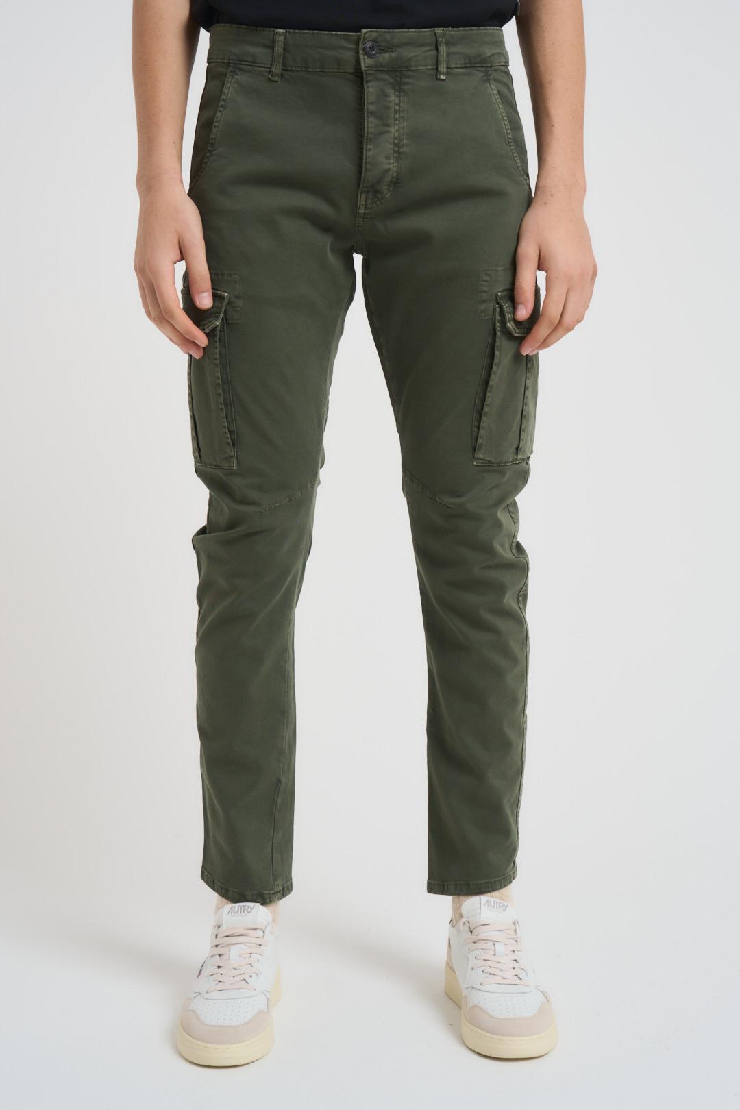 BOMBOOGIE Pantalone uomo slim verde militare. Modello con chiusura frontale con zip e bottone. Tasche a soffietto laterali e tasche cargo laterali. Tasche sul retro con patta. Composizione: 97% cotone 3% elastane. Il modello è alto 190cm e indossa la taglia 33.