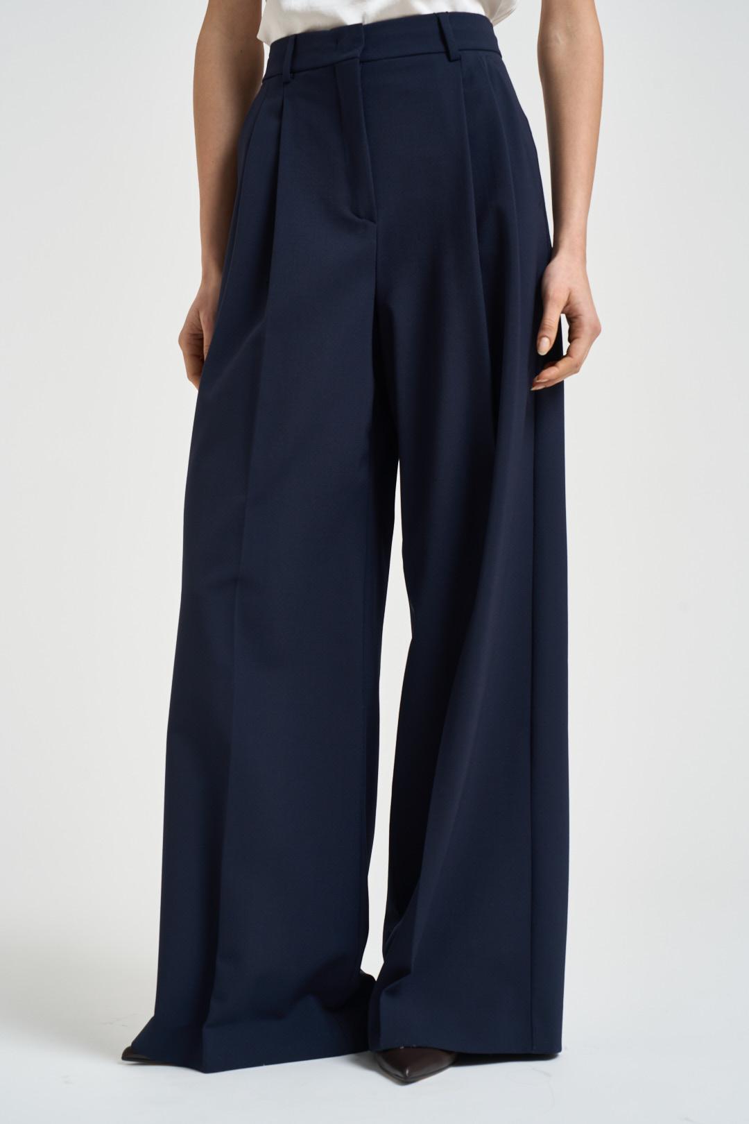 MAX MARA WEEKEND Pantaloni donna a palazzo blu navy. Modello a vita alta con pieghe frontali che donano volume e una linea fluida. Chiusura con zip nascosta e gancio. Tasche laterali alla francese e tasche posteriori a filetto con bottone. Tessuto liscio e strutturato. Composizione: 53% poliestere 43% lana 4% elastane. La modella è alta 176 cm e indossa la taglia 40.