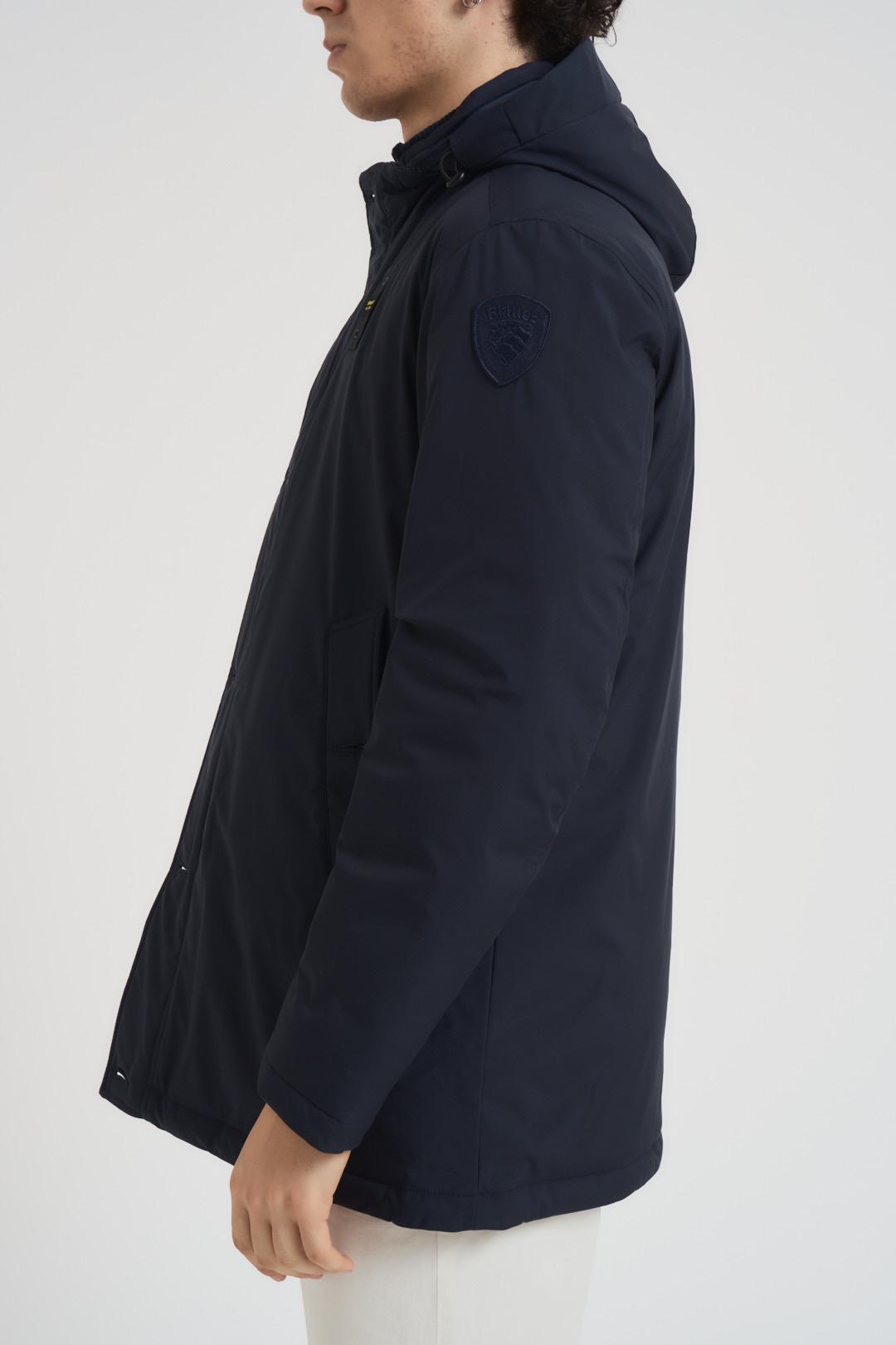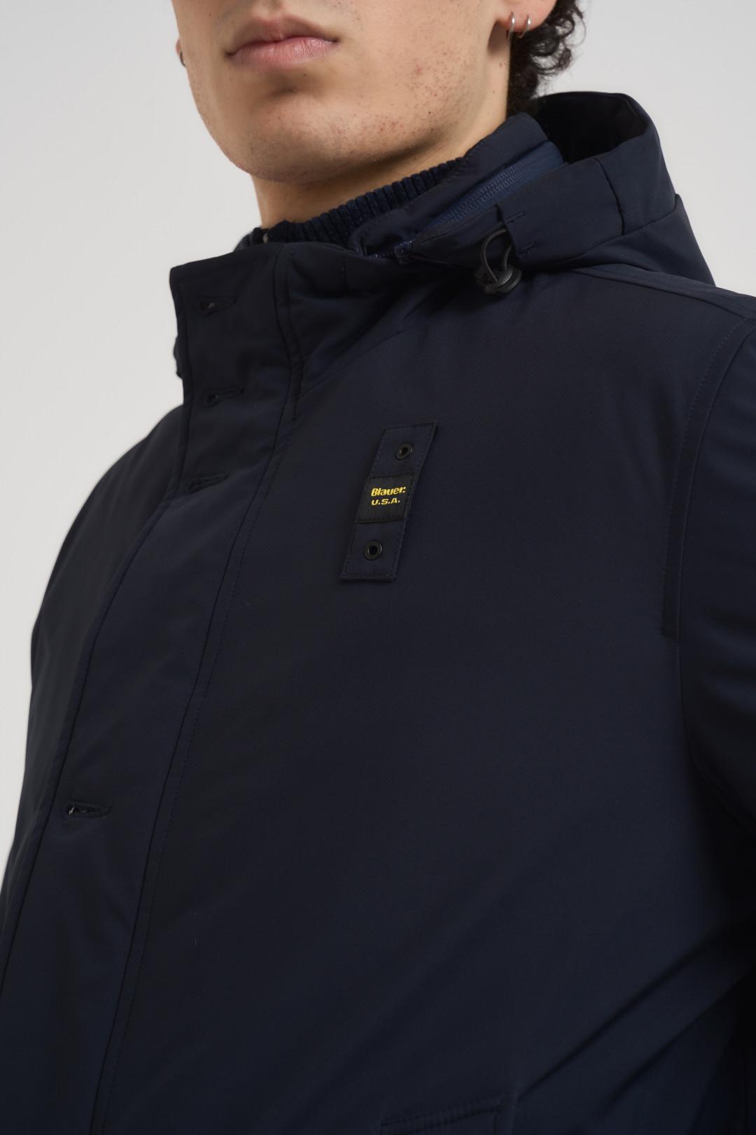 BLAUER Parka uomo midi blu. Modello idrorepellente con collo alto removibile tramite zip e cappuccio. Chiusura con zip e bottoni a pressione. Tasche con bottone, tasche interne con velcro e patch e passante con logo. Imbottito 90/10 piuma 180 gr. Composizione: 100% neoprene. Il modello è alto 190cm e indossa la taglia L.