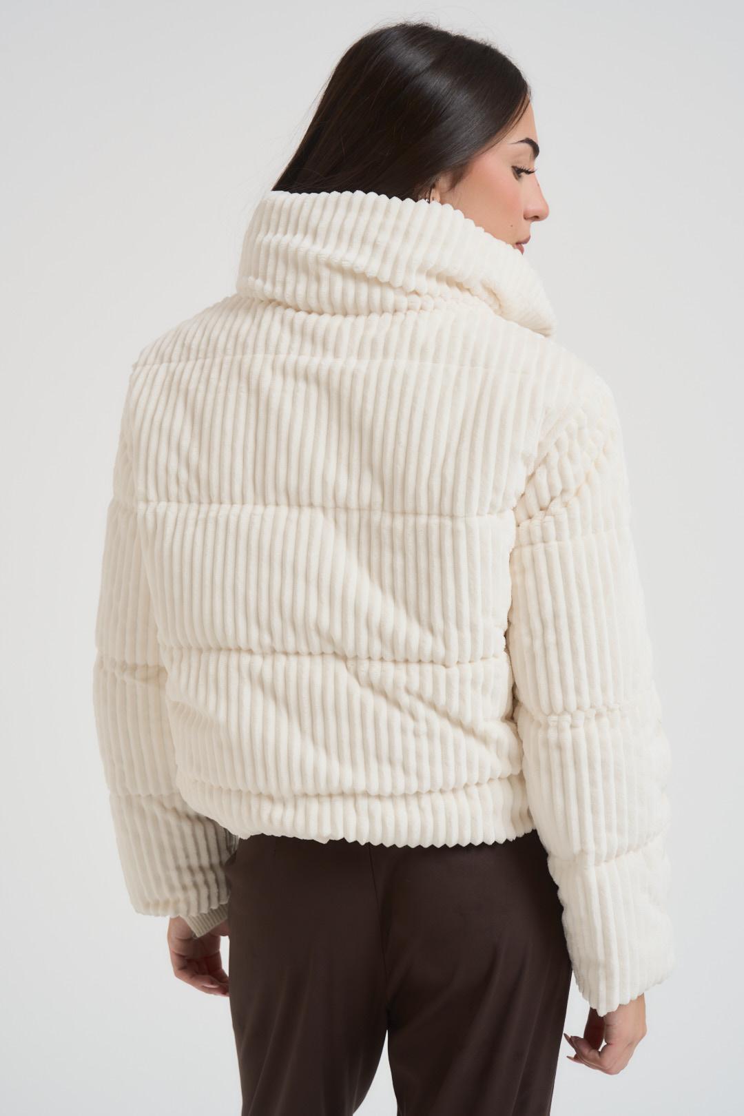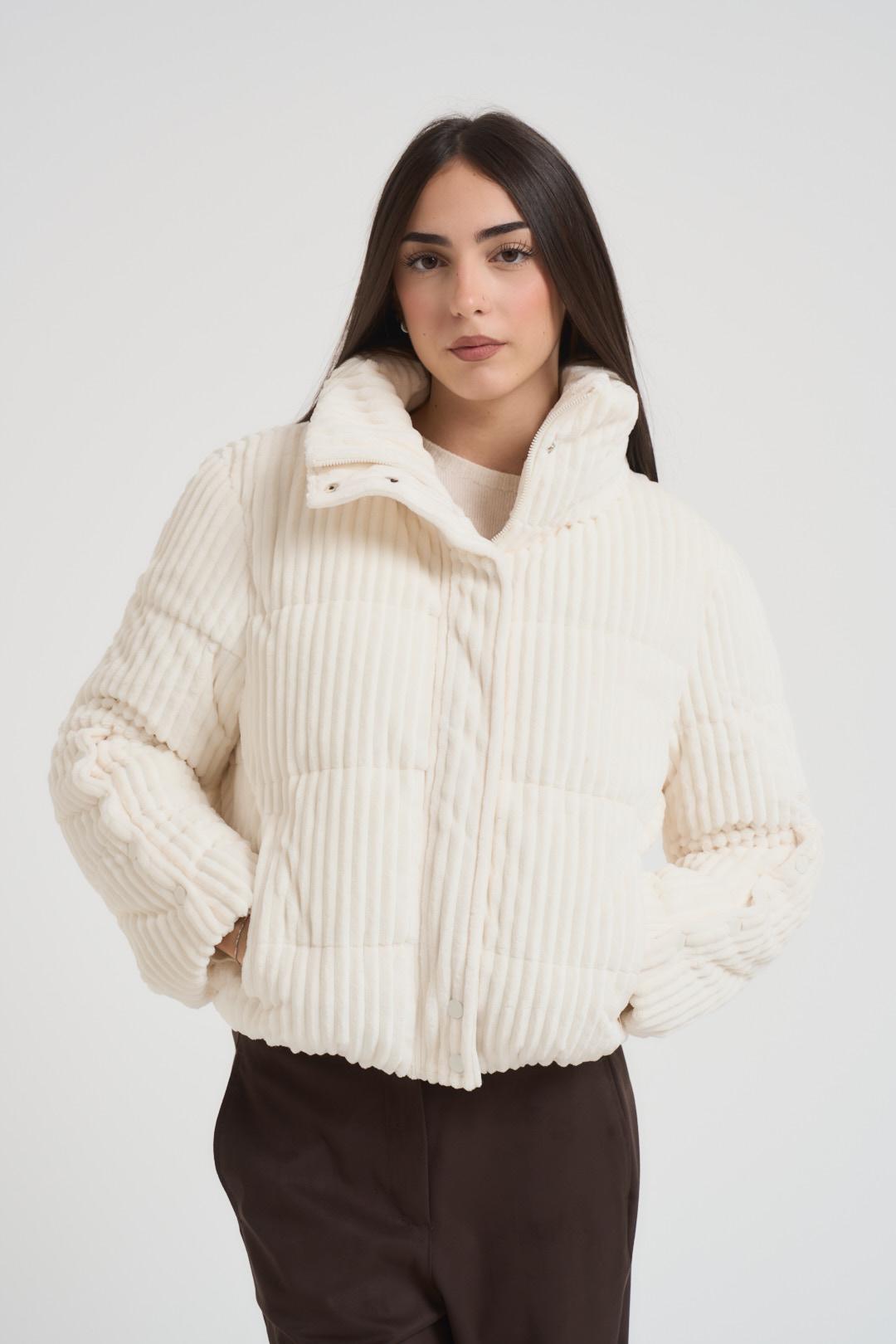 VITTO Piumino donna in velluto bianco. Modello a bomber, corto, con collo alto e due tasche a filetto laterali. Chiusura con zip e bottoni automatici. Composizione: poliestere. La modella è alta 172 cm e indossa la taglia S.