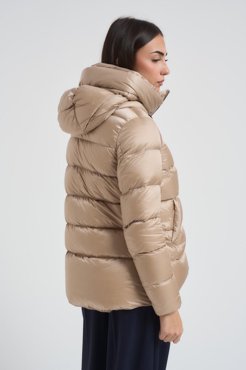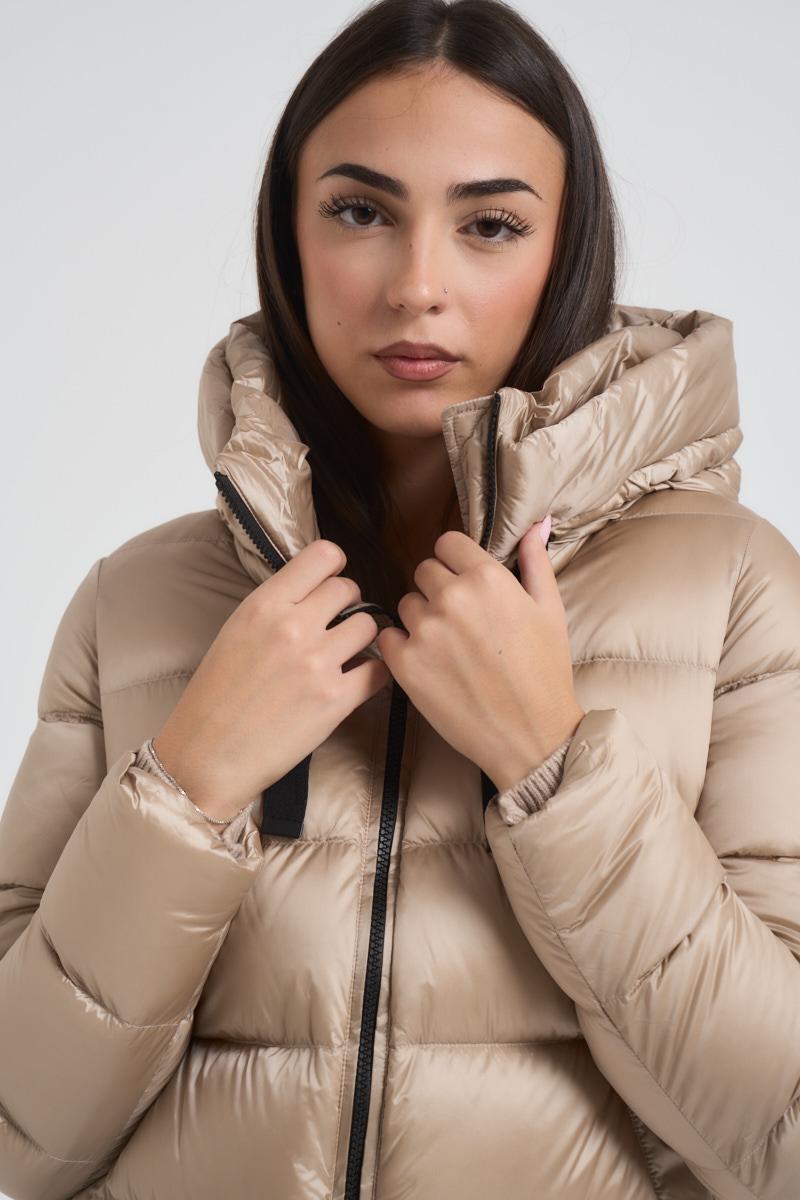 BOMBOOGIE Piumino donna Roma beige. Modello con taglio a "A", chiusura frontale con zip biderizionale, imbottito con piuma d'oca, windproof e water resistant. Regular fit. Composizone: 100% Nylon. La modella è alta 172 cm e indossa la taglia 40.