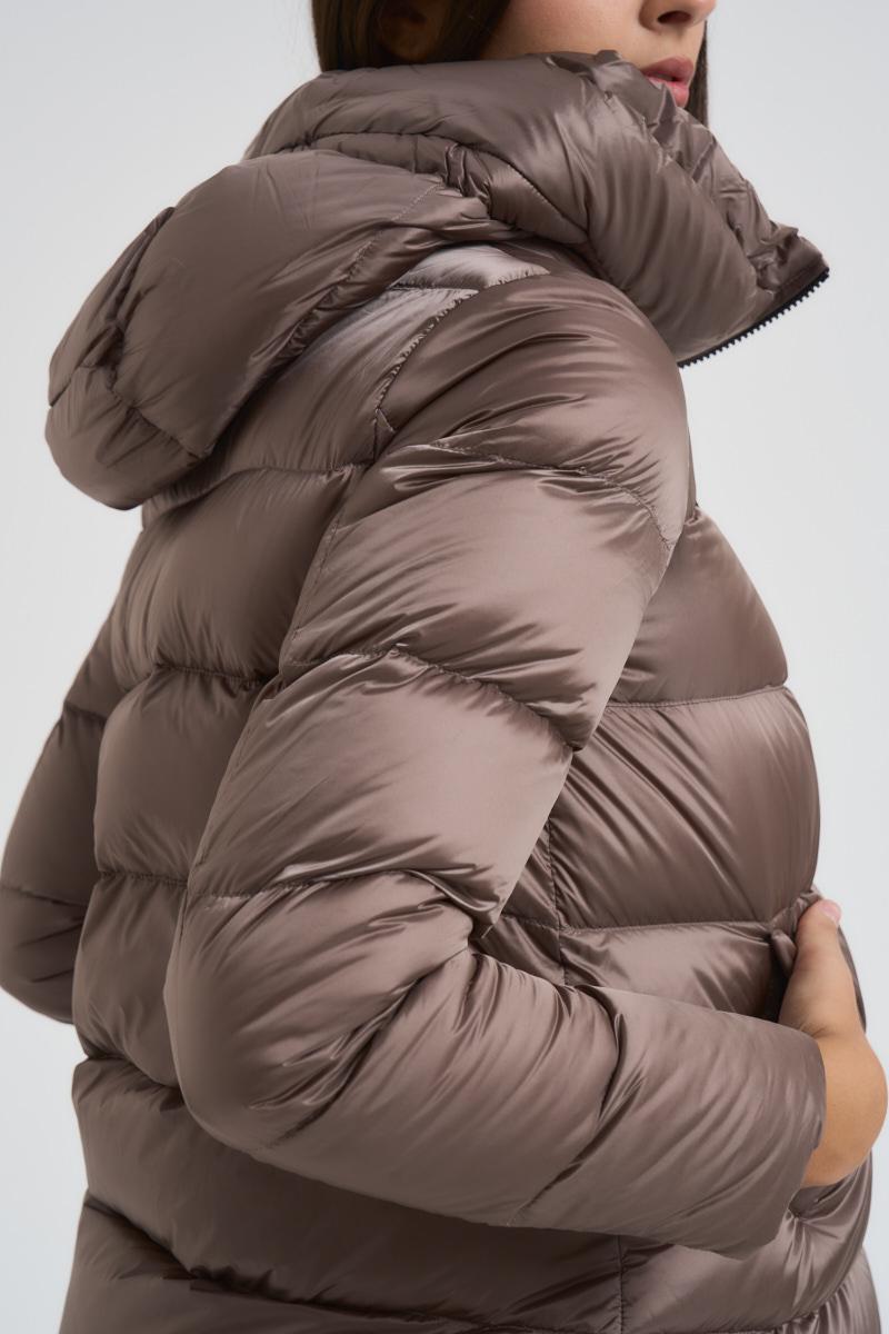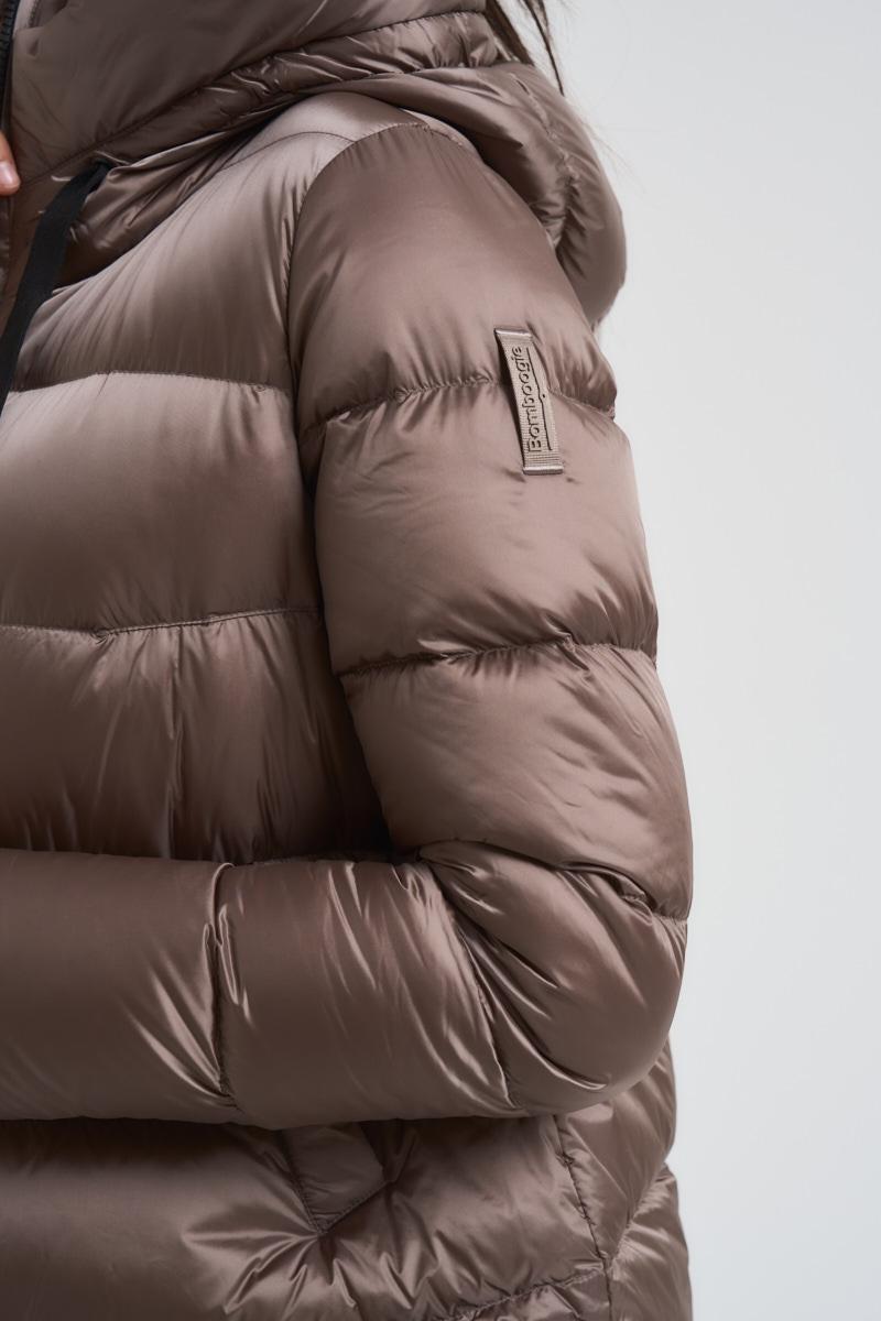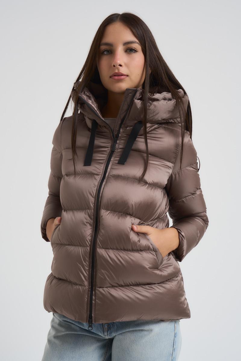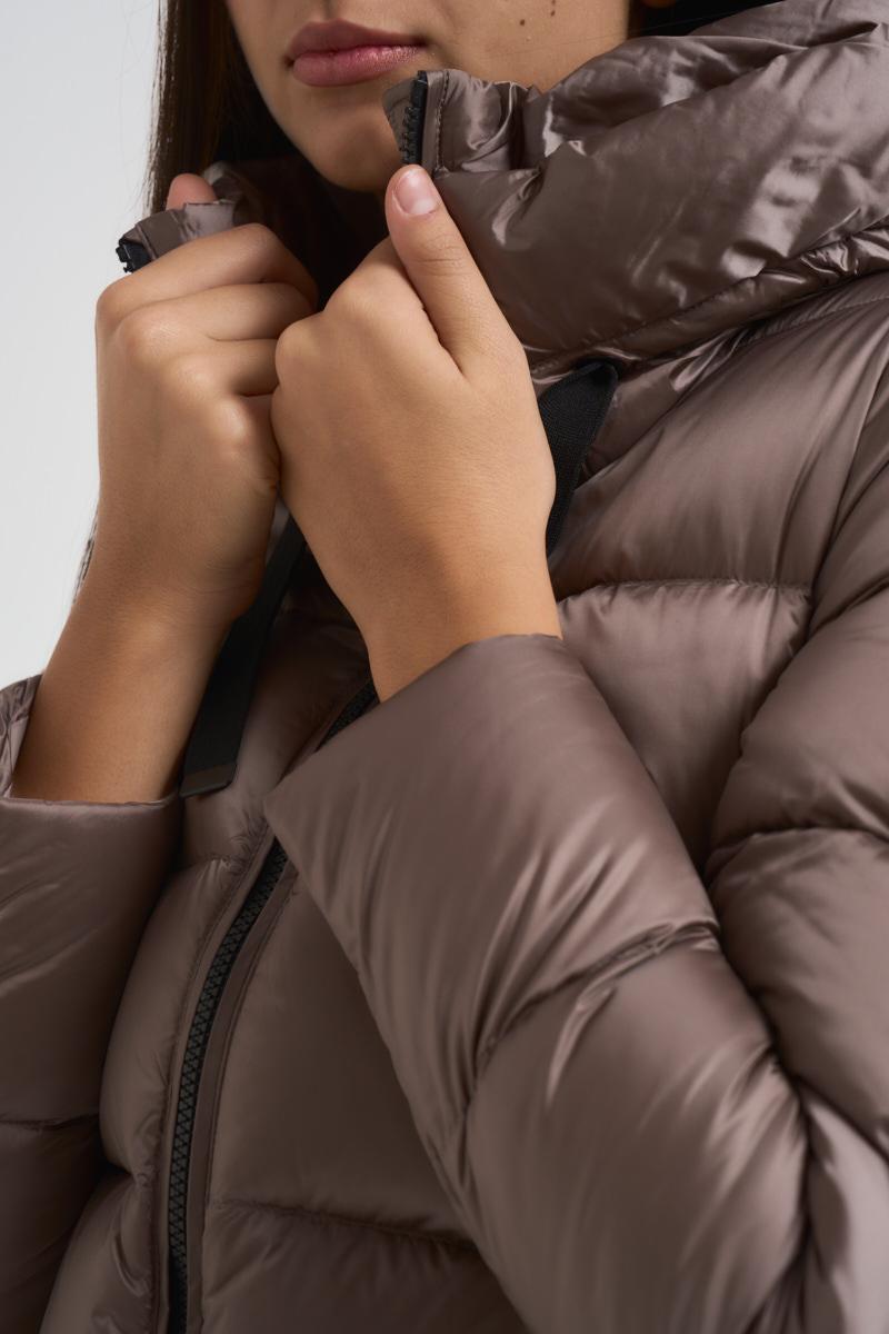 BOMBOOGIE Piumino donna Roma marrone. Modello con taglio a "A", chiusura frontale con zip biderizionale, imbottito con piuma d'oca, windproof e water resistant. Regular fit. Composizone: 100% Nylon. La modella è alta 176 cm e indossa la taglia 40.