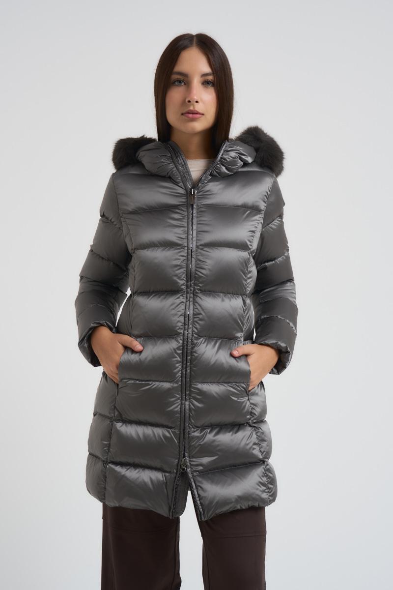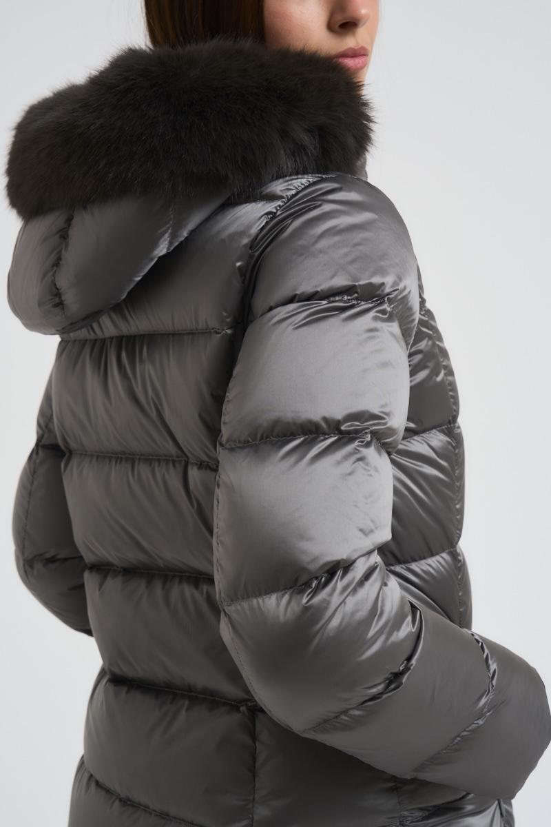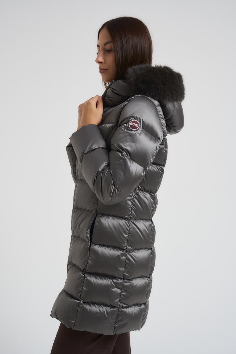 COLMAR Piumino donna trapuntato con bordo in vera pelliccia grigio. Modello impermeabile. Tasche laterali con zip. Logo applicato sulla manica. Imbottitura in piuma e piuminpo d'anatra. Vestibilità slim. Composizione: 100% Nylon. La modella è alta 176 cm e indossa la taglia 40.
