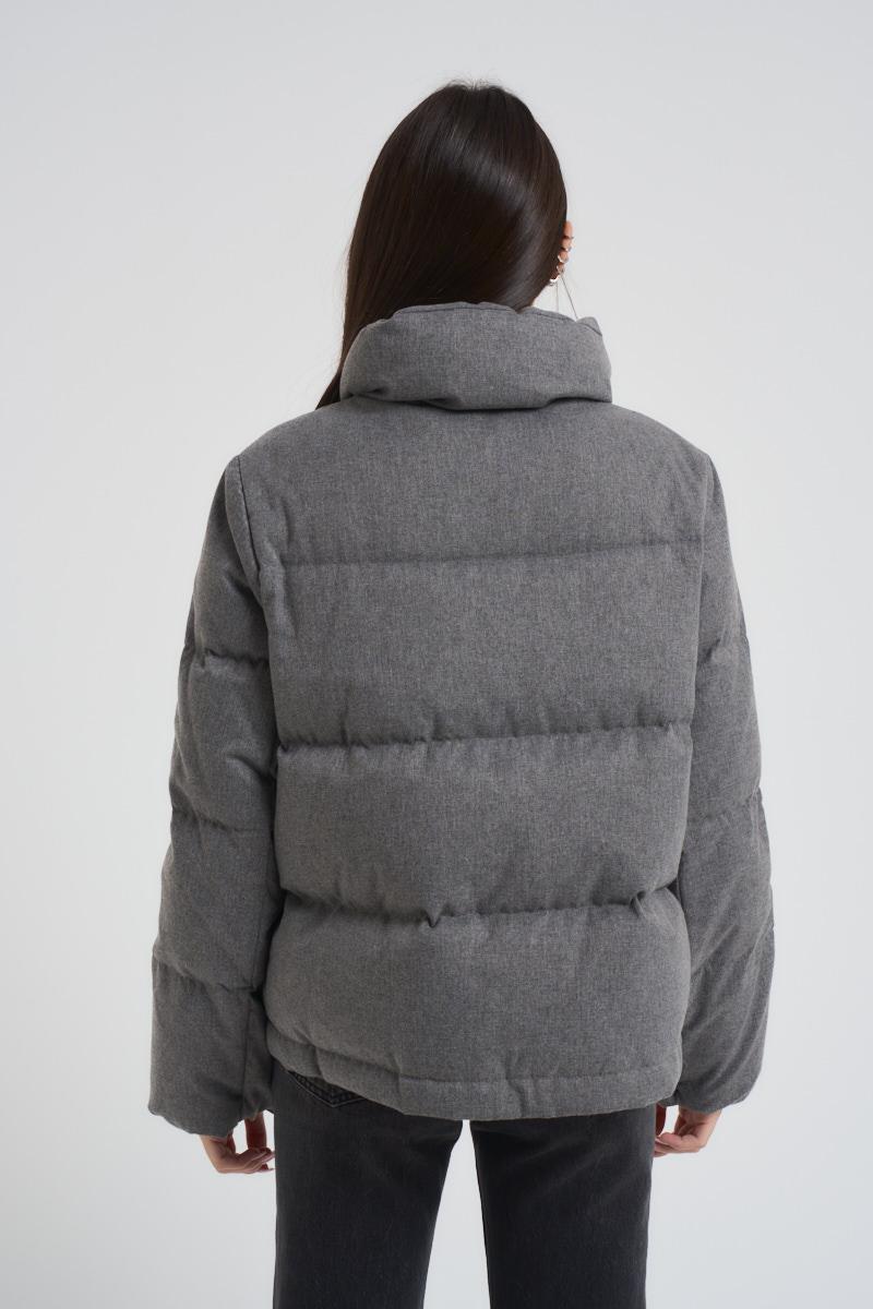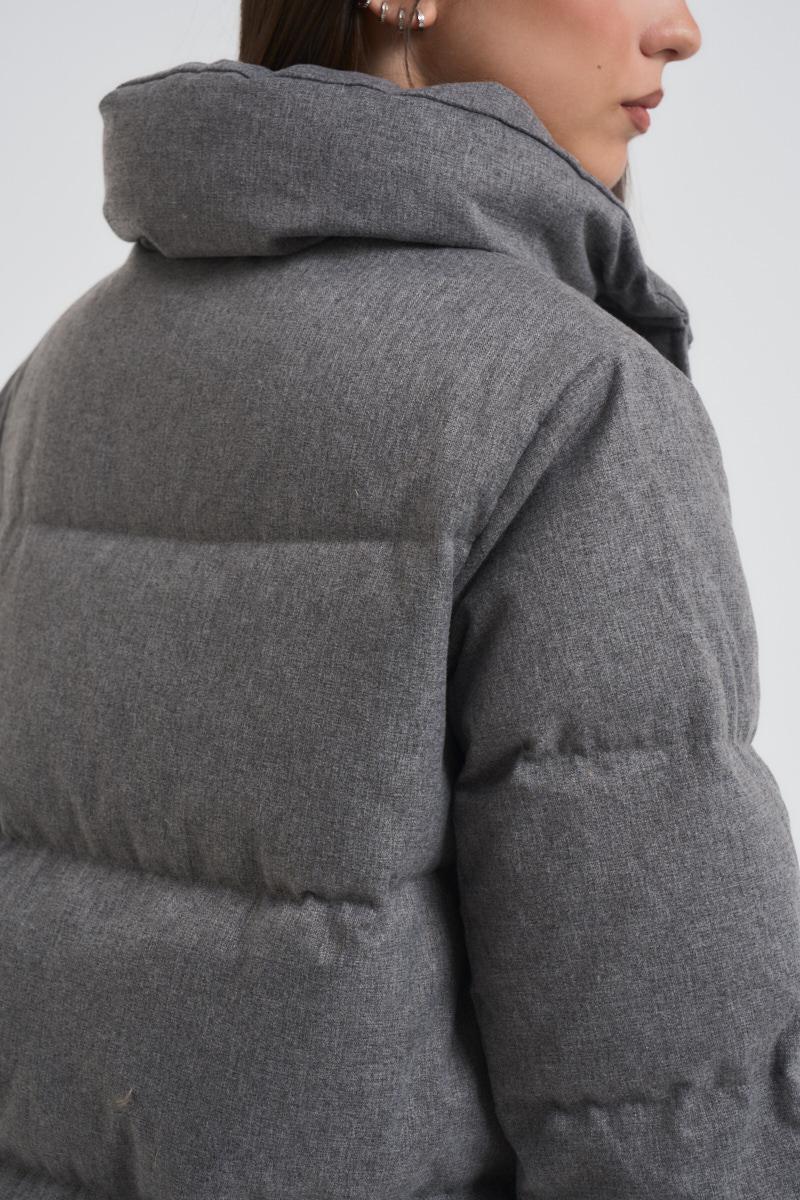 HELMUR Piumino donna trapuntato grigio. Modello corto con zip e bottoni invisibili. Imbottito con piuma. Composizione: 100% Poliestere. La modella è alta 172 cm e indossa la taglia S.