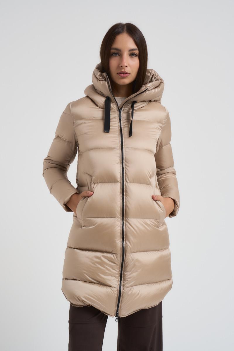 BOMBOOGIE Piumino Geneva Jacket donna beige. Modello imbottito con vera piuma con cappuccio in nylon glossy. Interno trapuntato rivestito in nylon colore a contrasto. Chiusura con zip centrale sormontata da cannoncino con bottoni a pressione nascosti. Tasche inserite nei tagli laterali con zip e taschino interno. Composizione: 100% Nylon. La modella è alta 176 cm e indossa la taglia 40.