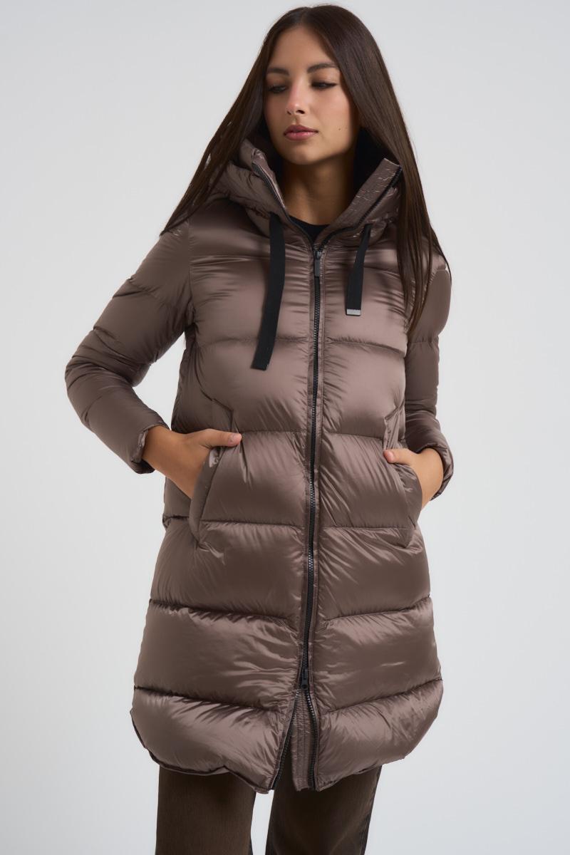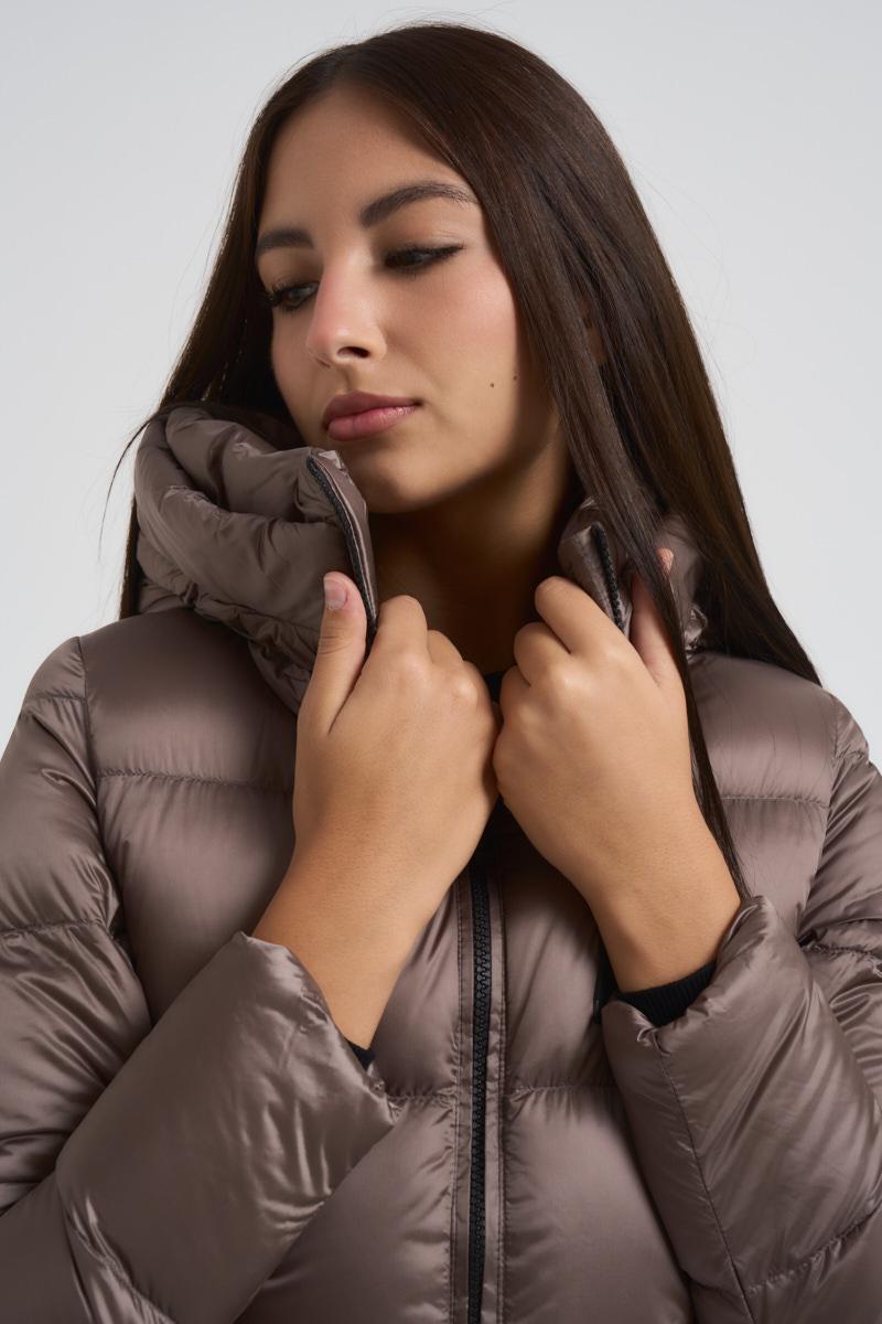 BOMBOOGIE Piumino Geneva Jacket donna marrone. Modello imbottito con vera piuma con cappuccio in nylon glossy. Interno trapuntato rivestito in nylon colore a contrasto. Chiusura con zip centrale sormontata da cannoncino con bottoni a pressione nascosti. Tasche inserite nei tagli laterali con zip e taschino interno. Composizione: 100% Nylon. La modella è alta 176 cm e indossa la taglia 40.