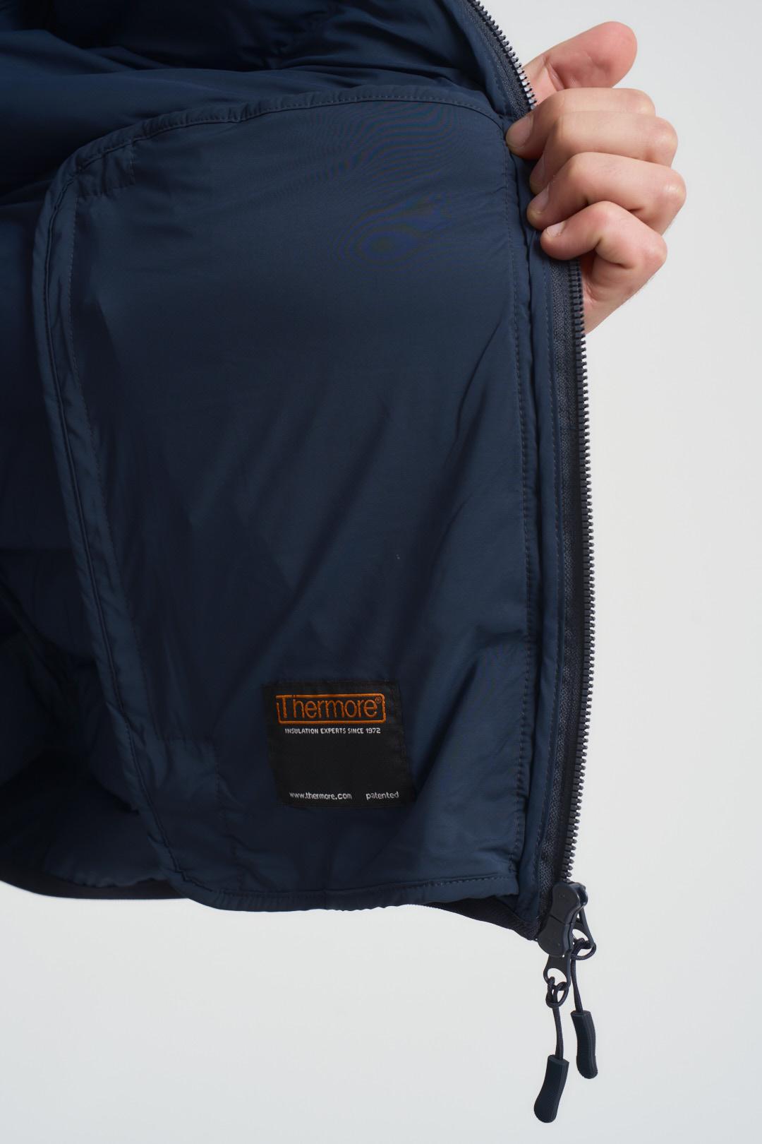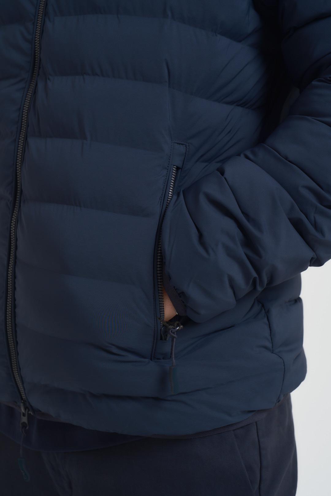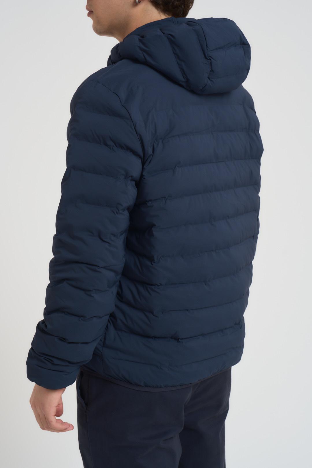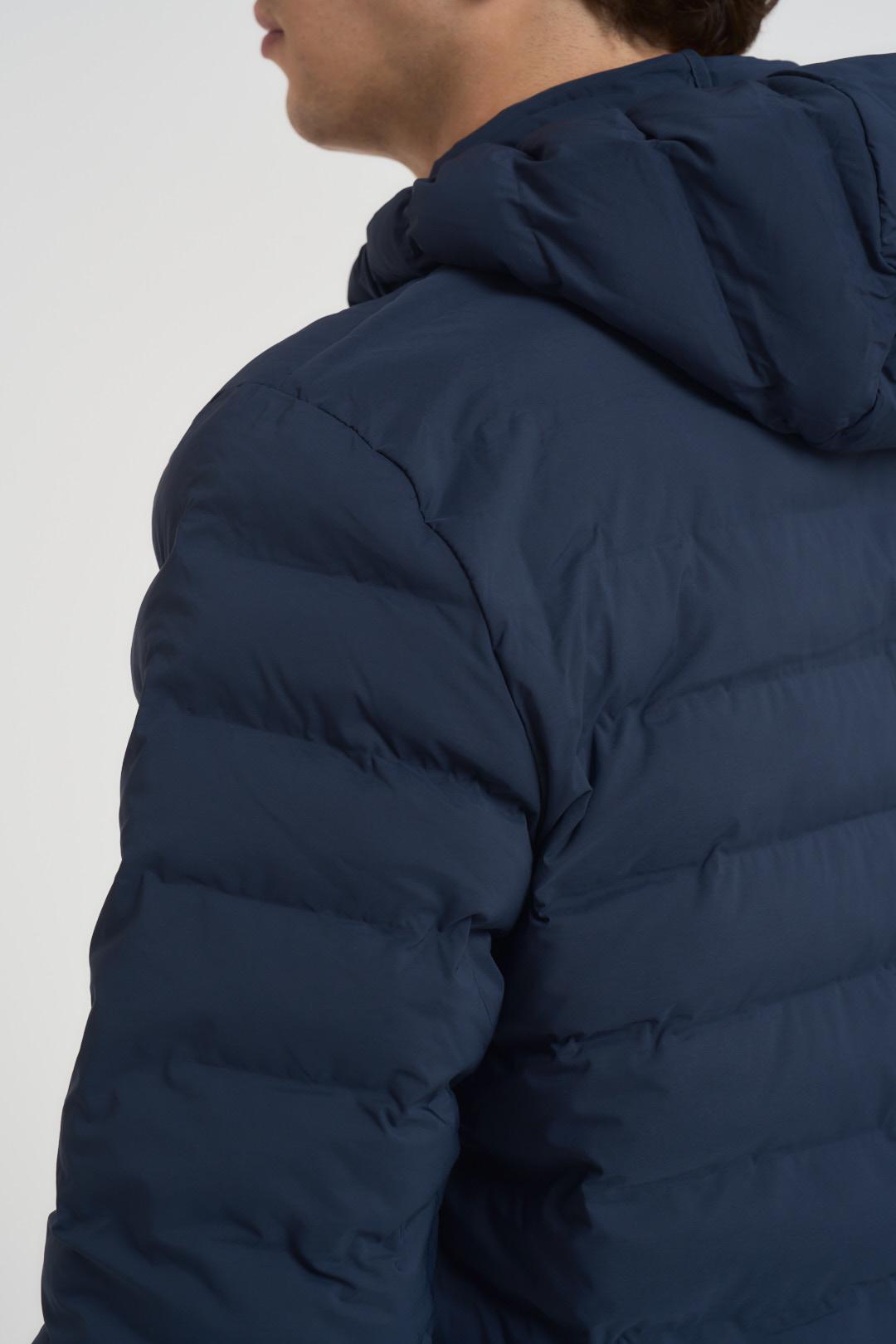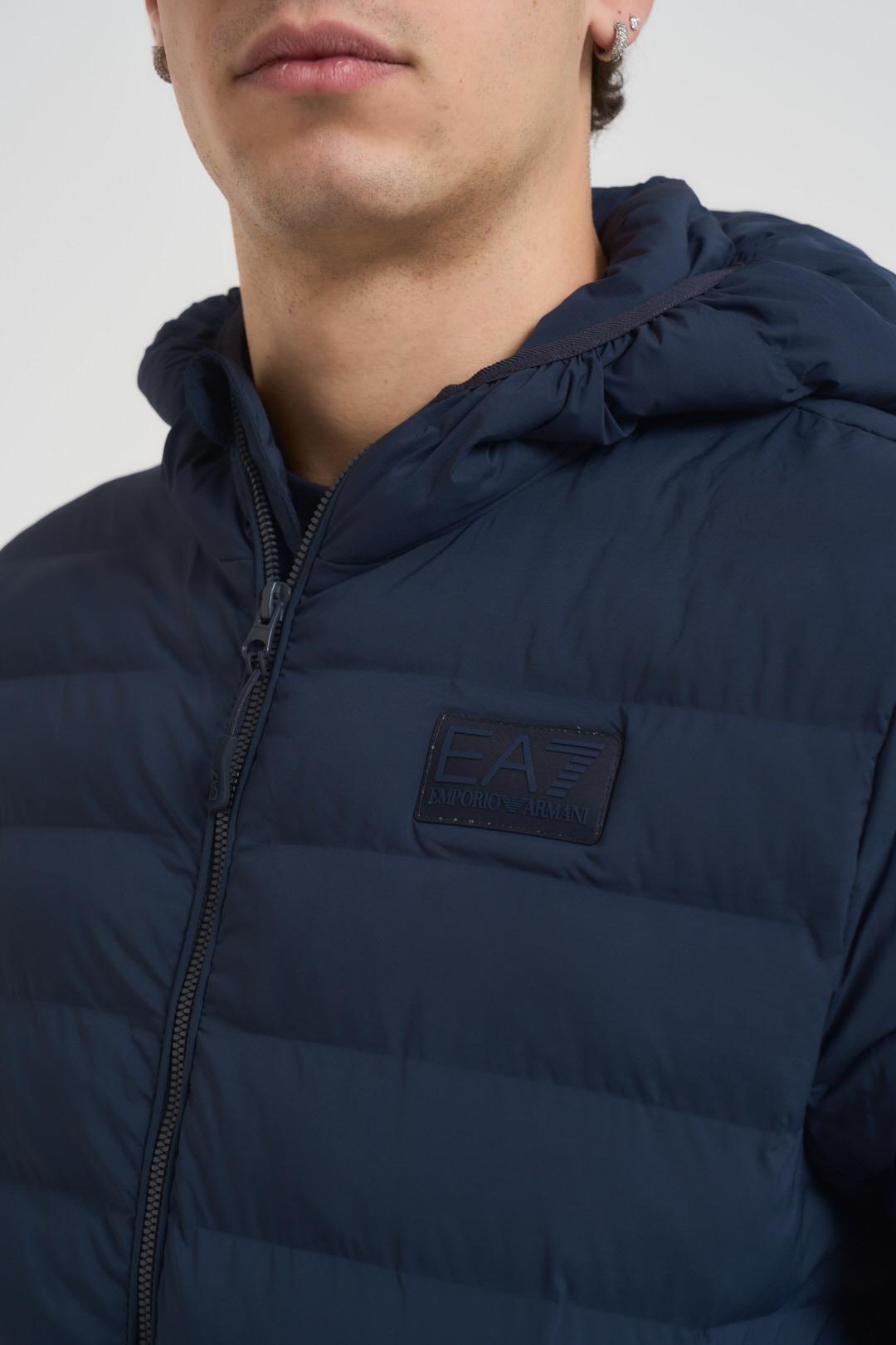 EA7 Piumino uomo con cappuccio blu. Modello trapuntato con chiusura frontale con zip. Tasche laterali con chiusura con zip. Manica lunga. Logo posto sul petto. Composizione: 92% poliestere, 8% elastane. Il modello è alto 190 cm e indossa la taglia L.