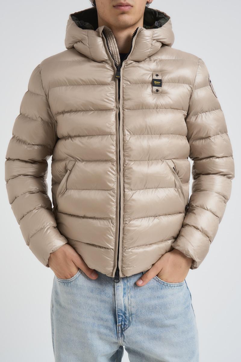 BLAUER Piumino uomo trapuntato beige. Modello con cappuccio fisso, chiusura centrale con zip a doppio cursore. Due tasche frontali con zip verticale e fondo manica con elastico dall'effetto arricciato. Coulisse con tubolare elastico, passante Blauer sul petto e patch sulla manica sinistra. Composizione: 100% nylon. Il modello è alto 190 cm e indossa la taglia L.