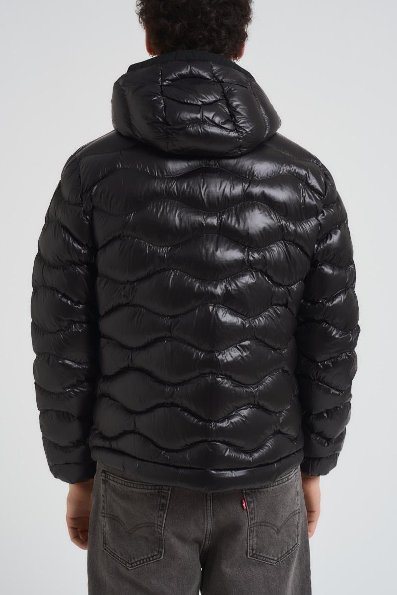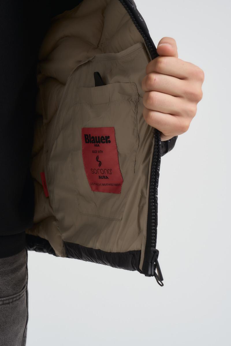 BLAUER Piumino uomo trapuntato in nylon nero. Modello in nylon idrorepellente con cappuccio fisso con coulisse e chiusura con zip. Taschino applicato sul petto tono tu tono e due tasche a filetto con cerniera. Composizione: 100% poliammide. Imbottitura: ovatta Sorona® Aura. Il modello è alto 190 cm e indossa la taglia L.