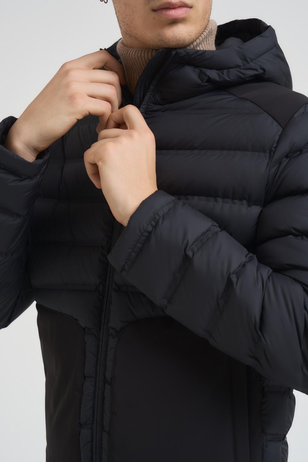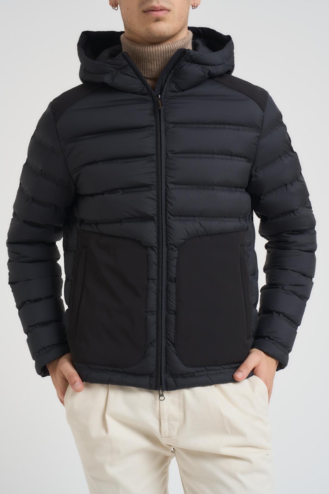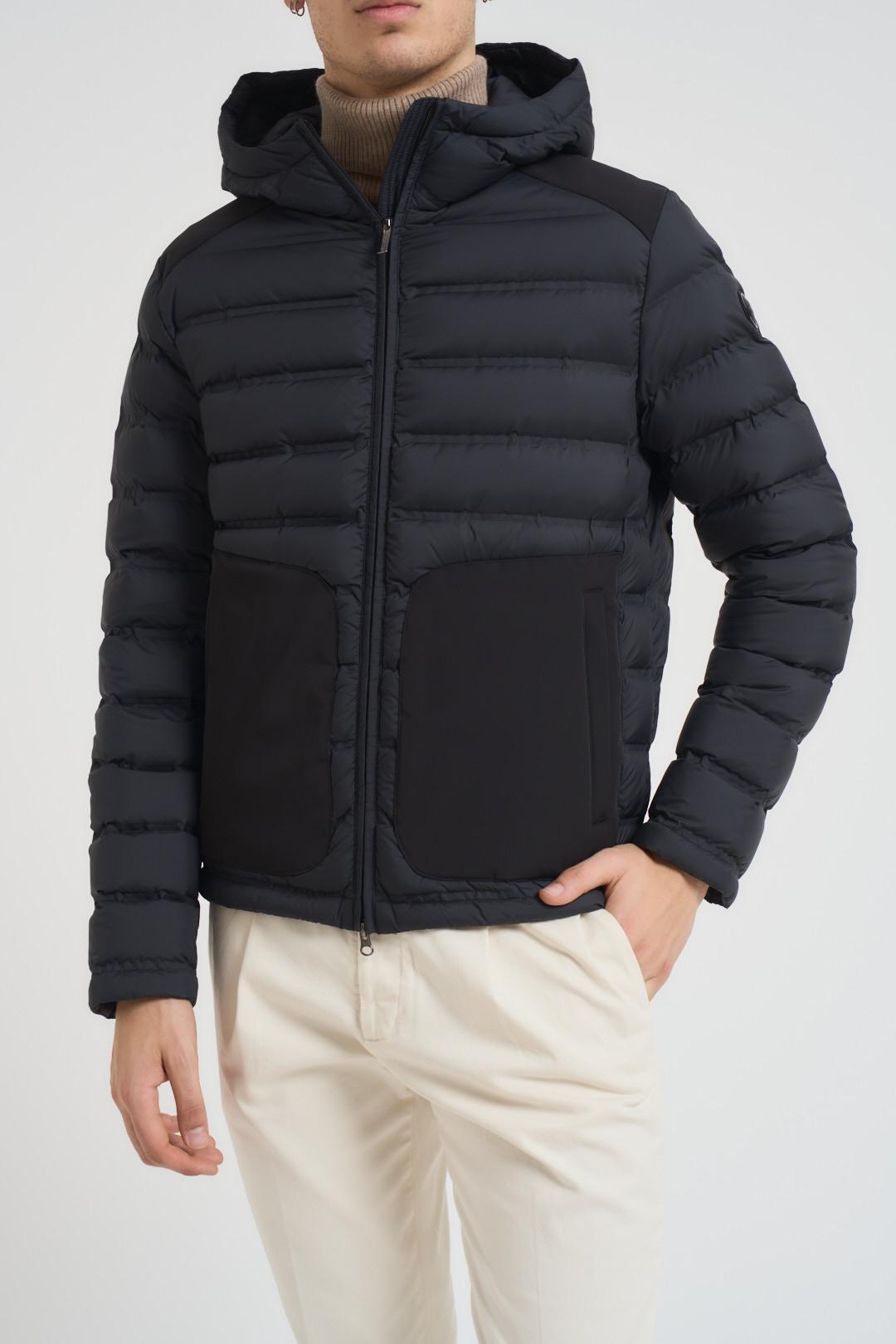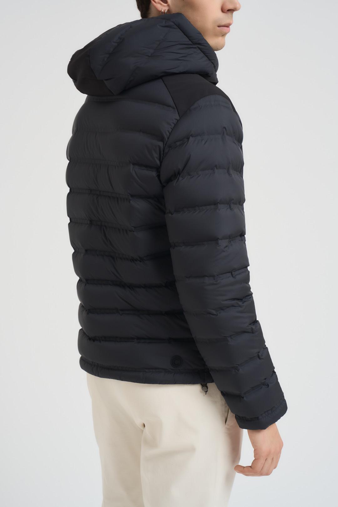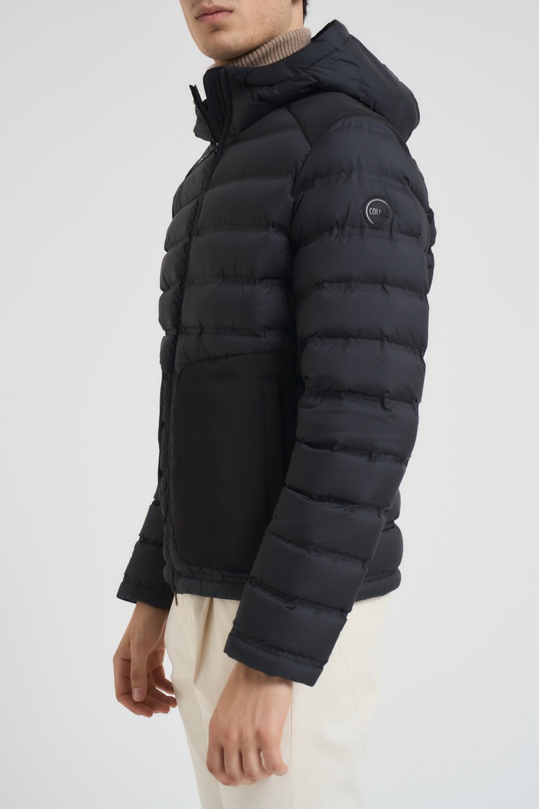 COLMAR Piumino uomo trapuntato nero. Modello con chiusura con zip doppio cursore, cappuccio fisso con coulisse di regolazione, tasche laterali con zip e tasca interna con zip. Coulisse di regolazione sul fondo. Imbottitura in piuma naturale. Logo Colmar Originals applicato sulla manica sinistra e patch "C" applicato sul retro. Composizione: nylon. Il modello è alto 190cm e indossa la taglia 50.