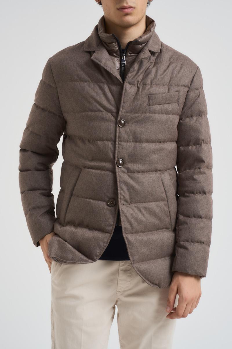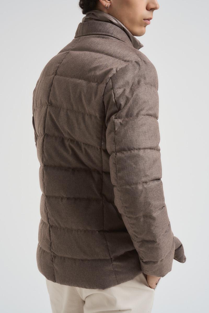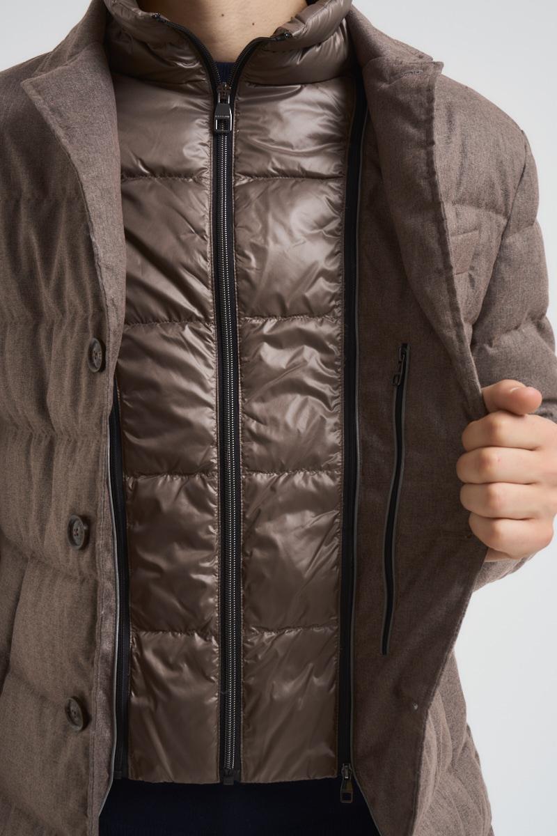 HELMUR Piumino uomo trapuntato tortora. Modello corto con doppia chiusura removibile da zip in piumino semilucido, chiusura principale con bottoni. Composizione: 100% poliestere. Imbottitura: 50% piumino 50% piuma. Il modello è alto 190 cm e indossa la taglia L.