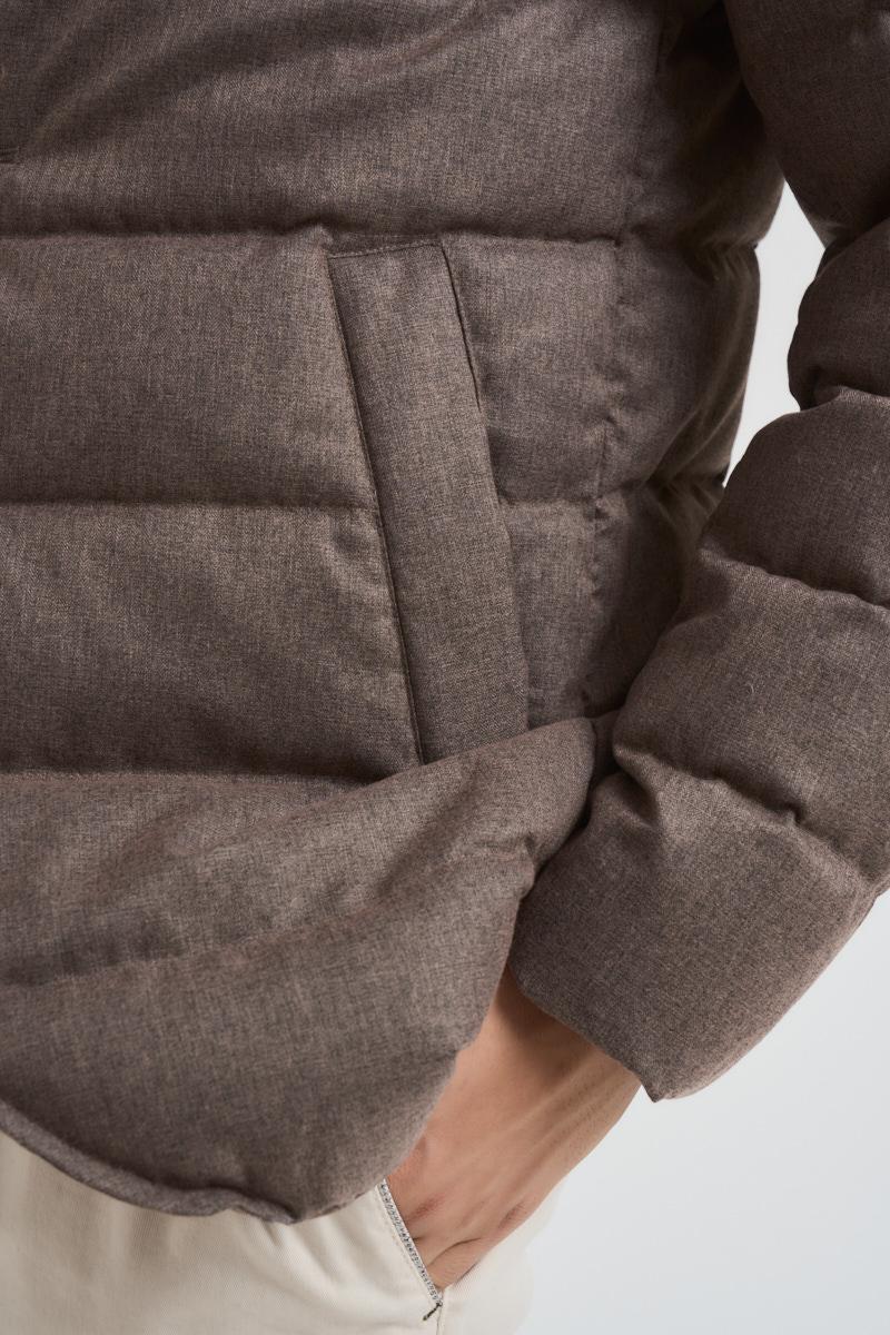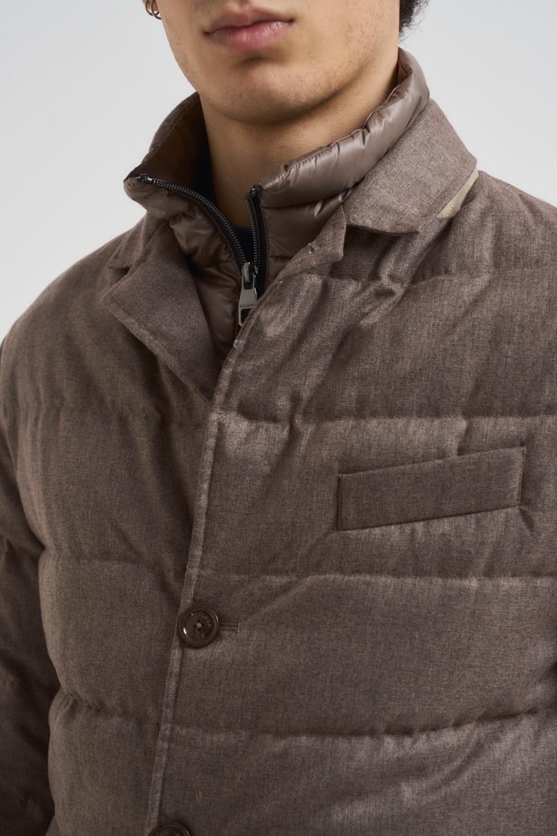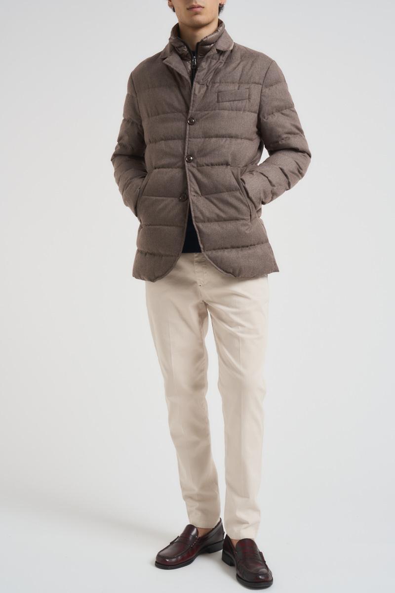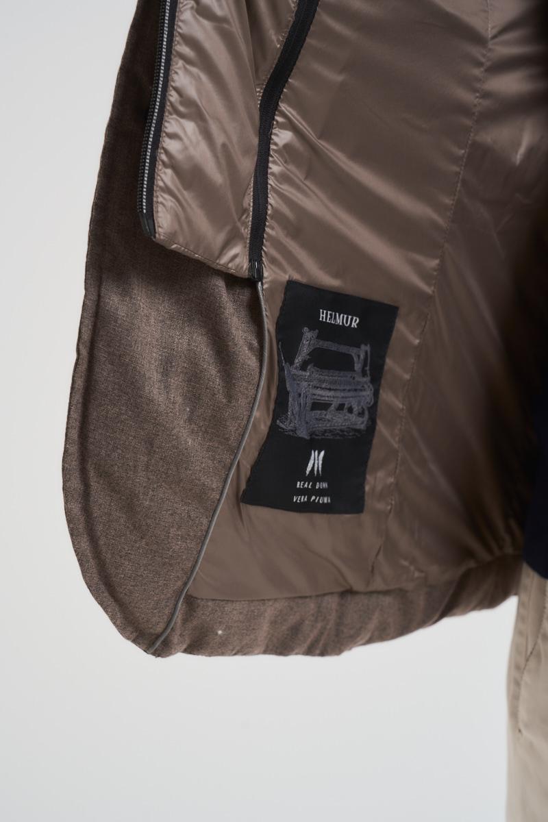 HELMUR Piumino uomo trapuntato tortora. Modello corto con doppia chiusura removibile da zip in piumino semilucido, chiusura principale con bottoni. Composizione: 100% poliestere. Imbottitura: 50% piumino 50% piuma. Il modello è alto 190 cm e indossa la taglia L.