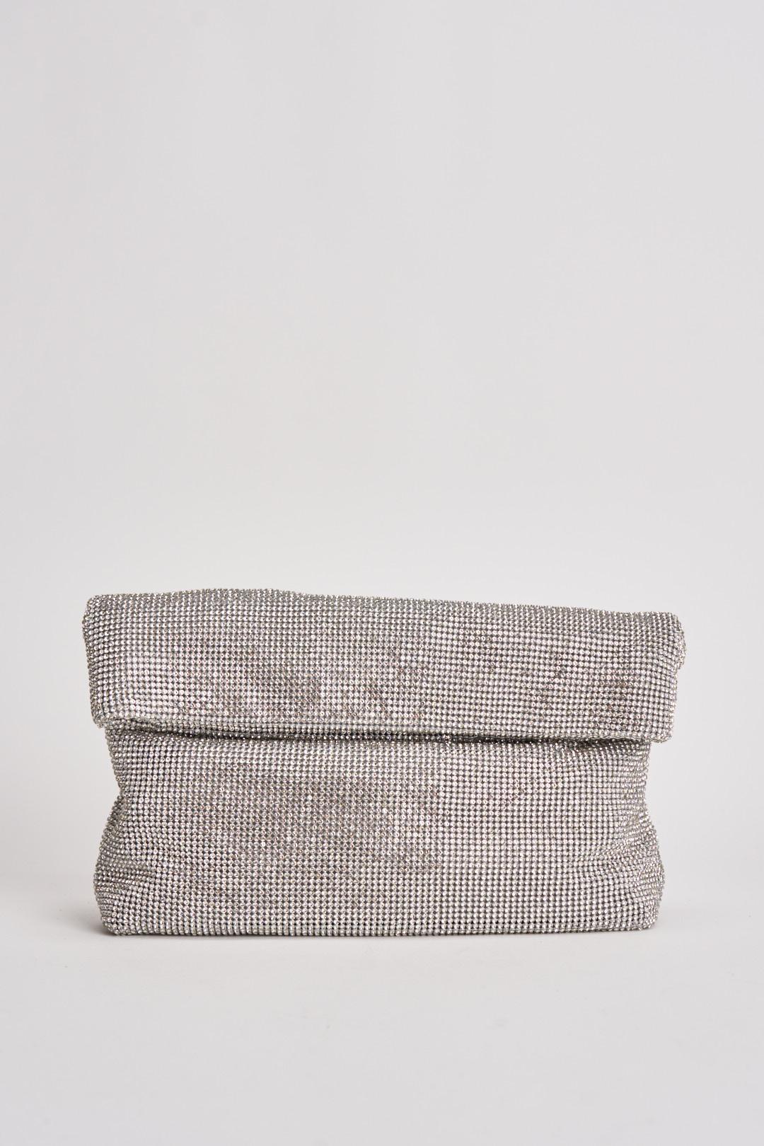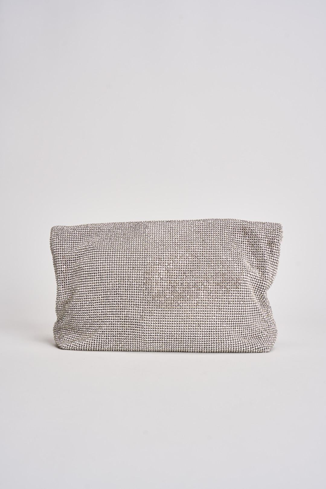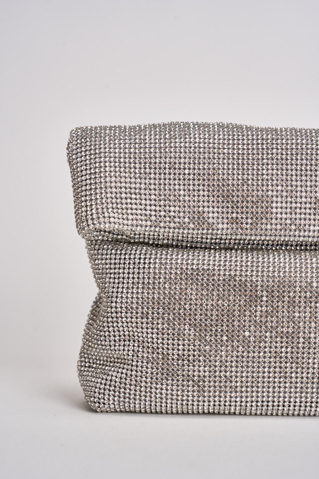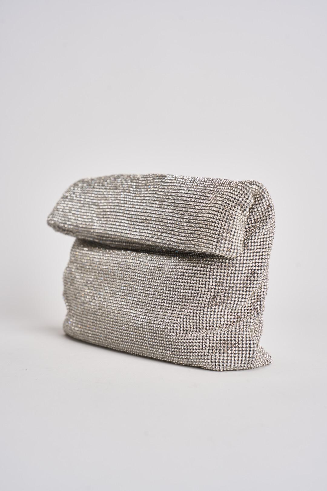 TWENTY FOURHAITCH Pochette donna con strass argento. Modello in maglia con strass. Chiusura con calamita. Taschino interno con chiusura con zip. Composizione in maglia strass all over. Dimensioni: 35 cm x 3 cm x 24 cm.