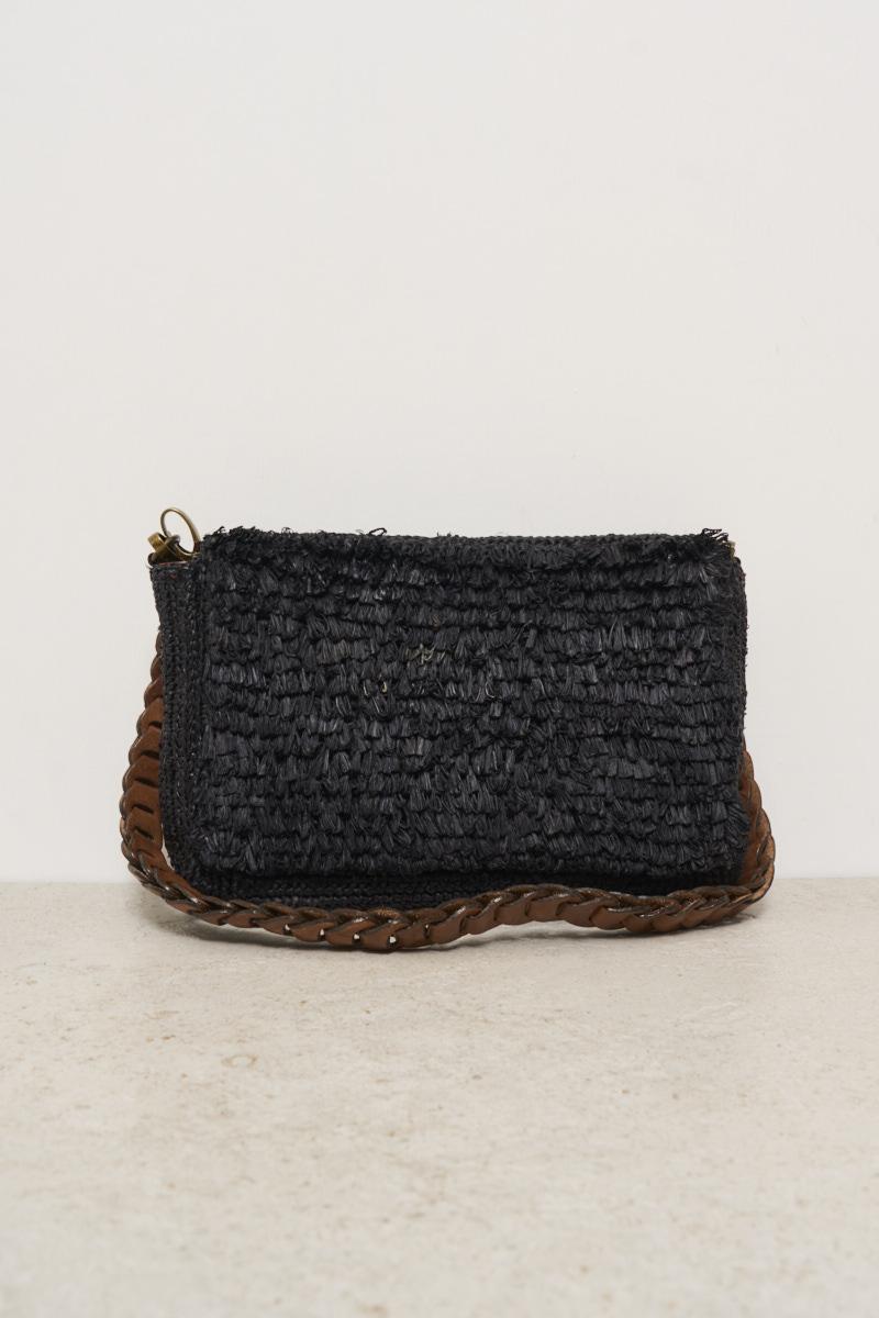 IBELIV Pochette donna Hafa in rafia nera. Due chiusure magnetiche con bottoni a pressione e due tracolle rimovibili di diversa lunghezza, una in pelle intrecciata a cascata e l'altra in pelle piatta. Presente una tasca applicata per le carte di credito. Composizione: 100% Raphia naturale. Misure: 26x 15x 5.5 cm.