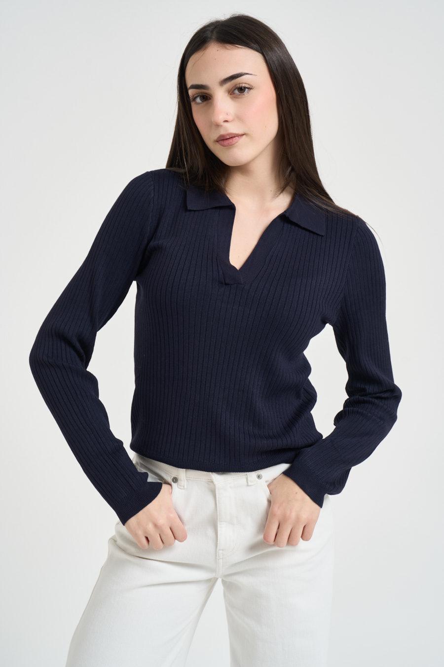 ONLY Polo donna a costine blu. Modello con scollo a V, maniche lunghe e polsini a coste. Composizione: 70% Viscosa 30% nylon. La modella è alta 172cm e indossa la taglia S.