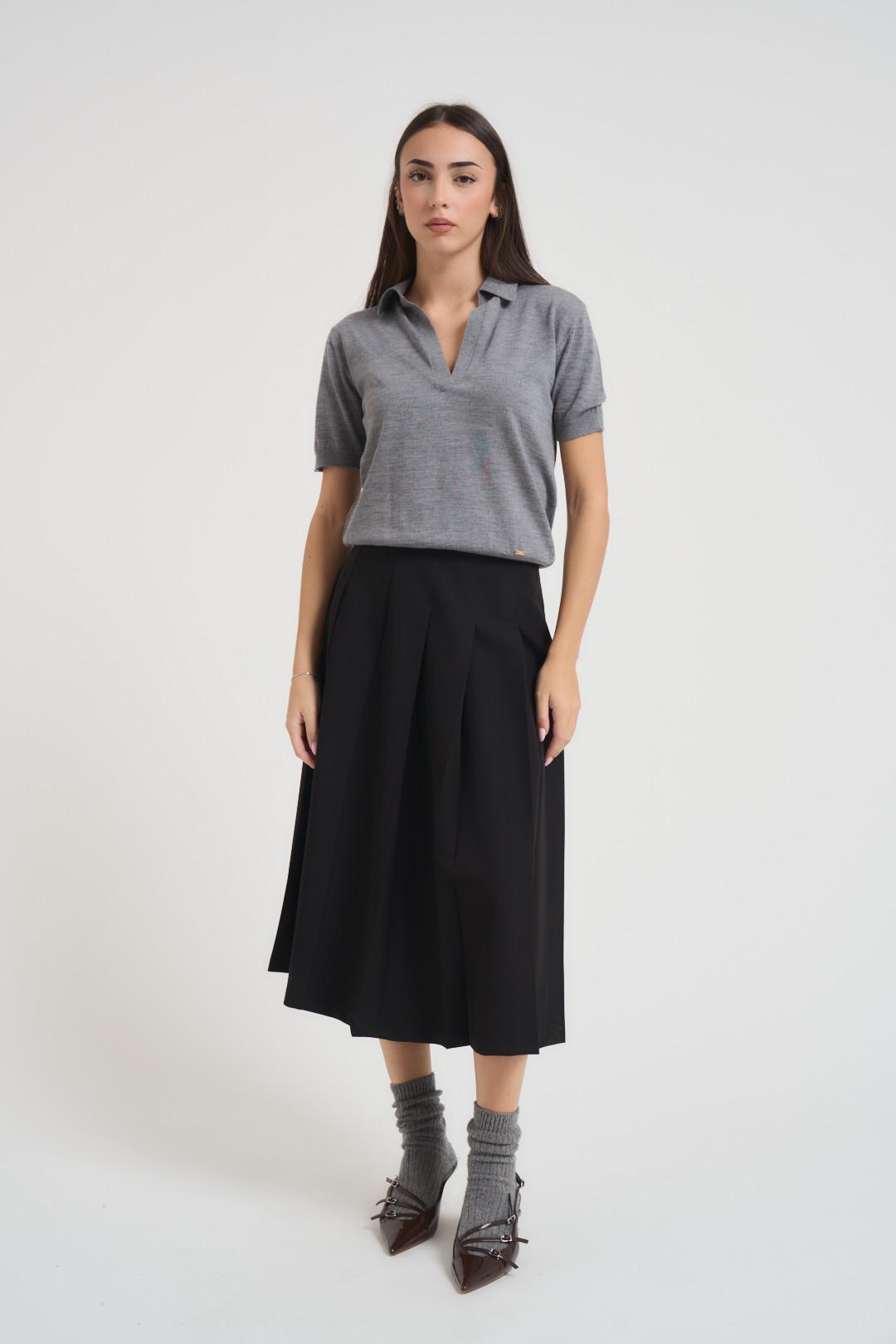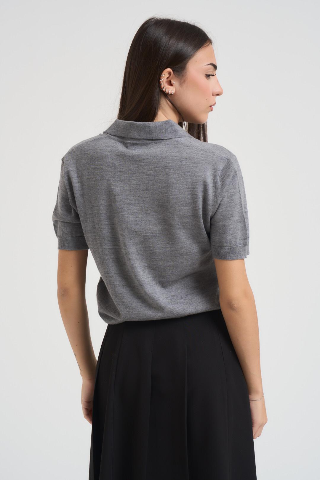 KAOS Polo donna grigia. Modello a maniche corte, con scollo a V. Polsini rifiniti a costine. Composizione: misto viscosa e poliestere. La modella è alta 172 cm e indossa la taglia S.