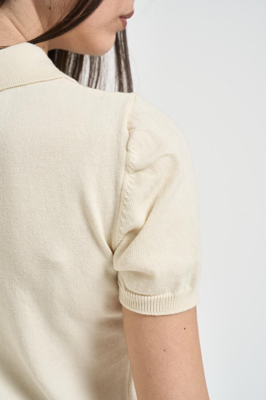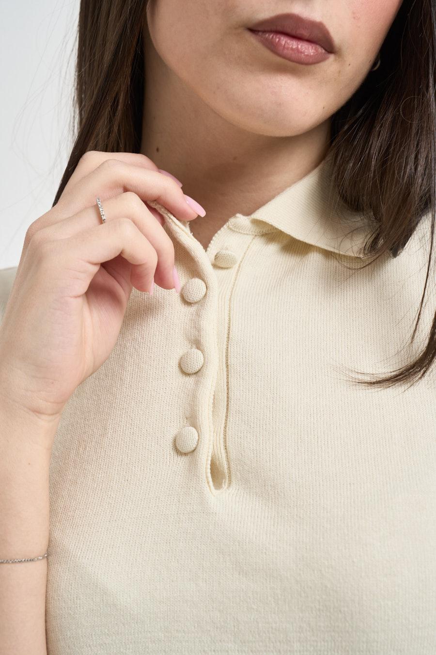 VICOLO Polo donna in maglia panna. Modello con colletto e chiusura a bottoncini, a manica corta. Dettagli a costine. Composizione: 100%cotone. La modella è alta 172cm e indossa la taglia UNI.