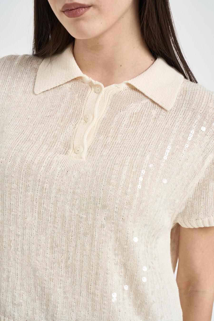 SUSY MIX Polo donna manica corta crema. Modello con colletto classico e chiusura frontale con bottoni. Manica corta, vestibilità morbida. Applicazioni di paillettes. Finiture a coste su colletto, maniche e fondo. Composizione: 80% viscosa, 20% poliammide. La modella è alta 172 cm e indossa la taglia UNI.