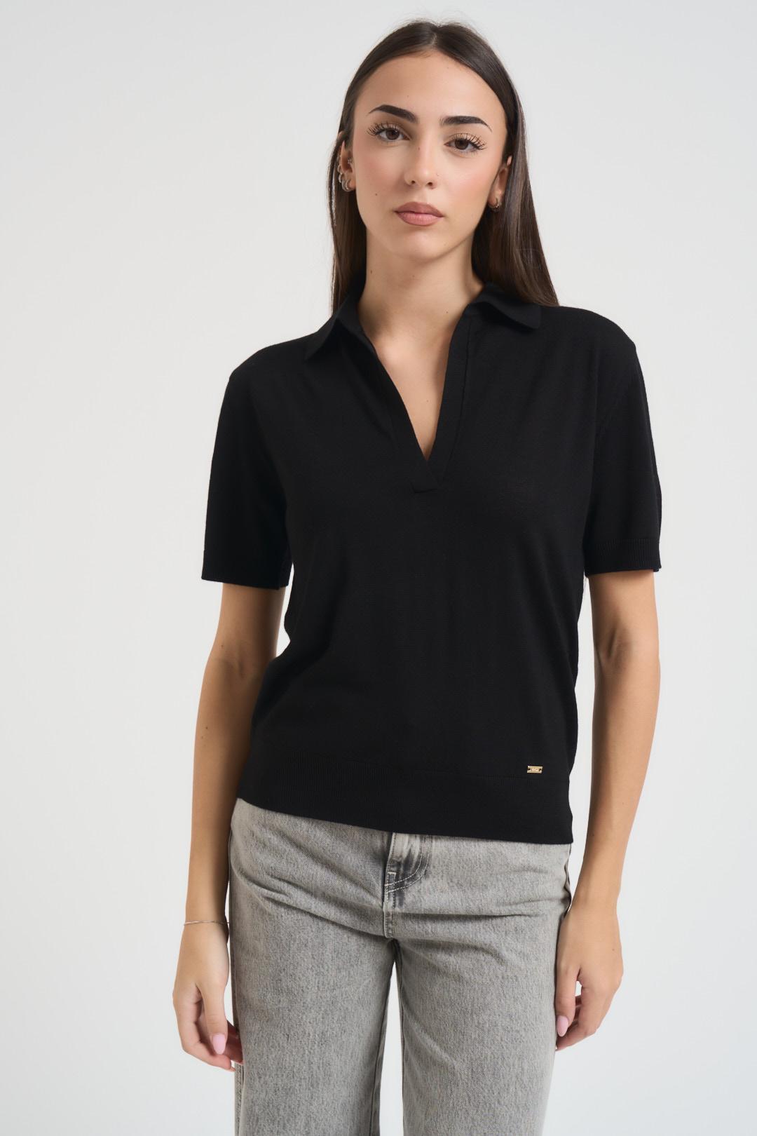 KAOS Polo donna nera. Modello a maniche corte, con scollo a V. Polsini rifiniti a costine. Composizione: misto viscosa e poliestere. La modella è alta 172 cm e indossa la taglia S.