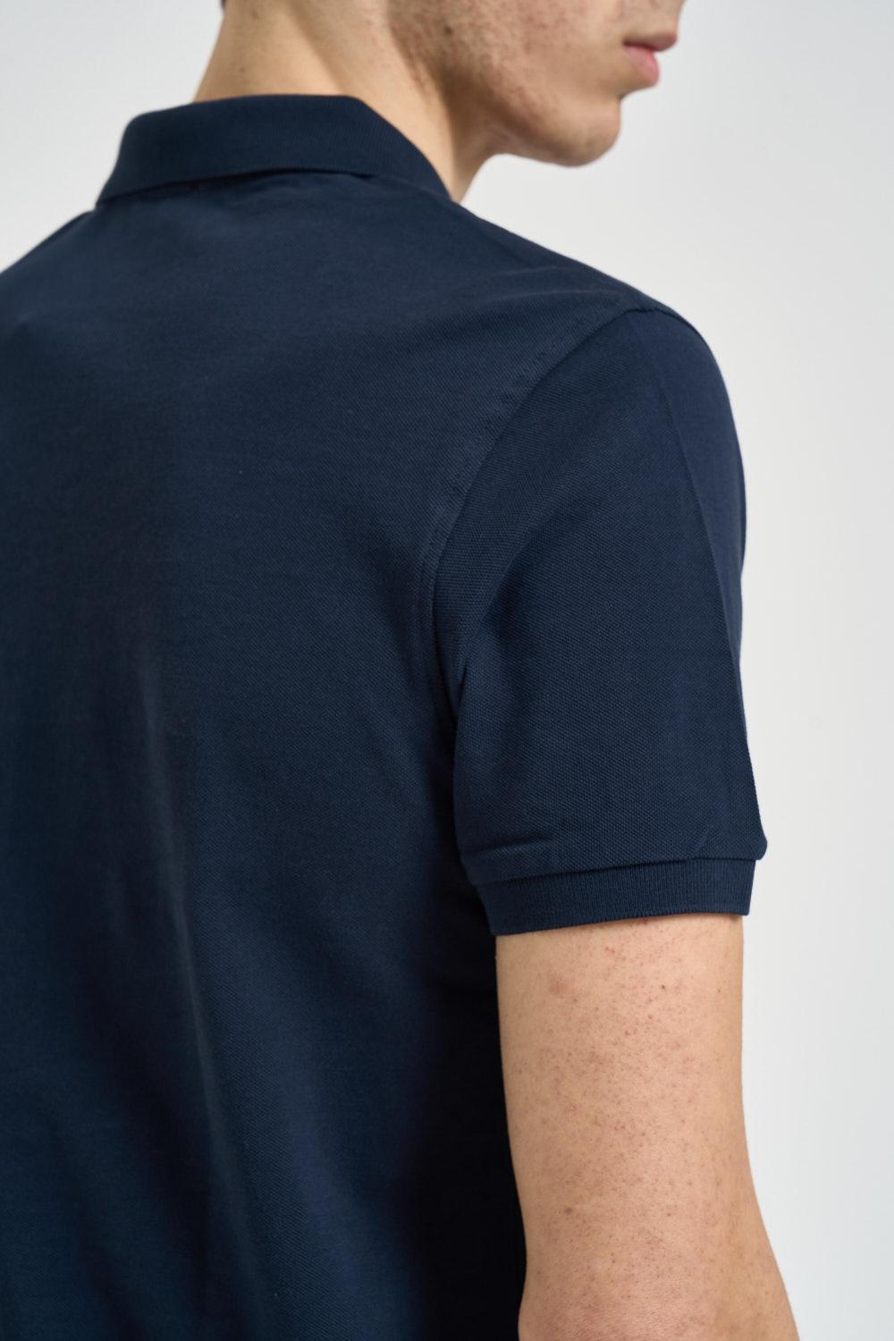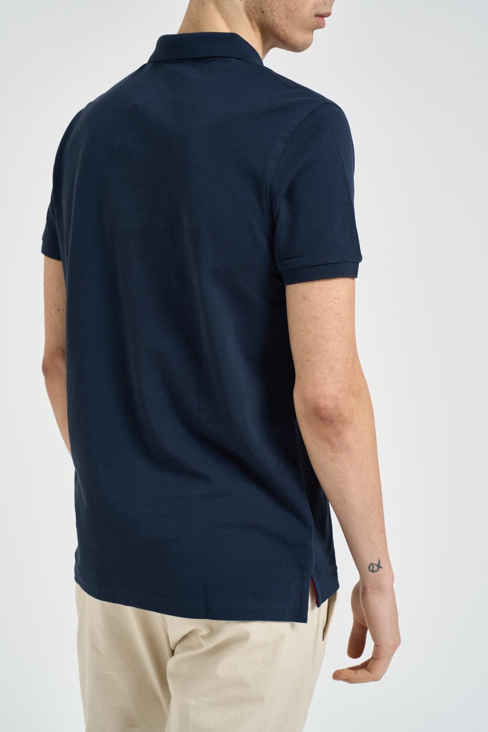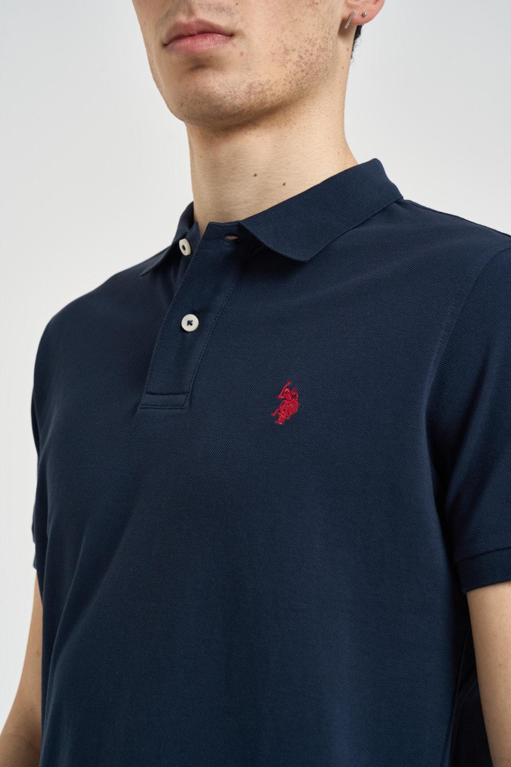 U.S. POLO Polo uomo blu notte. Modello a manica corta classico con colletto a polo e chiusura frontale con bottoni. Realizzata in tessuto piqué di cotone, dettaglio iconico con logo in rosso ricamato a contrasto sul petto. Finiture con colletto e bordo maniche a costine e piccoli spacchi laterali sul fondo. Composizione: 100% cotone. Il modello è alto 190 cm e indossa la taglia L.