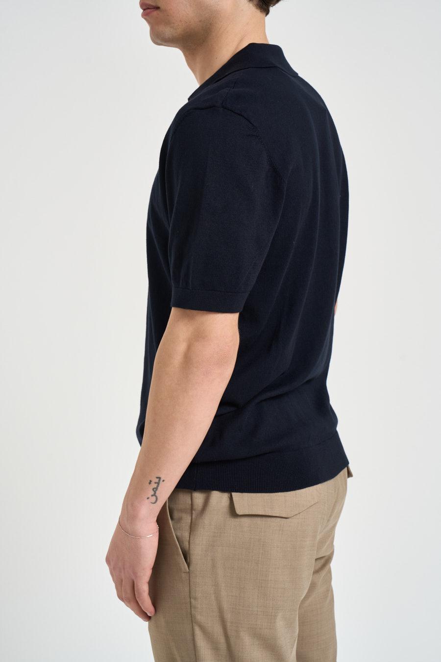 SEINSE Polo uomo in maglia blu notte. Modello con colletto classico e scollo a V senza bottoni, caratterizzato da una vestibilità regolare. Realizzata in tessuto leggero e morbido, rifinito con finiture a costine su maniche e fondo, che valorizzano la linea e migliorano la vestibilità. Composizione: 100% cotone. Il modello è alto 190 cm e indossa la taglia L.
