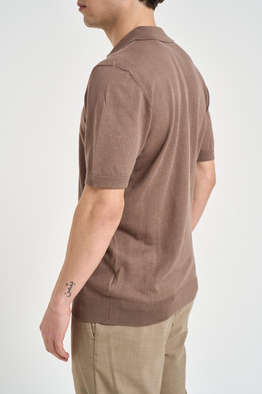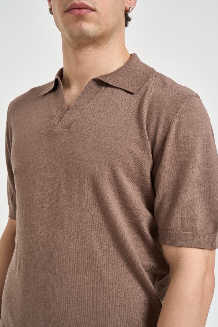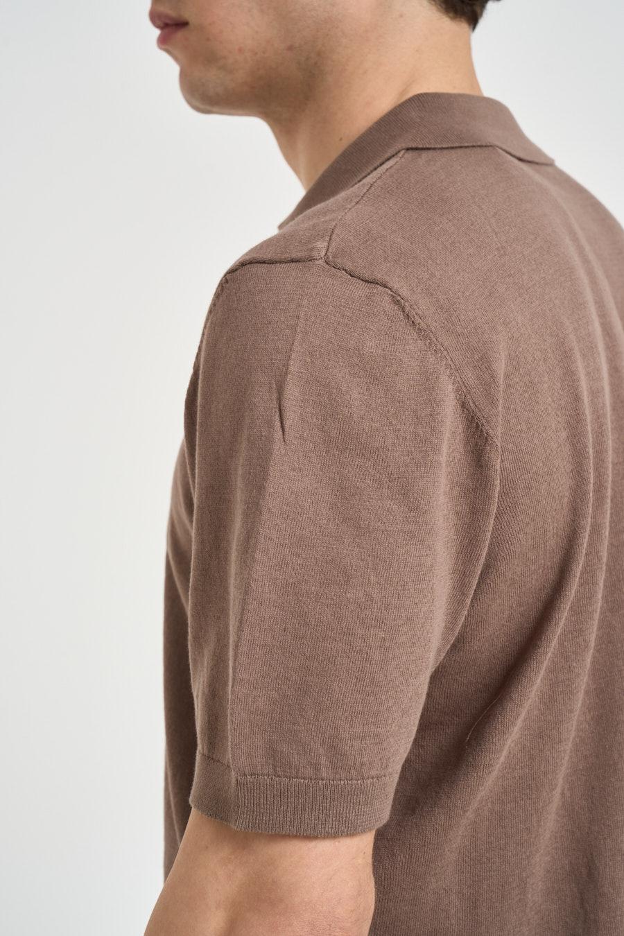 SEINSE Polo uomo in maglia fango. Modello con colletto classico e scollo a V senza bottoni, caratterizzato da una vestibilità regolare. Realizzata in tessuto leggero e morbido, rifinito con finiture a costine su maniche e fondo, che valorizzano la linea e migliorano la vestibilità. Composizione: 100% cotone. Il modello è alto 190 cm e indossa la taglia L.