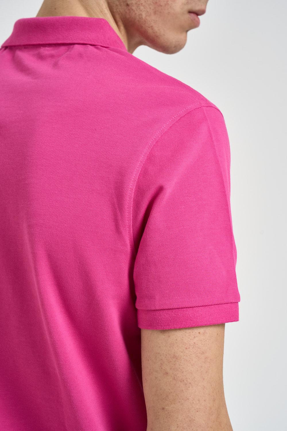 U.S. POLO Polo uomo rosa fuxia. Modello a manica corta classico con colletto a polo e chiusura frontale con bottoni. Realizzata in tessuto piqué di cotone, dettaglio iconico con logo in blu ricamato a contrasto sul petto. Finiture con colletto e bordo maniche a costine e piccoli spacchi laterali sul fondo. Composizione: 100% cotone. Il modello è alto 190 cm e indossa la taglia L.
