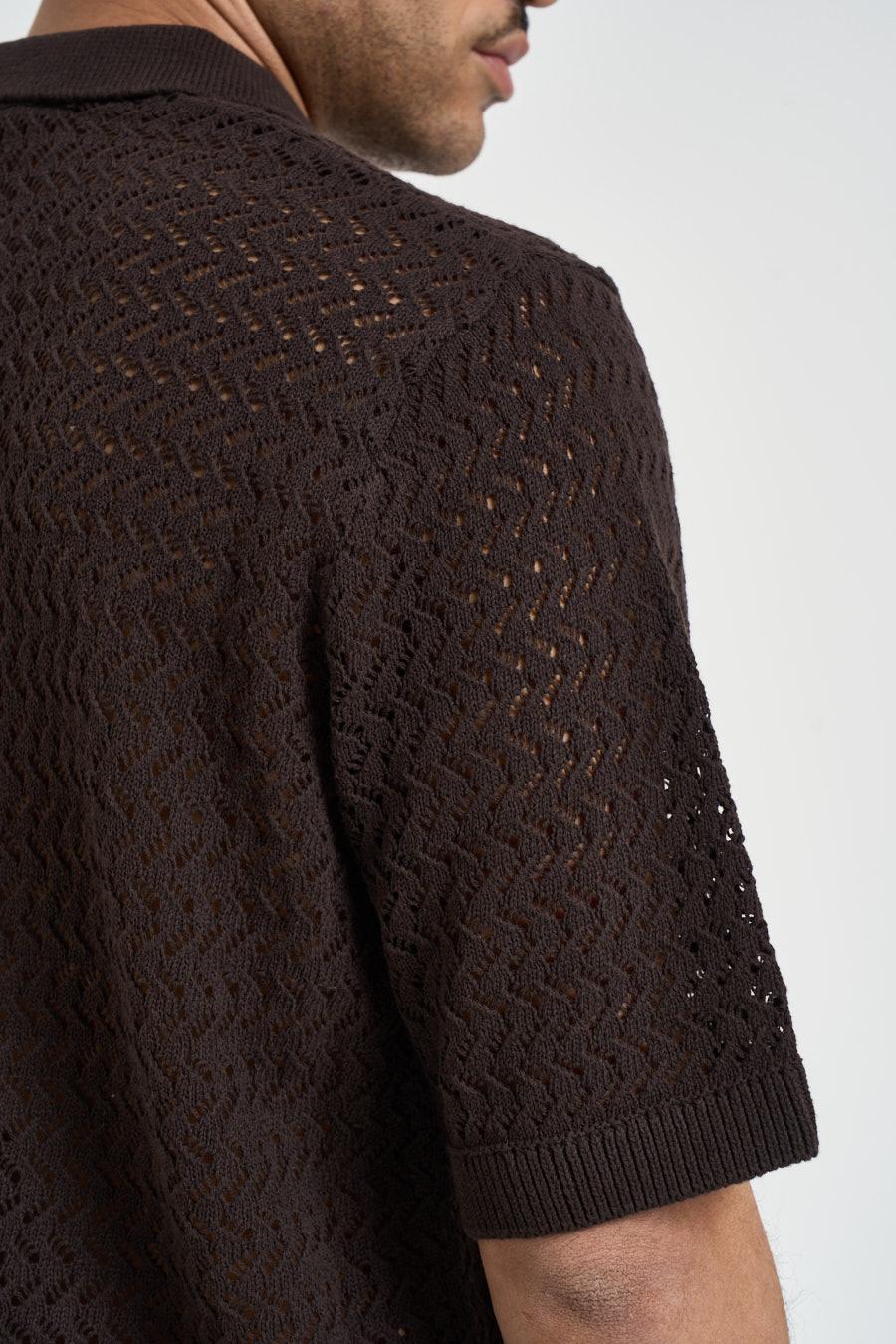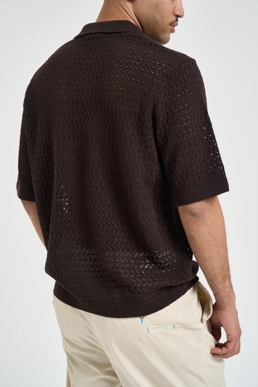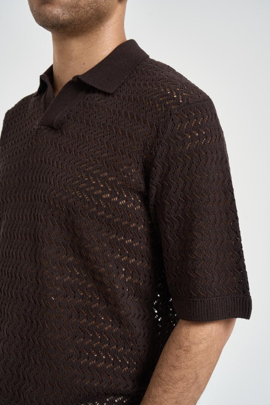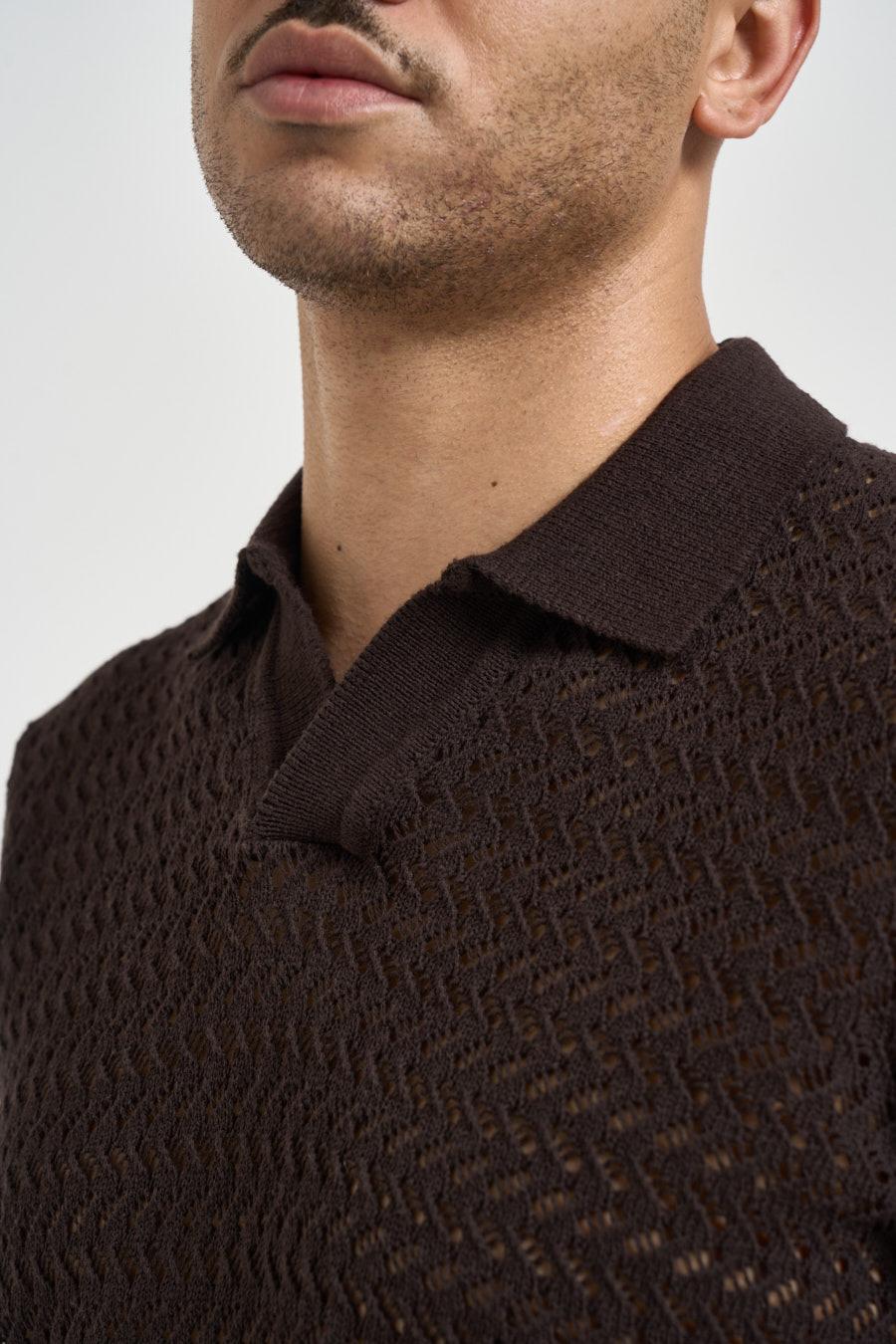 ONLY&SONS Polo uomo traforata marrone. Modello regular fit, a manica corta, scollo a V. Composizione: 70% cotone 30% poliestere. Il modello è alto 183cm e indossa la taglia L.