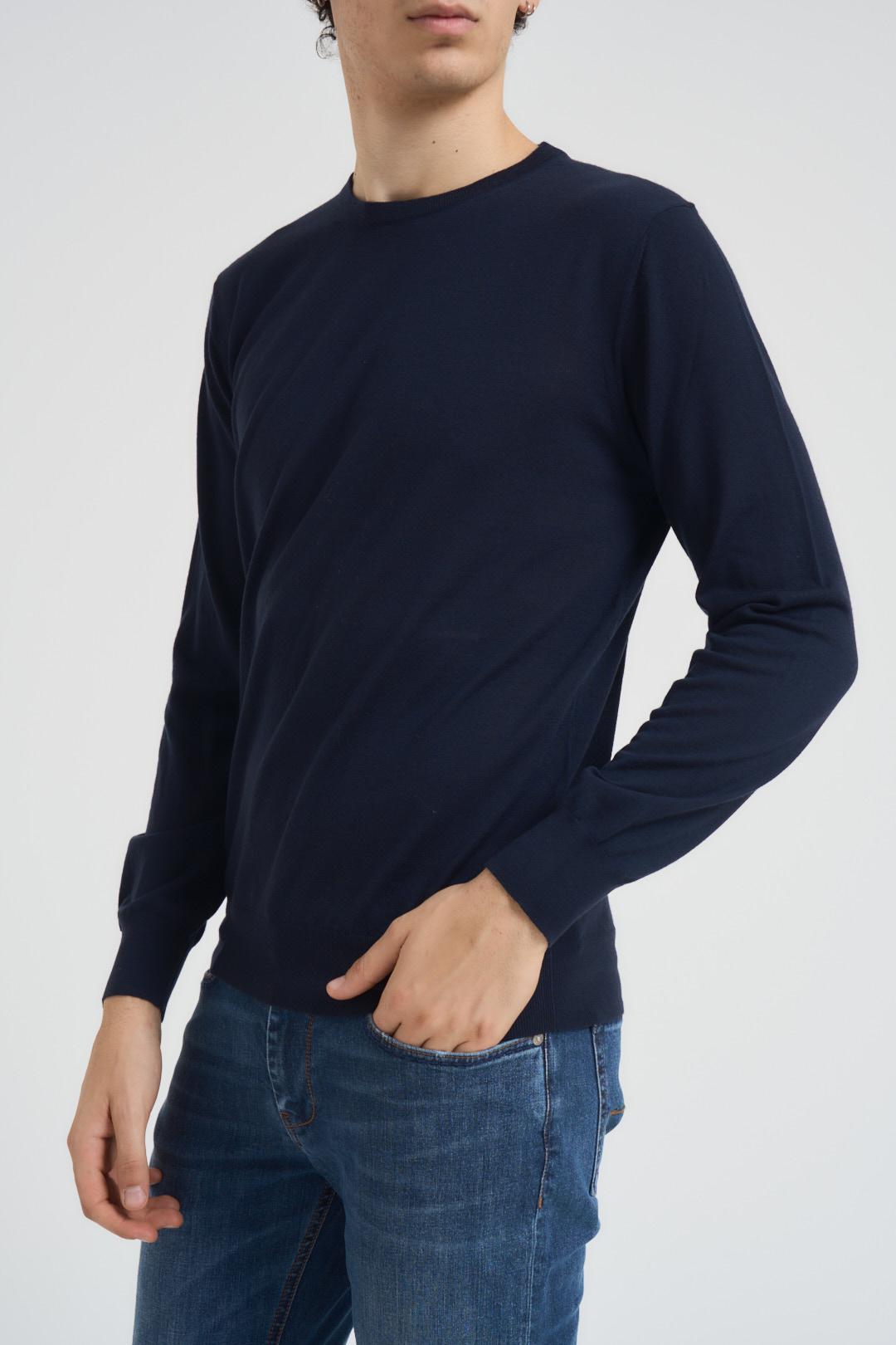 KANGRA Pullover basic uomo. Modello con collo tondo, maniche lunghe. Composizione: 100% cotone. Colore: blu. Il modello è alto 190 cm e indossa la tg 48.