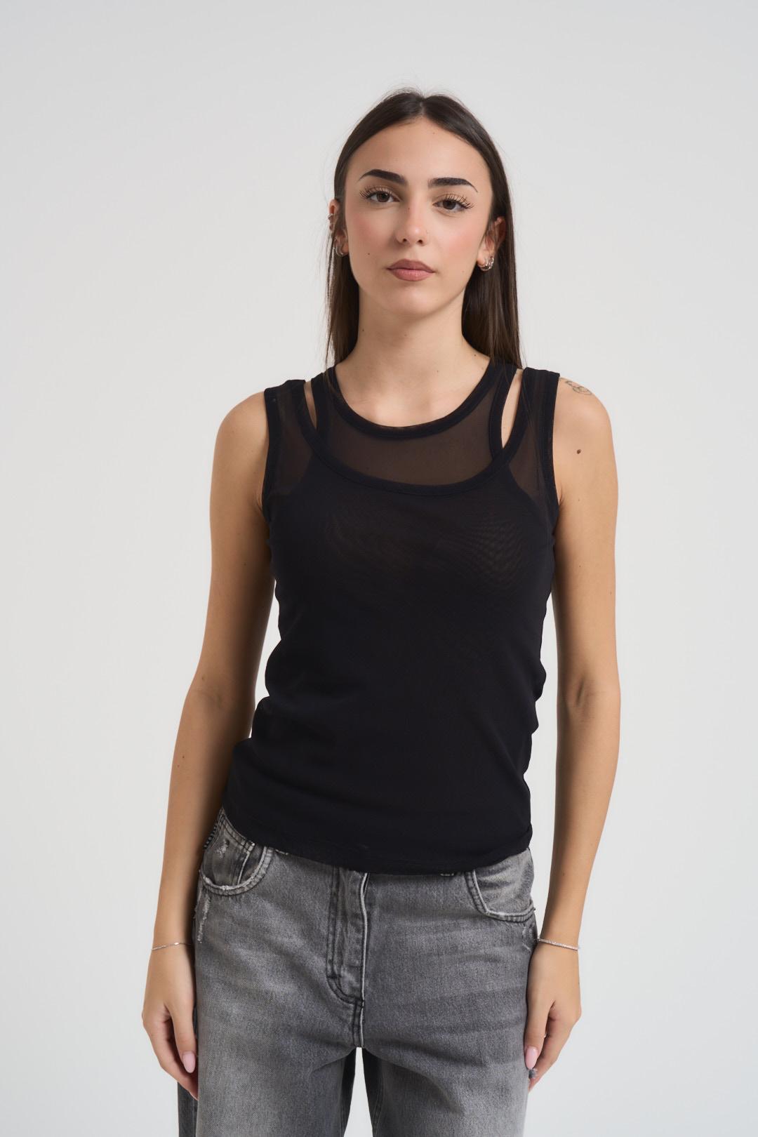 SOUVENIR CLUBBING T-shirt donna girocollo nera. Modello senza manica con doppio tessuto trasparente sul collo. Composizione: cotone. La modella è alta 172 cm e indossa la taglia S.