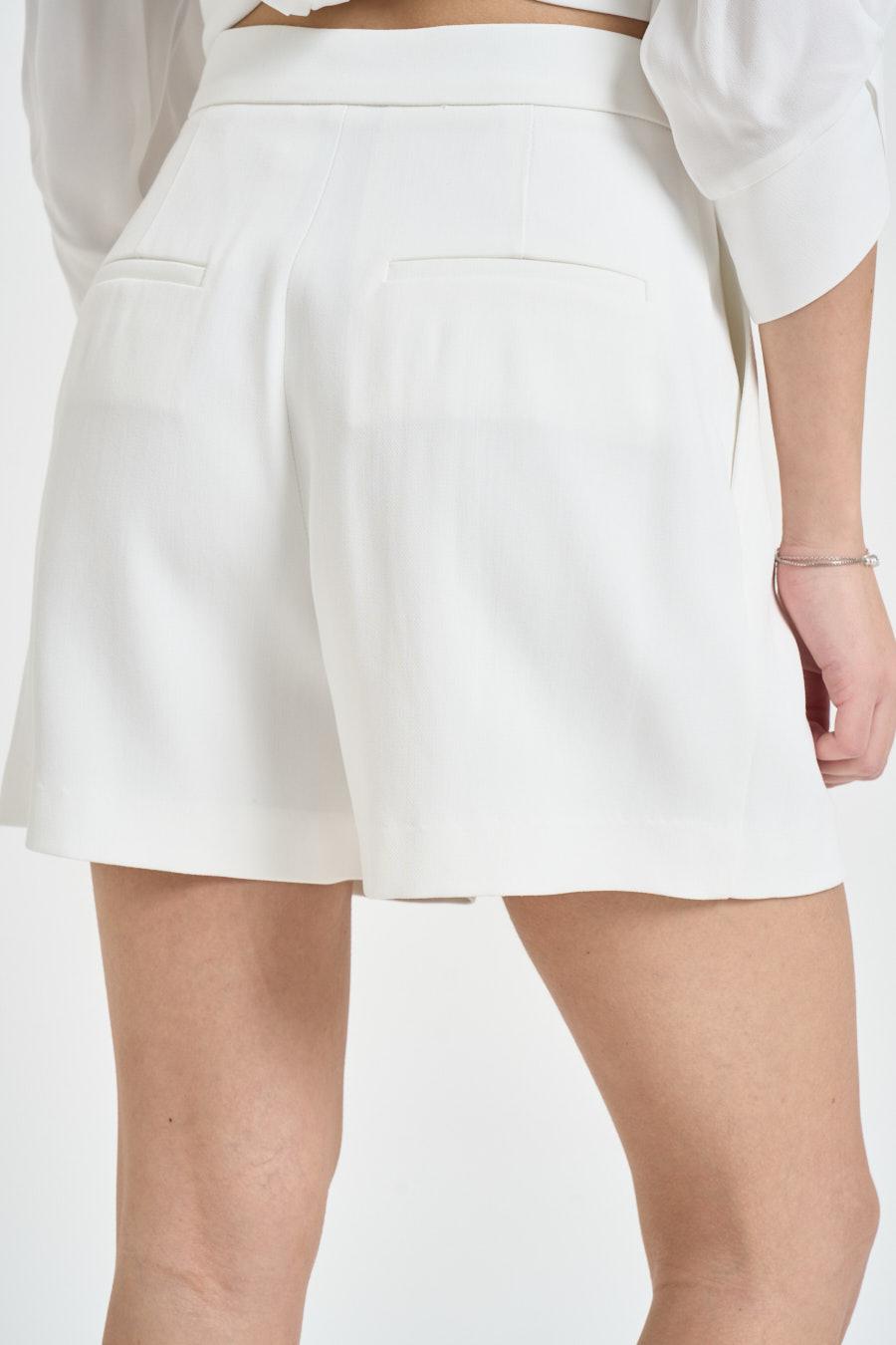 ELISABETTA FRANCHI Short donna con catena bianco. Modello regular fit. Pinces. Composizione: 98% viscosa, 2% elastan. Fodera tasche: 100% cotone. La modella è alta 172 cm e indossa la taglia 40.
