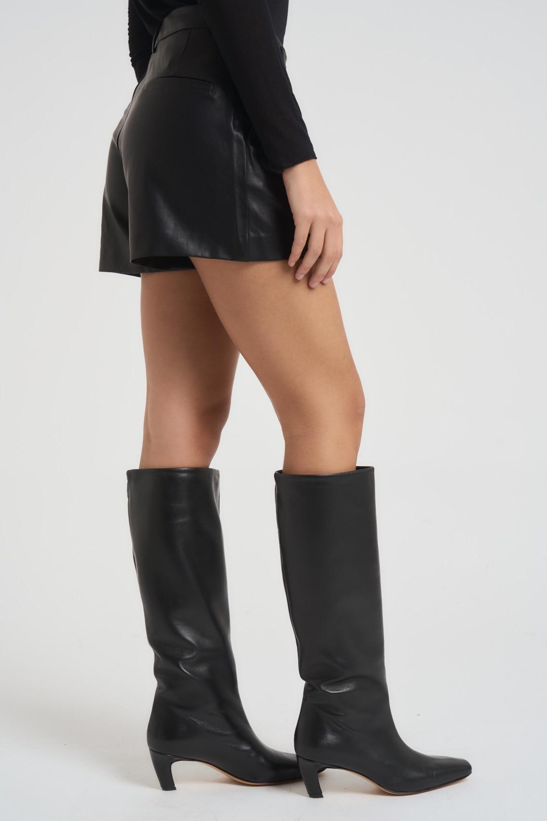 GRACE AND MILA Short donna in ecopelle nero. Modello con chiusura frontale con zip e bottone. Tasche all'italiana sul davanti. Tasche con finto filetto sul retro. Passanti in vita. Composizione: 45% Poliestere, 55% Viscosa. La modella è alta 172 cm e indossa la taglia S.