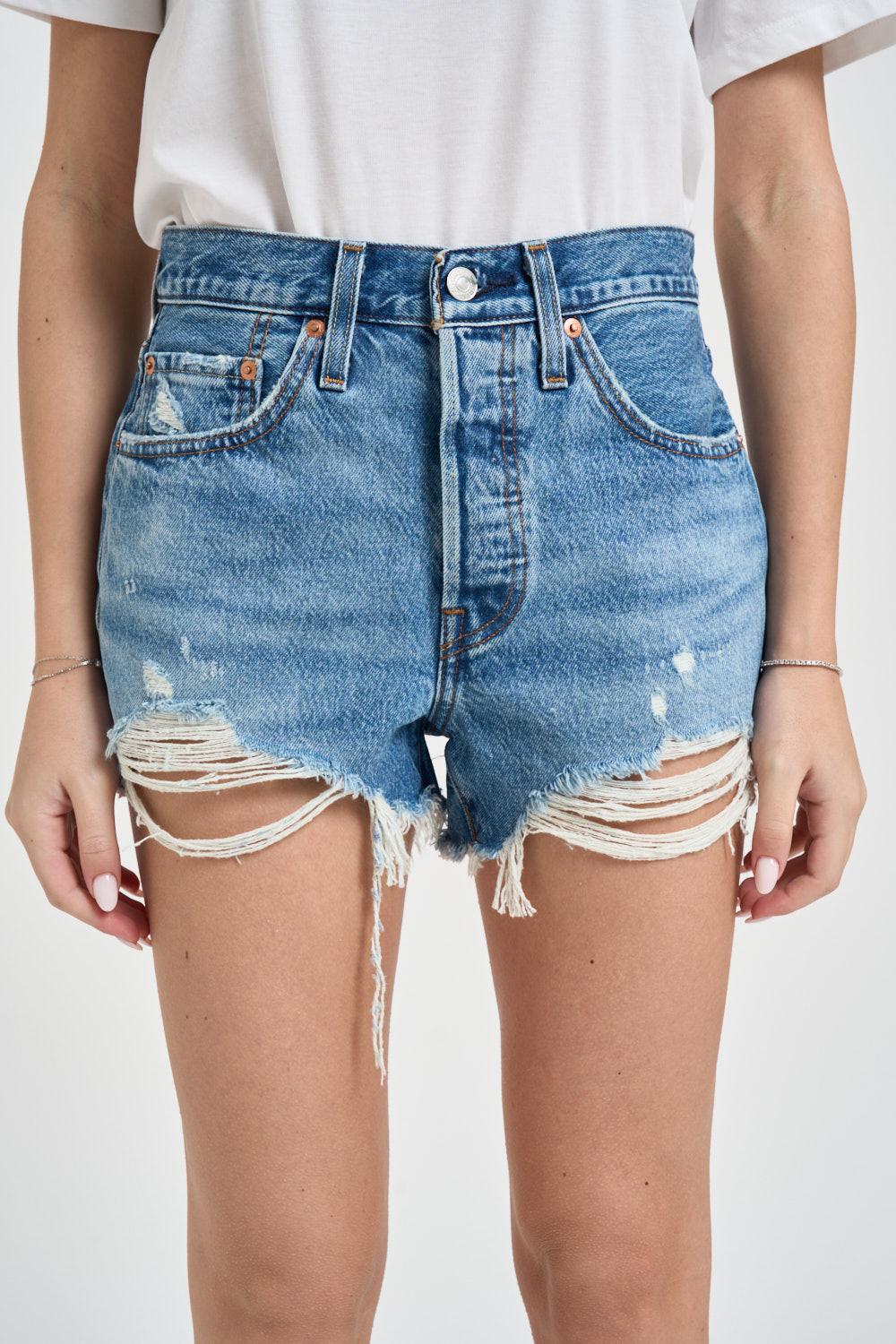 LEVI'S Shorts donna 501 in denim blu. Modello a 5 tasche con patta e bottoni. Composizione: 100% cotone. La modella è alta 176cm e indossa la taglia 26.