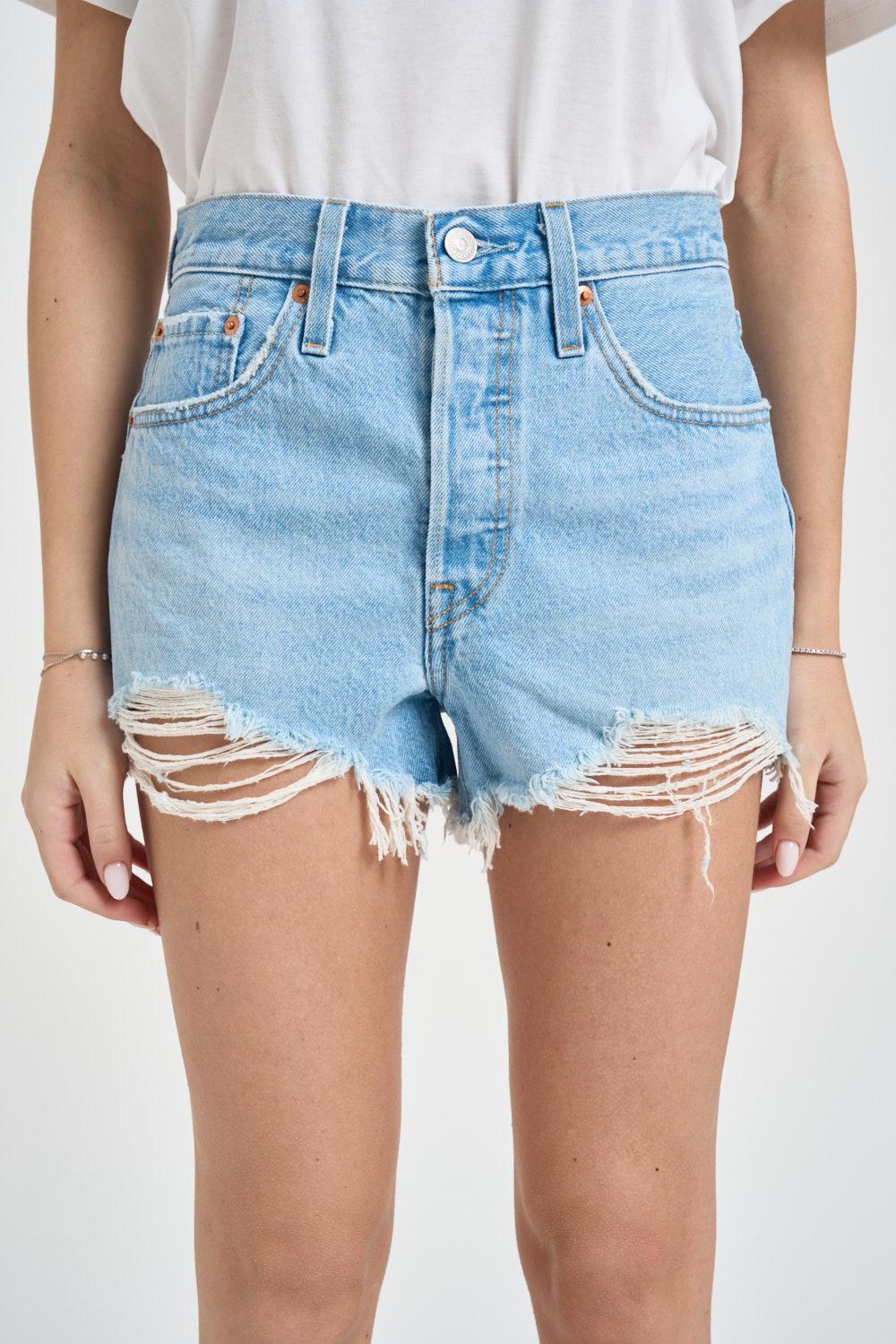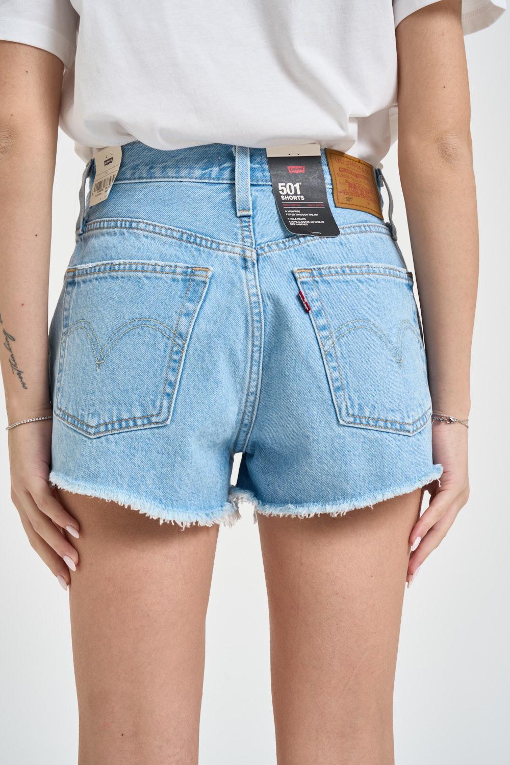 LEVI'S Shorts donna 501 in denim chiaro. Modello a 5 tasche con patta e bottoni. Composizione: 100% cotone. La modella è alta 176cm e indossa la taglia 26.