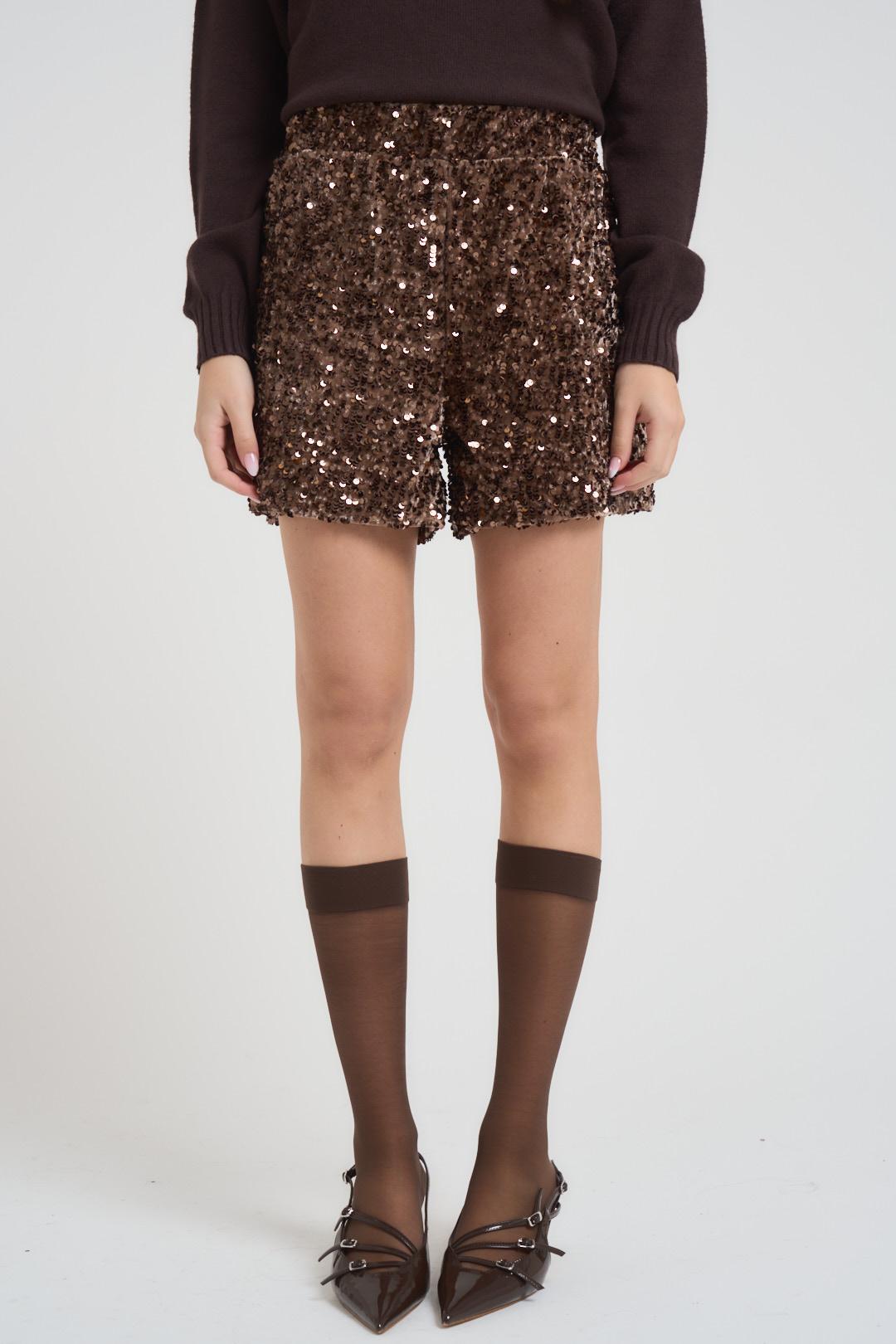 ONLY Shorts donna con paillettes bronzo. Modello con paillettes e velluto beige, elastico in vita, regular fit. Composizione: 50% Poliestere riciclato, 45% Poliestere, 5% Elastan. La modella è alta 172 cm e indossa la taglia S.