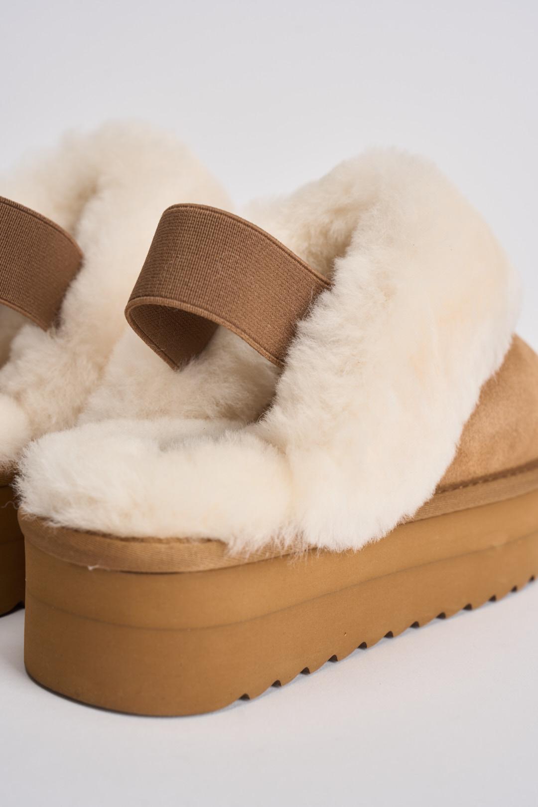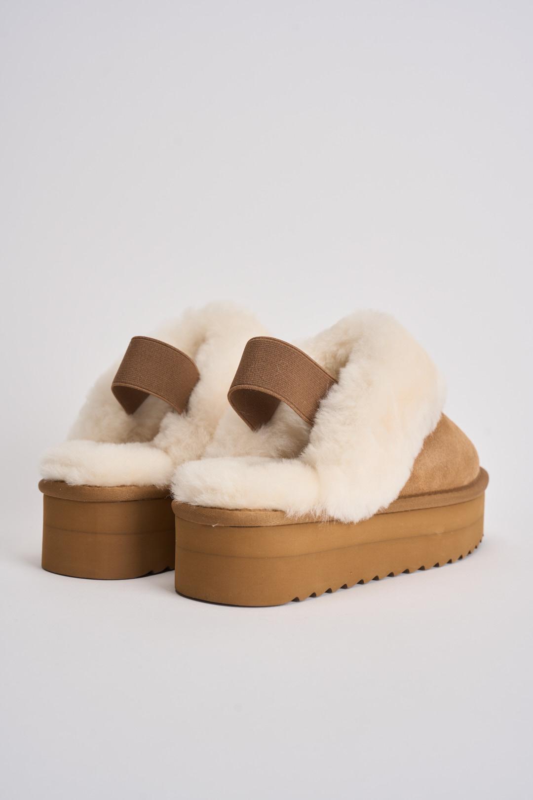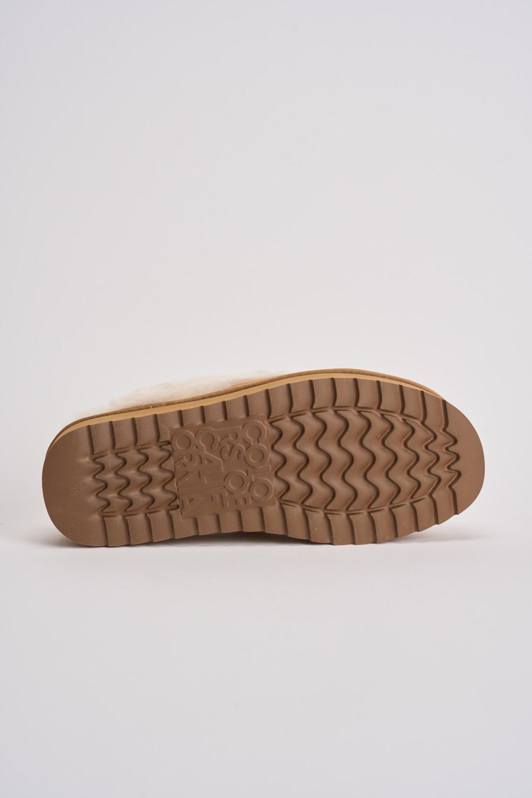 COLORS OF CALIFORNIA Slipper donna platform cammello. Modello con laccio elastico alla caviglia. Suola platform interamente in pelle scamosciata. Il soletto e il bordo superiore in soffice pelo. Tomaia 100% in pelle scamosciata. Fodera: 100% Poliestere. Sottopiede: 100% Poliestere. Suola: 100% EVA. Altezza tacco: 3 cm davanti e 3 cm dietro. Logo sul retro. Calzata regolare.