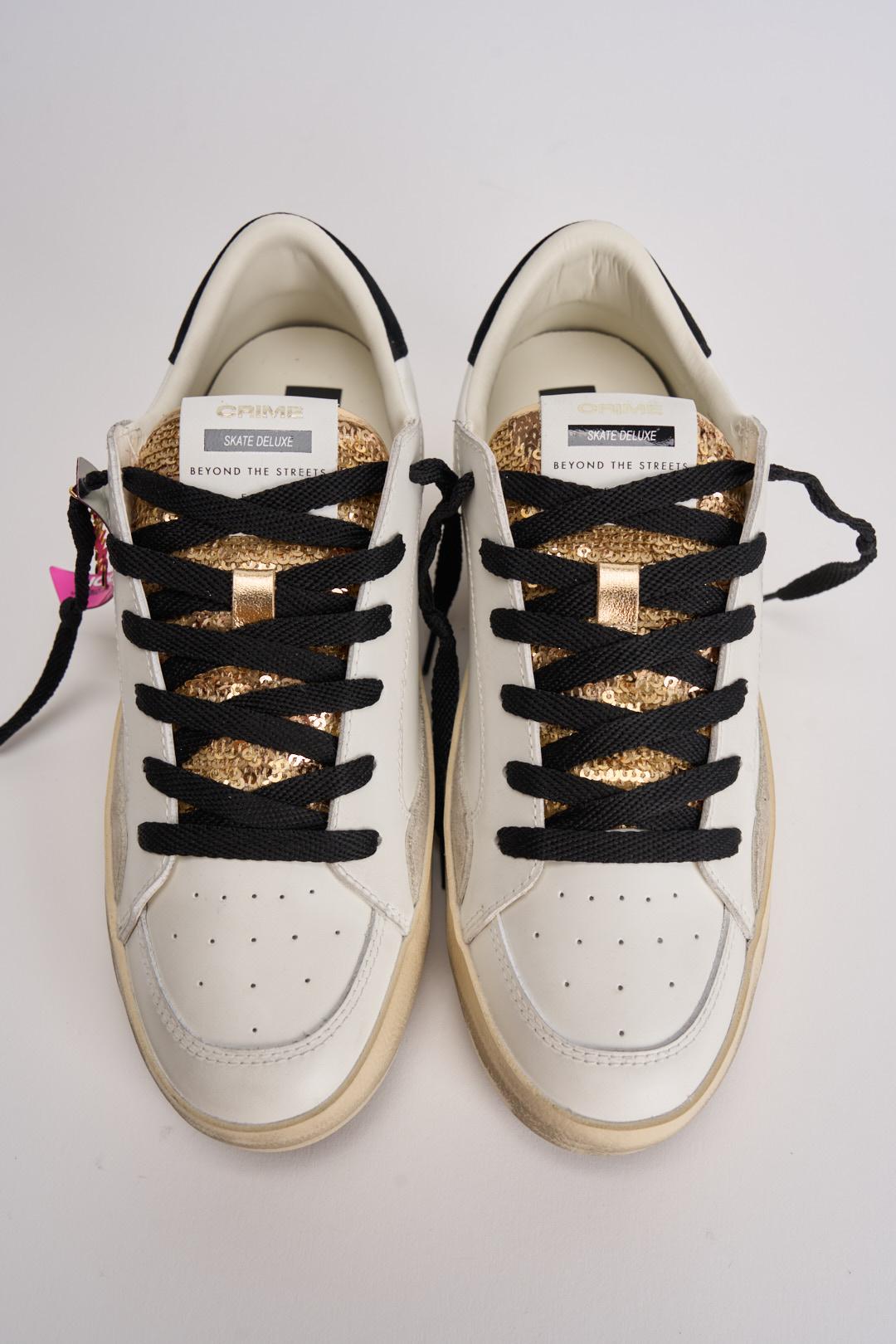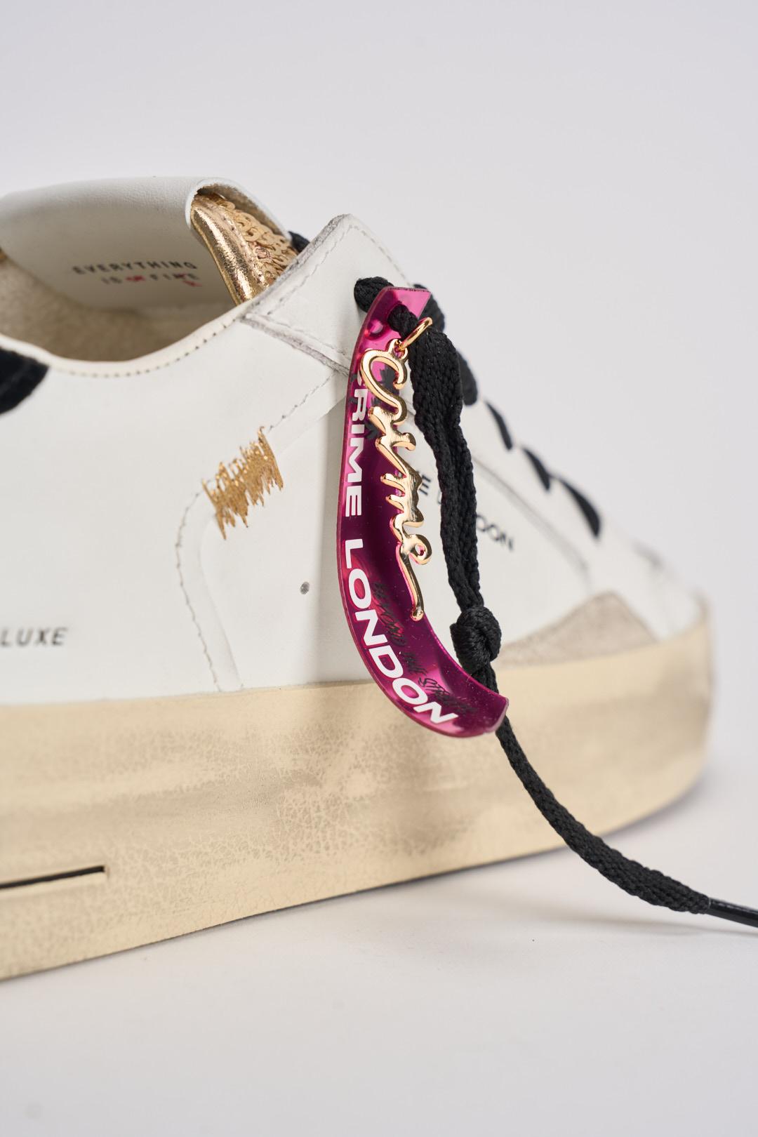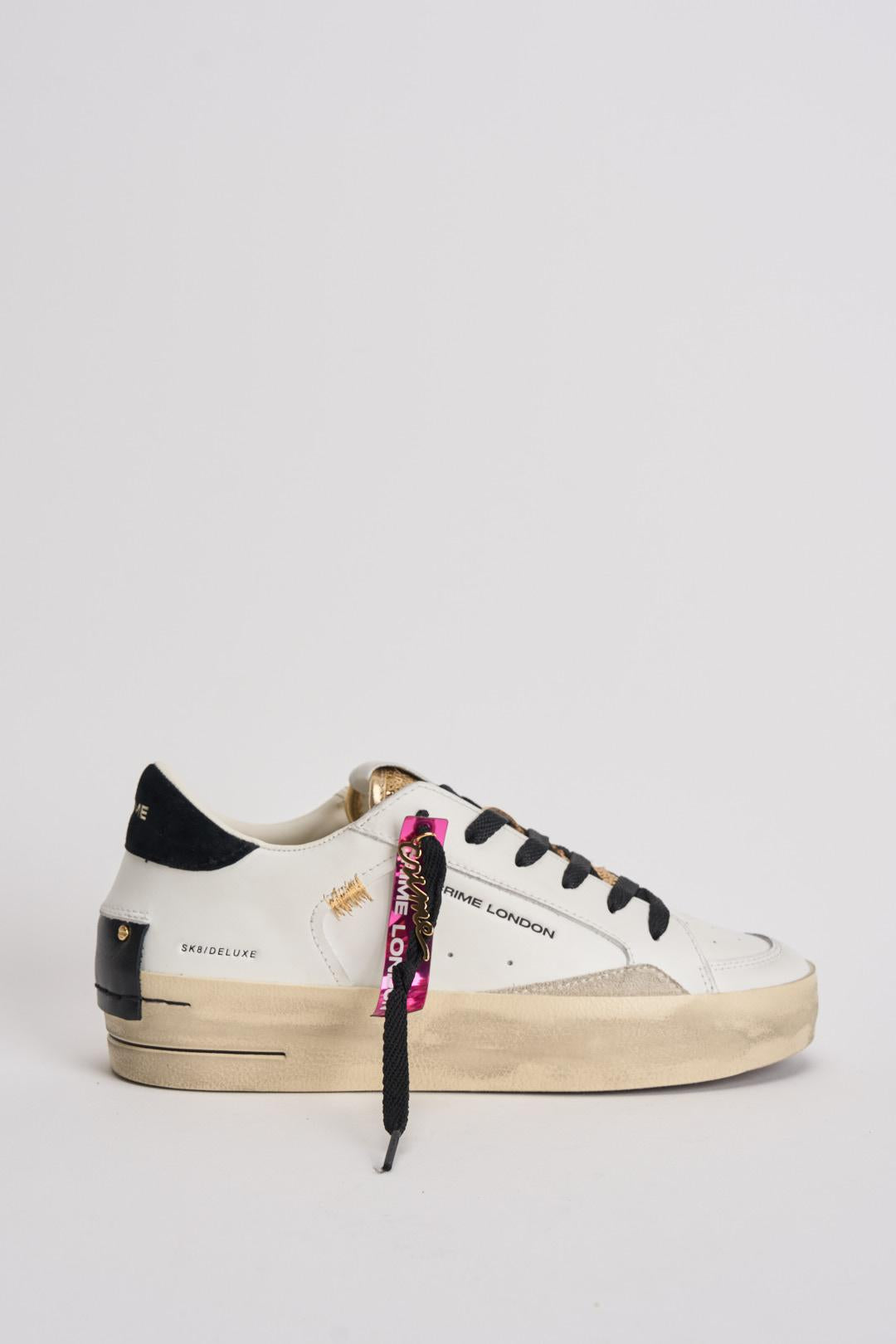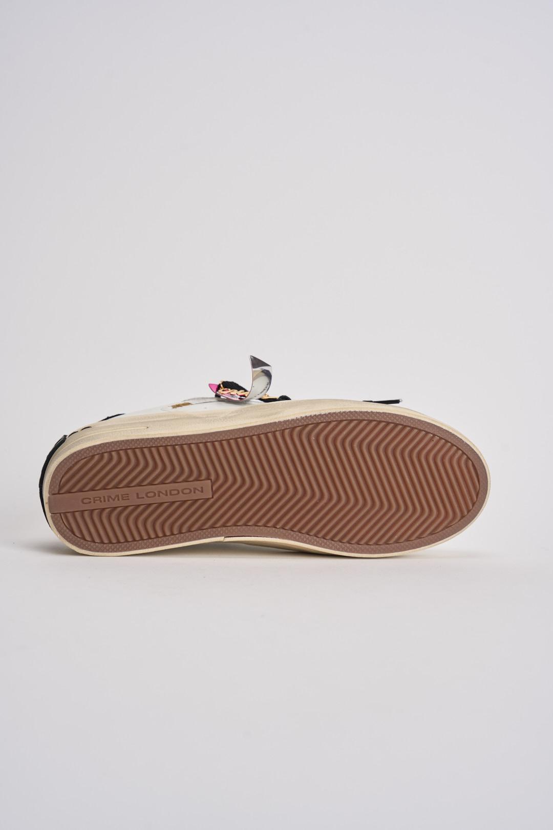 CRIME LONDON Sneakers donna bianca e nera. Modello in pelle con dettaglio paillettes sulla linguetta e rifinitura in suee laterali. Fondo in gomma e soletta estraibile. Talloncino nero con label logata e tag specchiato fuxia. Composizione: pelle. Calzata regolare.