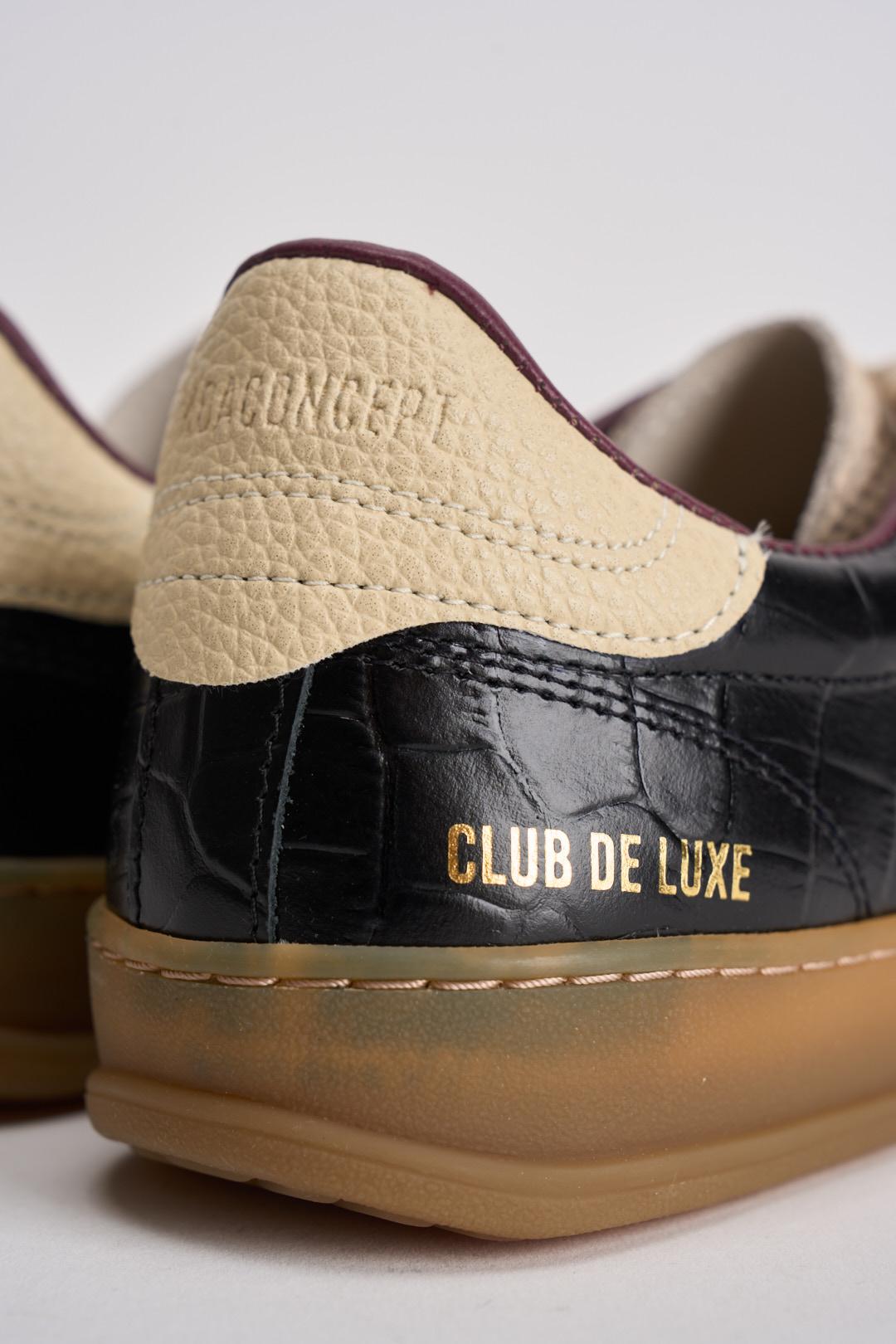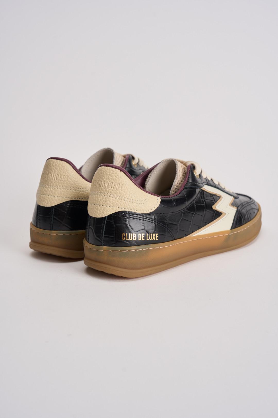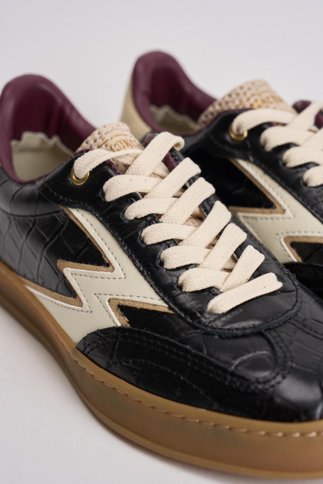 MOA Sneakers donna coccodrillo marroni. Modello in pelle stampa coccodrillo con linguetta in pelle traforata bianca, talloncino in pelle martellata color burro e collarino in pelle bordeaux. Logo in pelle bianco laterale. Suola alta 3,4 cm, lacci in cotone bianco. Calzata regolare.