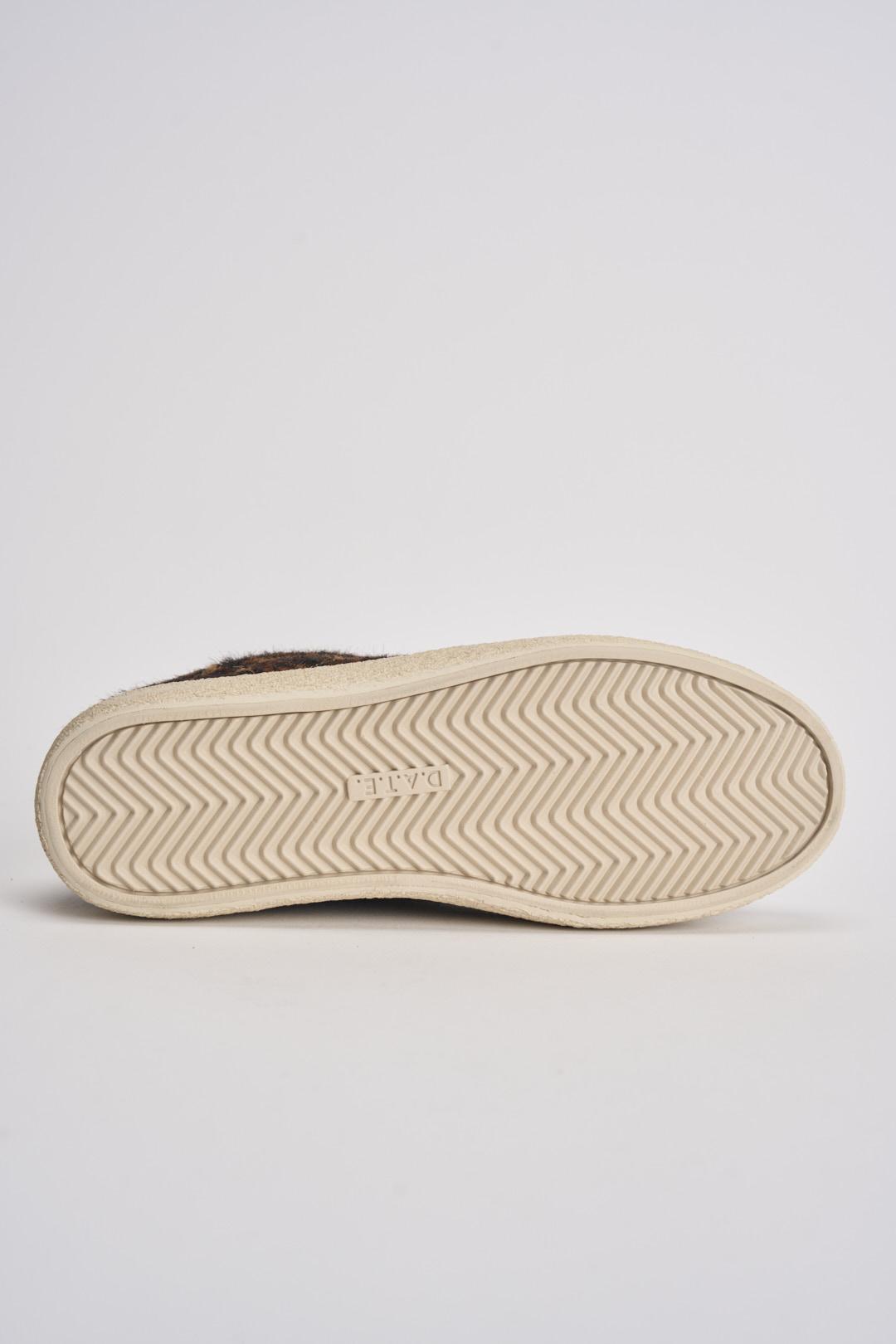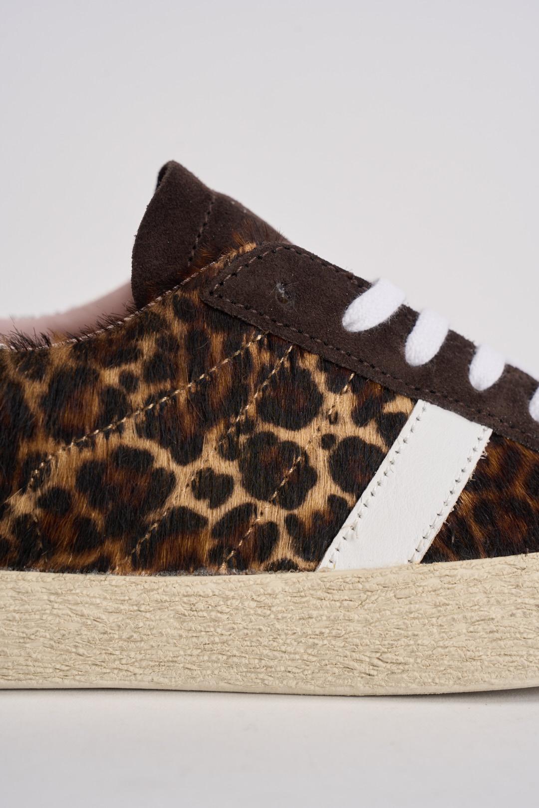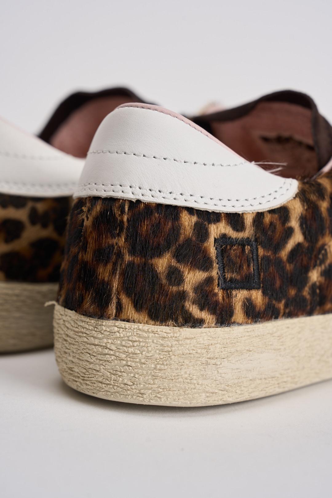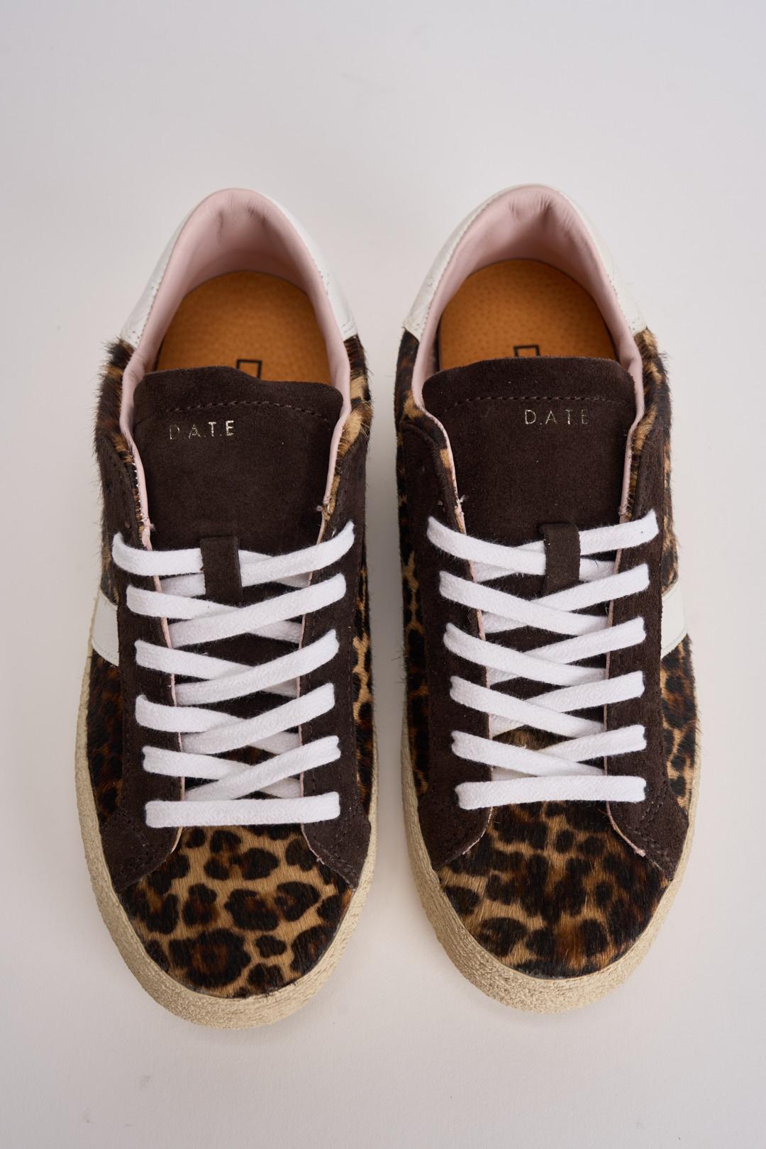 D.A.T.E Sneakers donna Hill Low leopardate. Modello in cavallino con stampa animalier marrone, linguetta in suede con scritta D.A.T.E. impressa, lacci in cotone, logo quadrato ricamato lateralmente. Banda e talloncino posteriore in pelle bianca, fodera in pelle e spugna di cotone. Soletta interna rialzata di 2,5 cm e suola in gomma alta 2,5 cm. Calzata regolare.