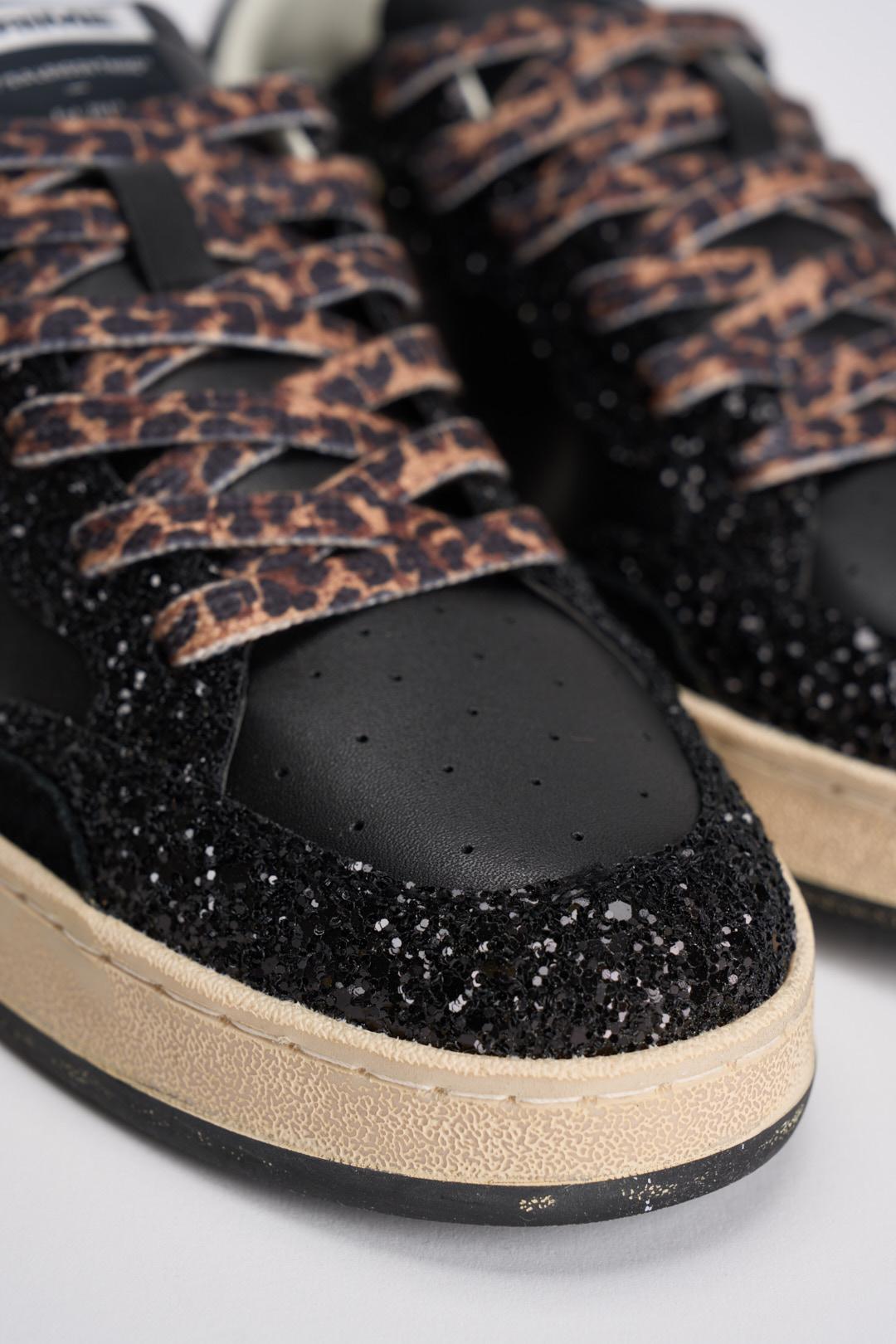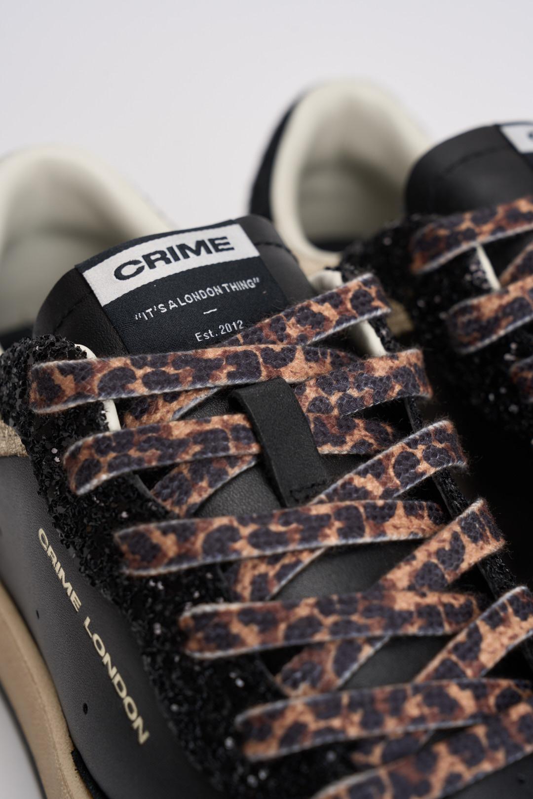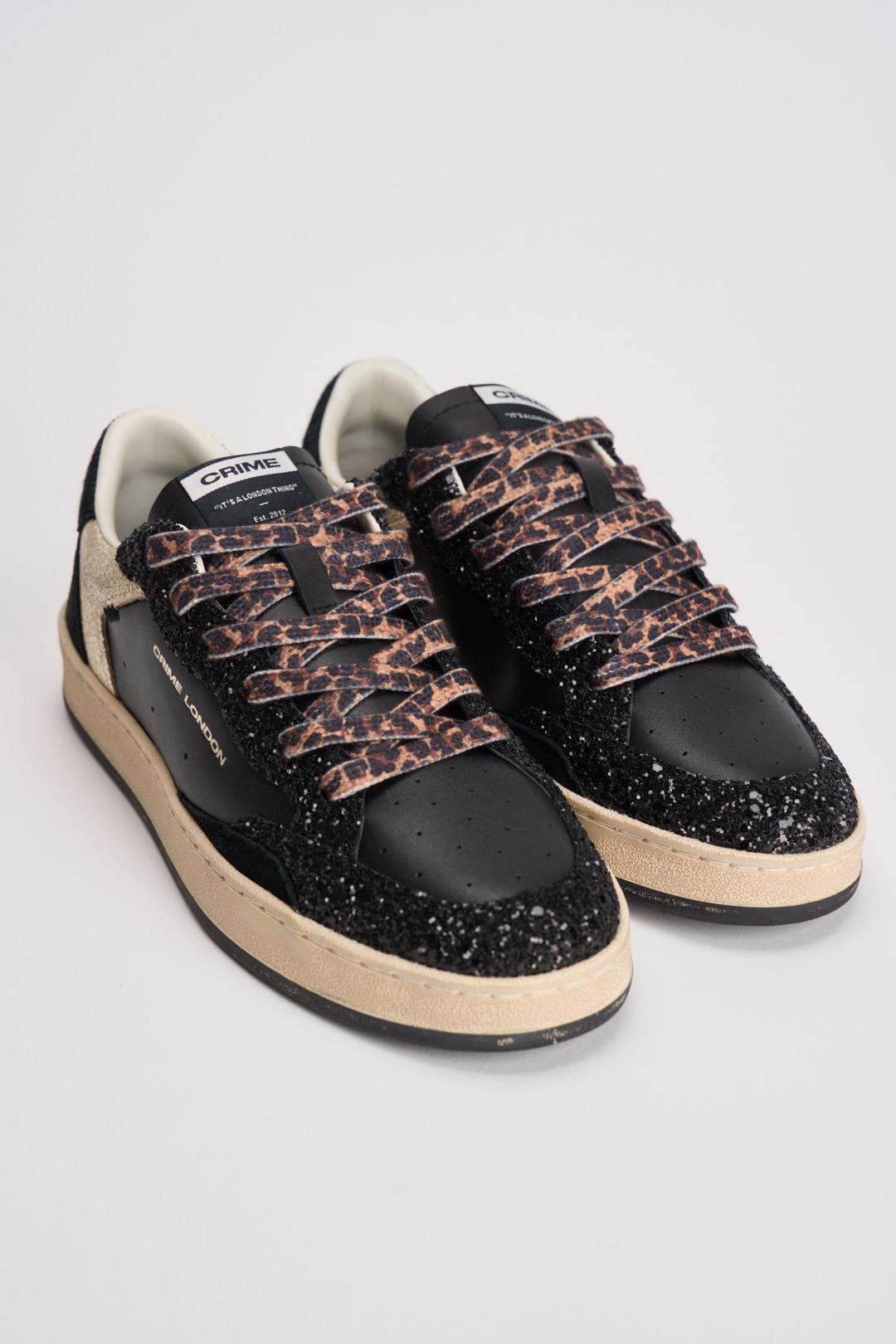CRIME LONDON Sneakers donna in pelle e glitter nera. Modello con tomaia in pelle e glitter nero, talloncino in cavallino nero e tallone in suede nero con logo. Inserto in suede spalmato oro laterale. Linguetta in pelle nero con label logata in tessuto. Effetto vintage. Calzata regolare.